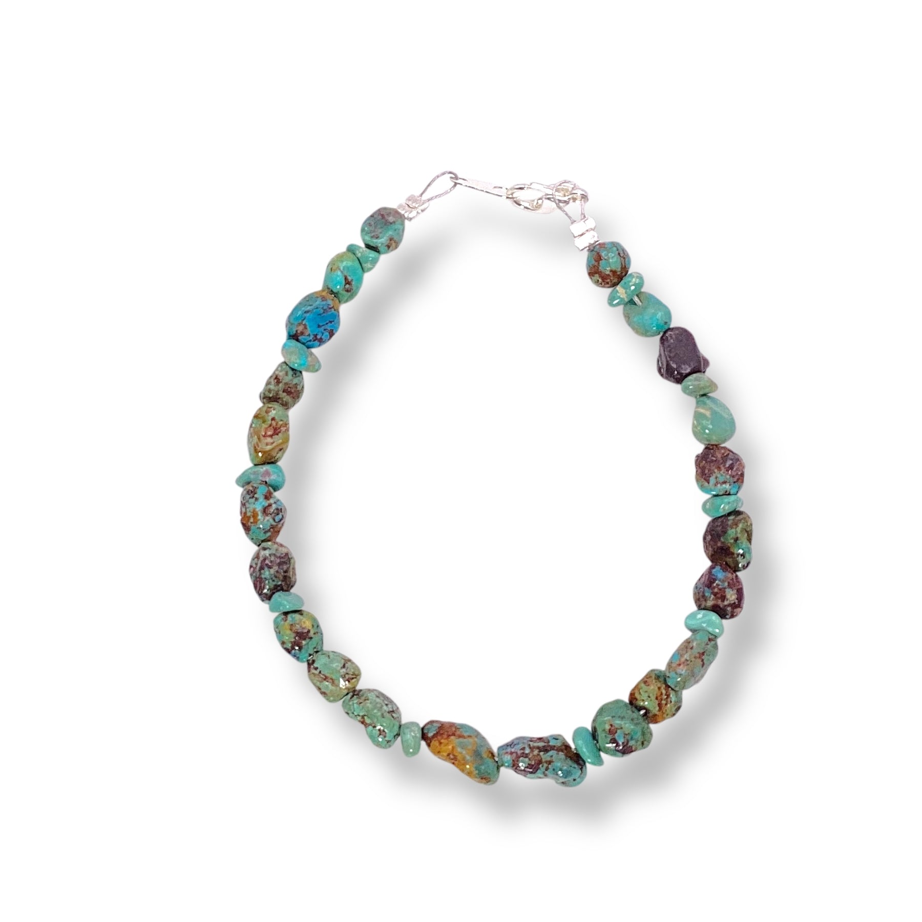 This turquoise beaded bracelet by Santo Domingo artist Fannie Garcia blends earthy and sky-blue tones for a delicate, eye-catching look.