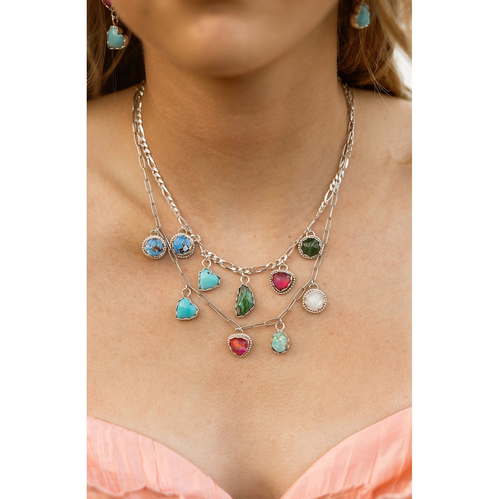 Why We 🖤: This necklace is one of a kind and absolutely magical with pink tourmaline stone, Royston turquoise, Blue Golden Hills turquoise, exotic jade, and other hand set stones that truly jingle jangle in the most lovely of ways. ❤️