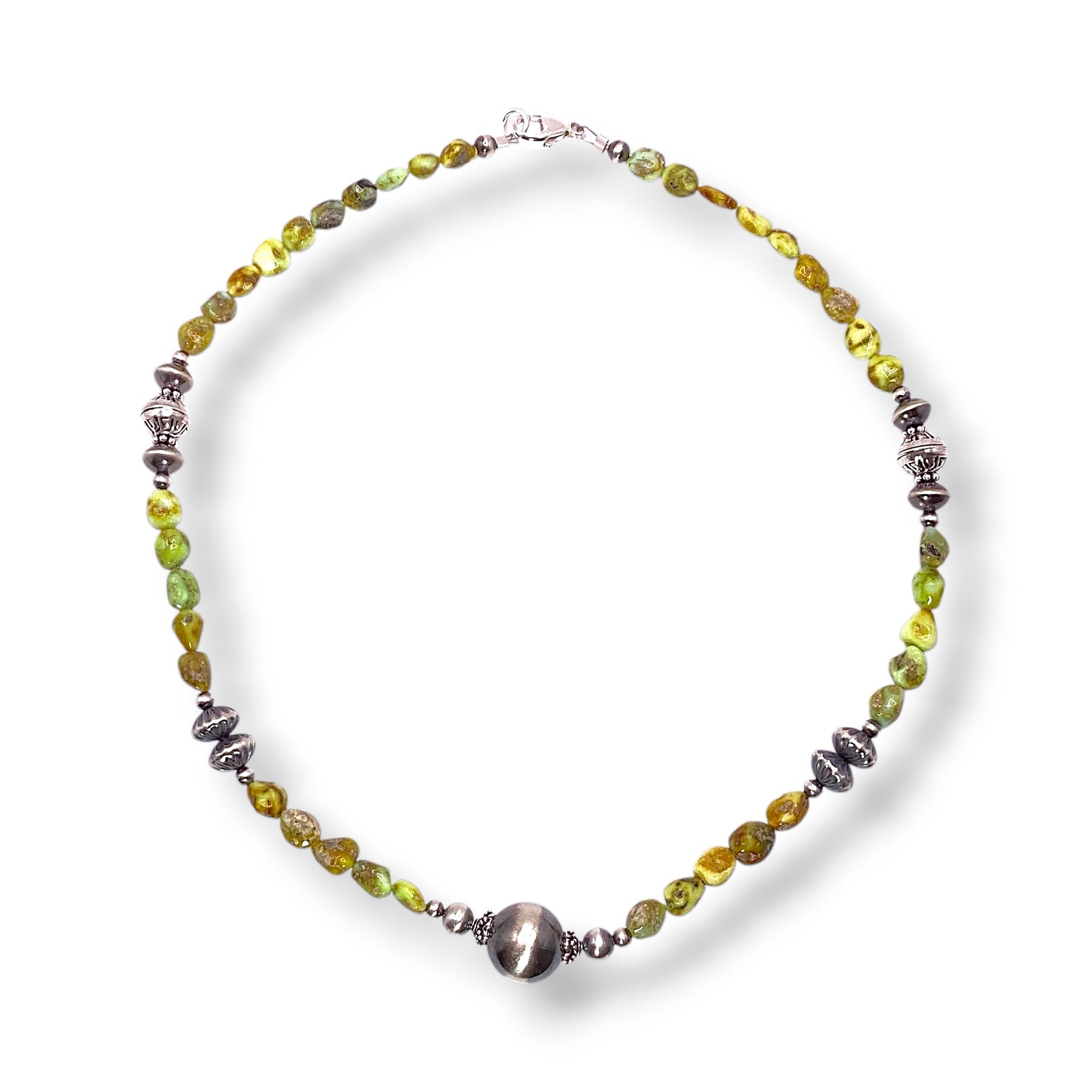Bright, joyful, and full of Southwestern charm — this handmade Palomino Turquoise and Sterling Silver beaded necklace brings a playful pop of color to any outfit. Each stone shines with its own golden-green hue, strung together with a free-spirited touch that feels made for sunshine days and desert adventures.