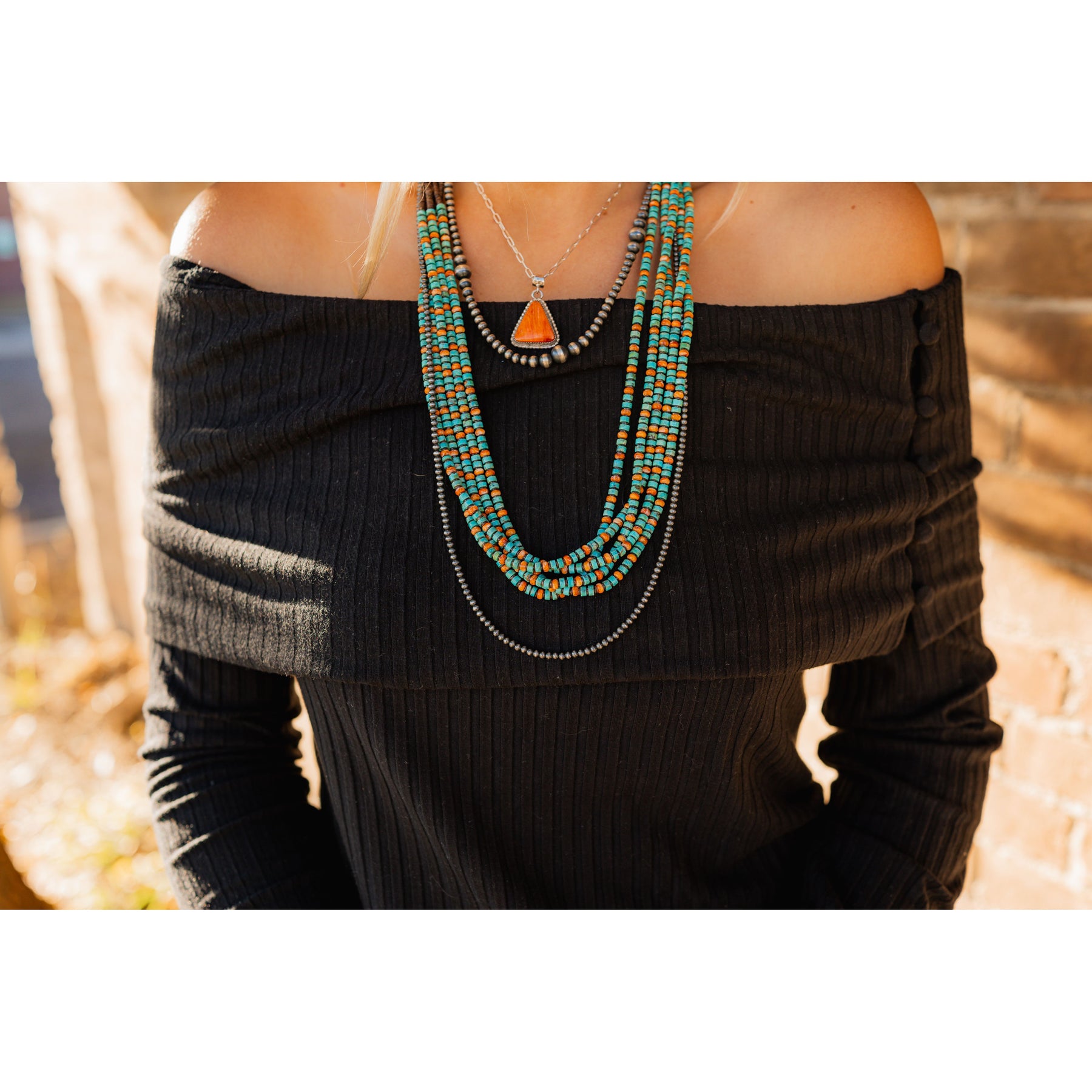 Exquisitely handcrafted by Santo Domingo artist Fannie Garcia, this five-strand necklace features a harmonious blend of turquoise, spiny oyster shell, and heishi beads. Its delicate layers create a refined, eye-catching statement with a subtle Southwestern elegance.