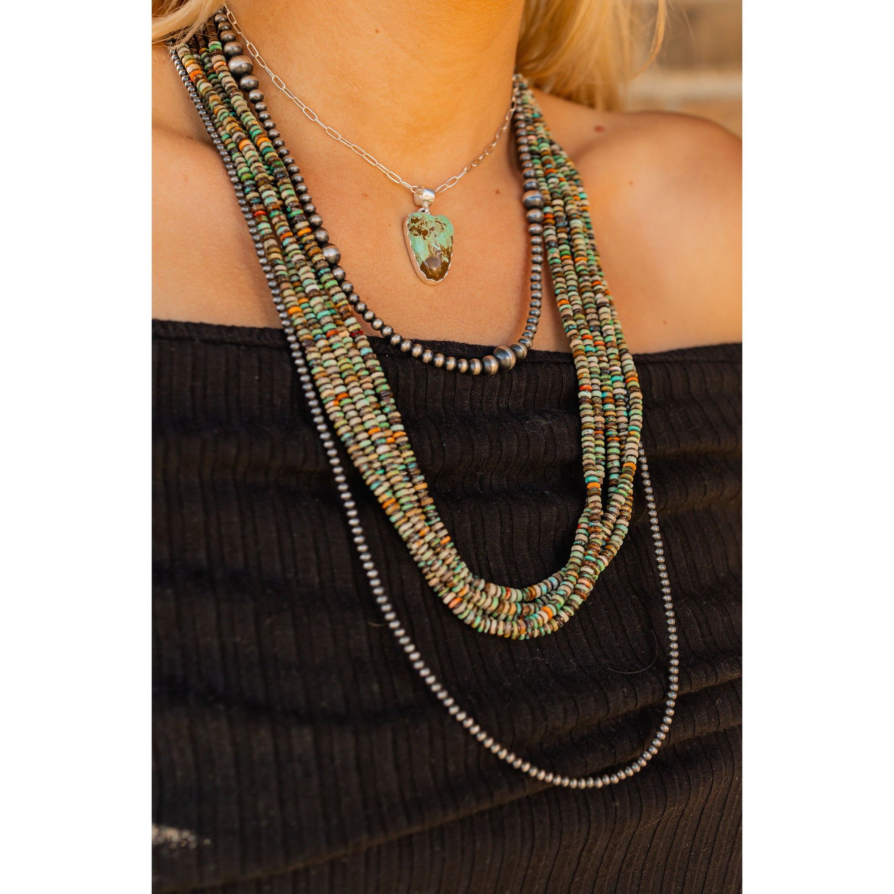 Playful and vibrant, this five-strand necklace is a mix of turquoise, spiny oyster shell, and heishi beads, handcrafted by Santo Domingo artist Fannie Garcia. Each strand dances with color and texture, bringing life to any outfit.