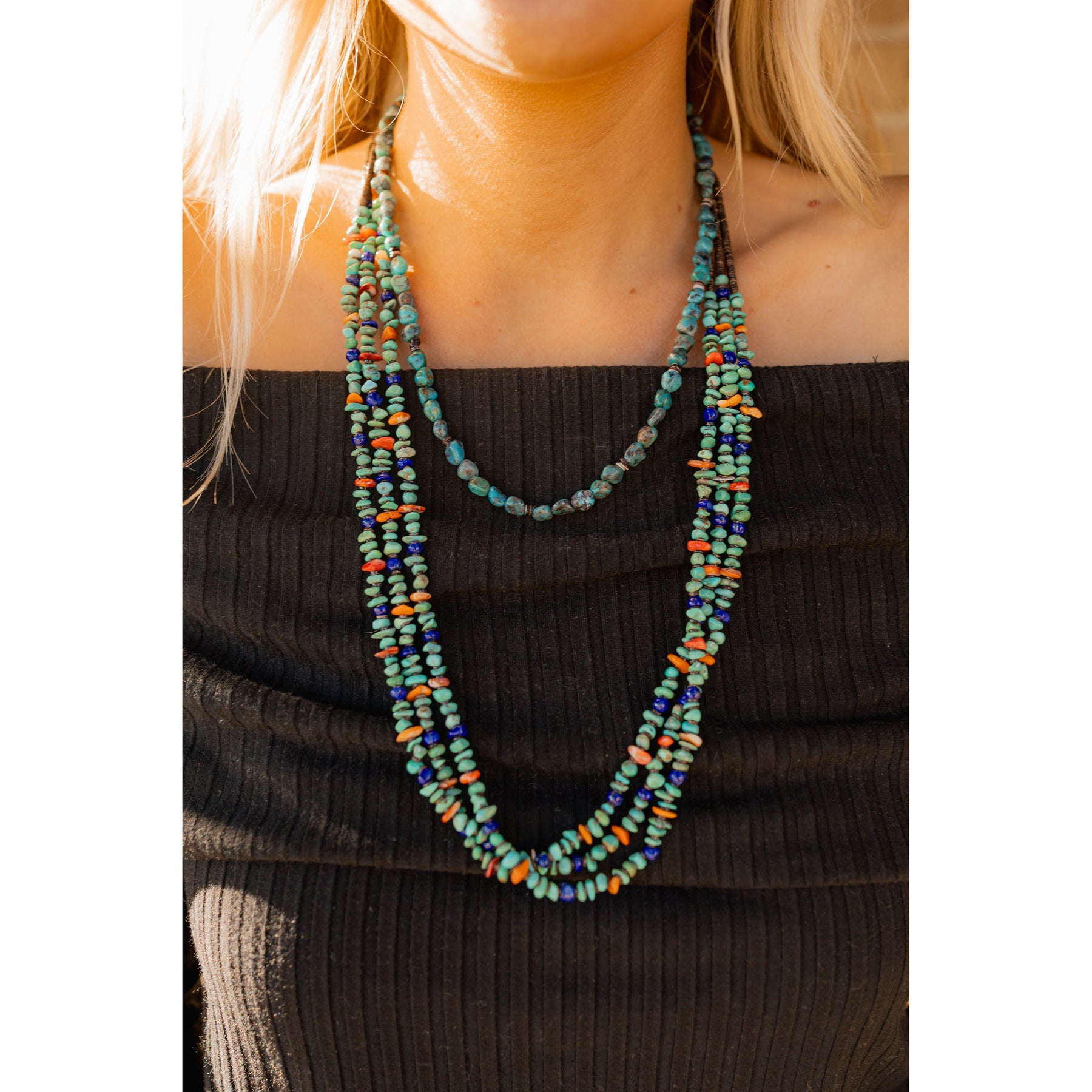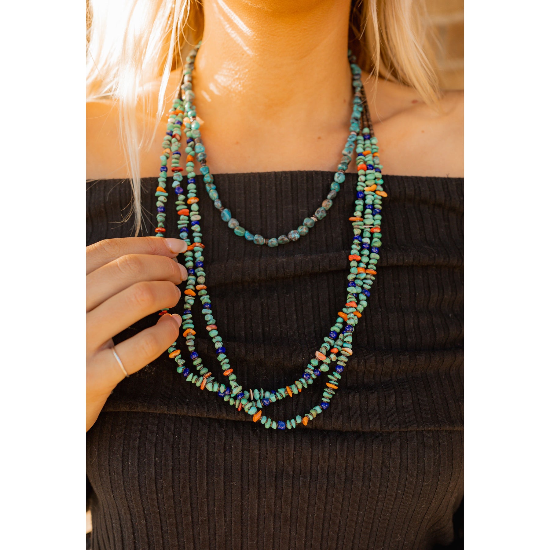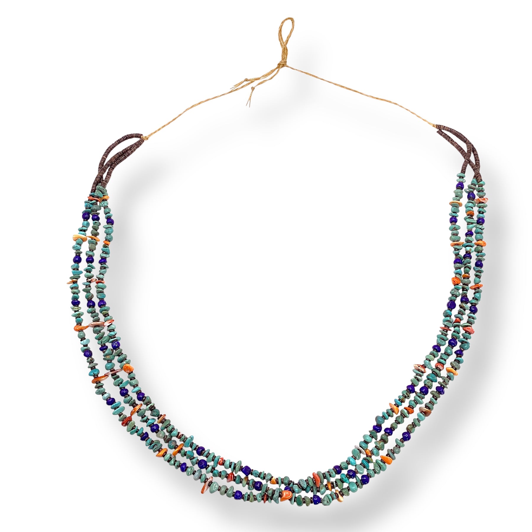 This three-strand necklace by Santo Domingo artist Fannie Garcia is a vibrant mix of turquoise, lapis, spiny oyster shell, and heishi beads, strung together to create a piece that feels both timeless and full of character.