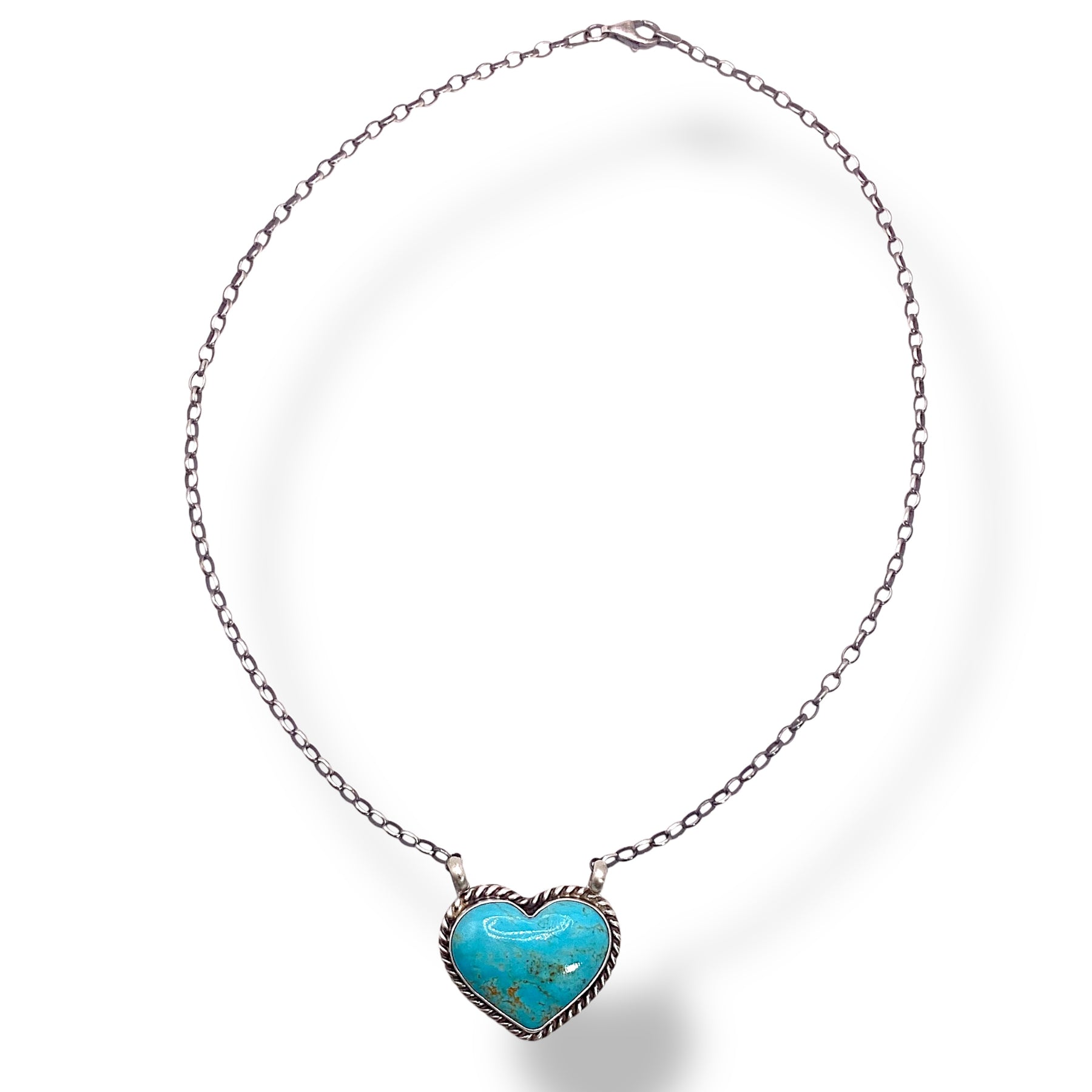 A sweet Kingman turquoise heart rests in a smooth sterling silver bezel, framed by delicate silver rope, and hangs effortlessly from a sterling chain. Handcrafted by Navajo silversmith Donovan Skeets.