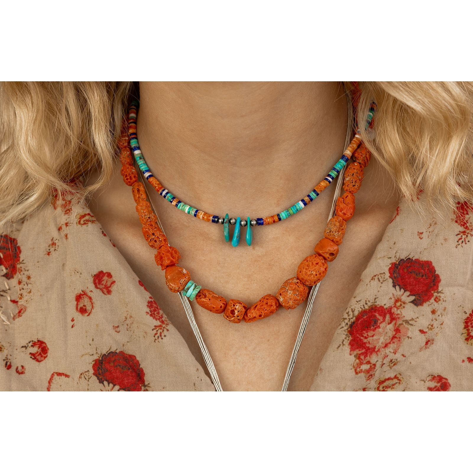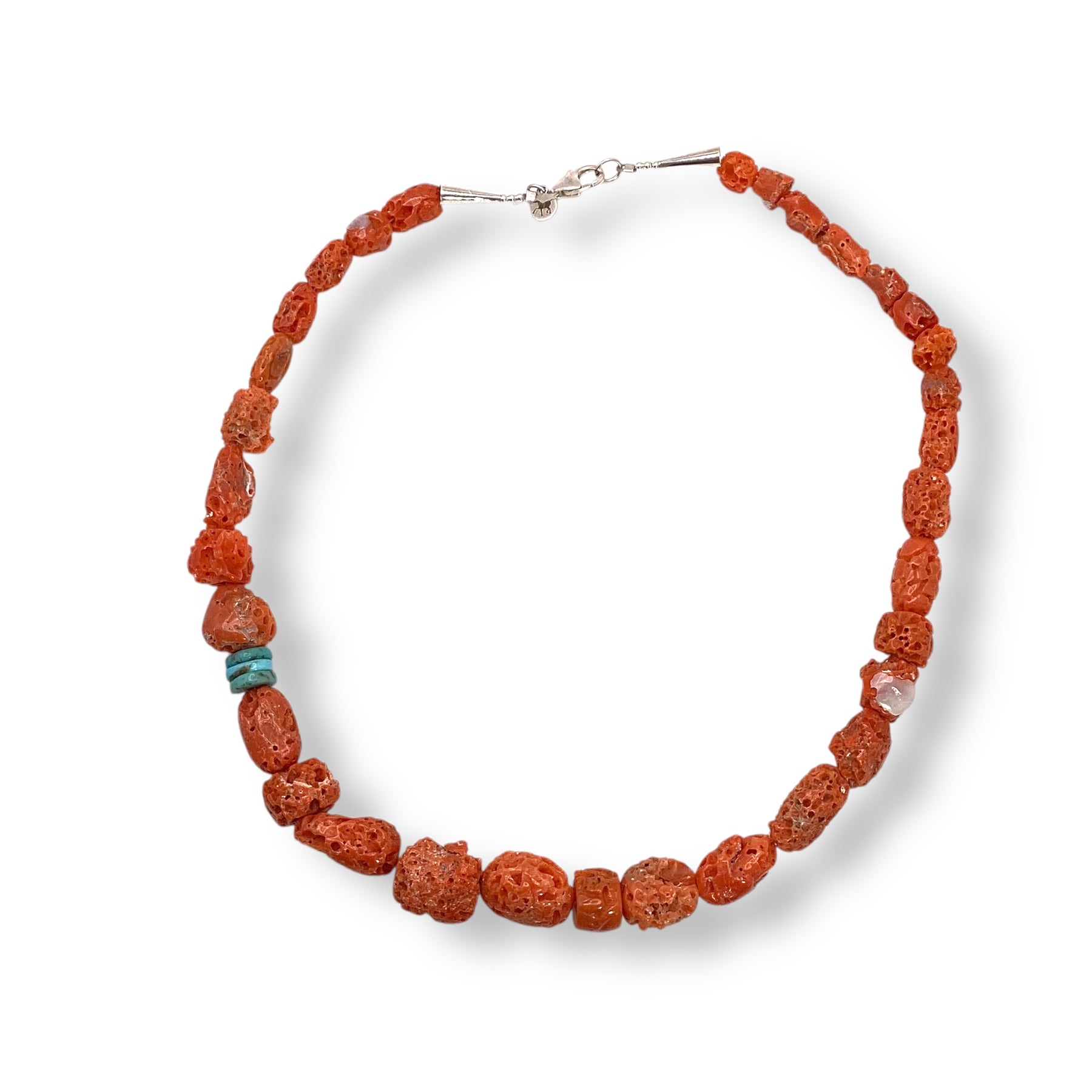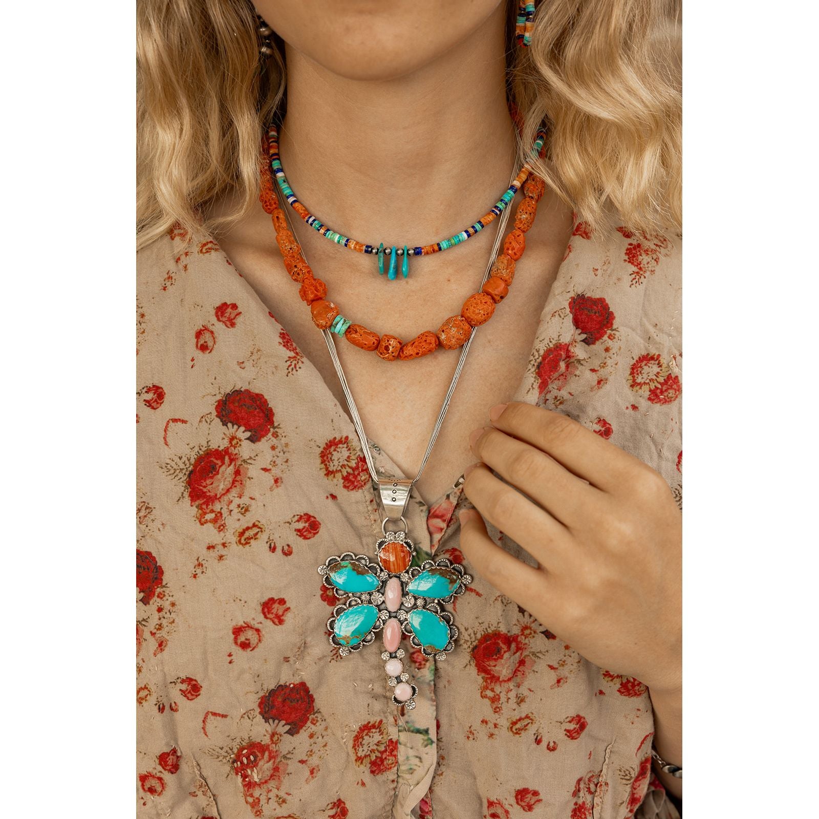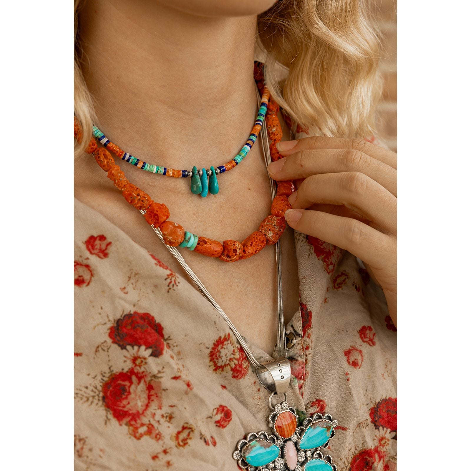 A Lantern Dancer original, this Coral and Turquoise Beaded Necklace is bursting with color and Southwest charm. The mix of warm coral and cool turquoise beads gives it a fresh, sunlit feel — like a perfect summer day captured in jewelry form.