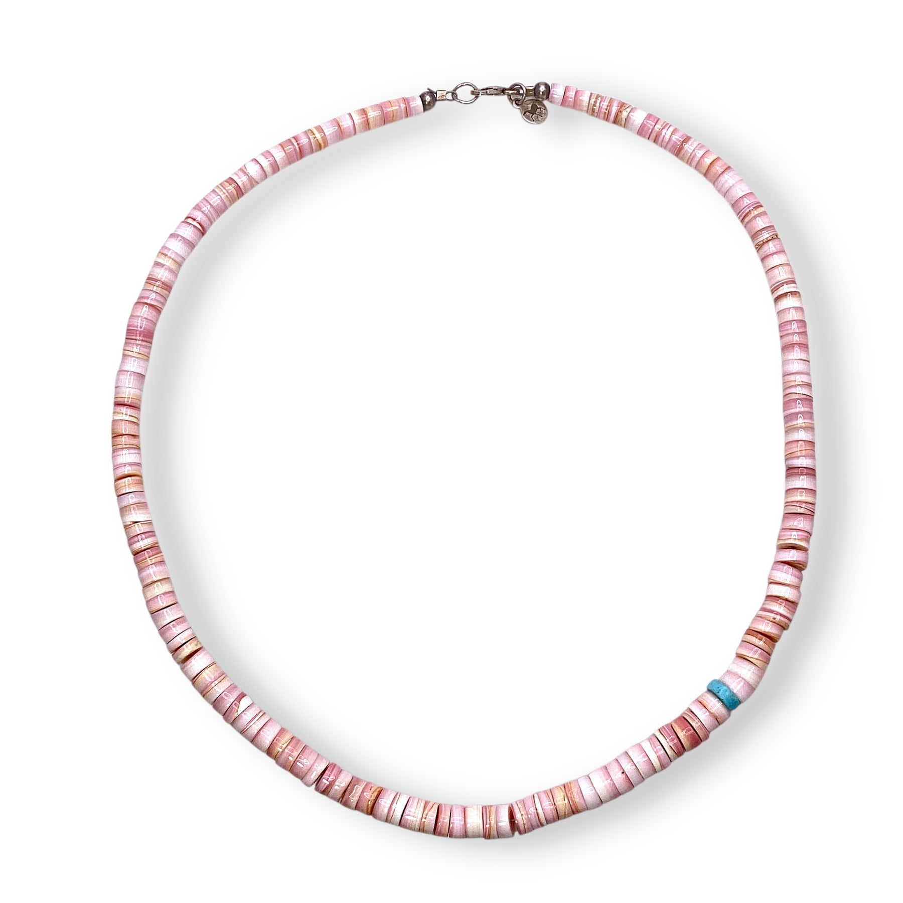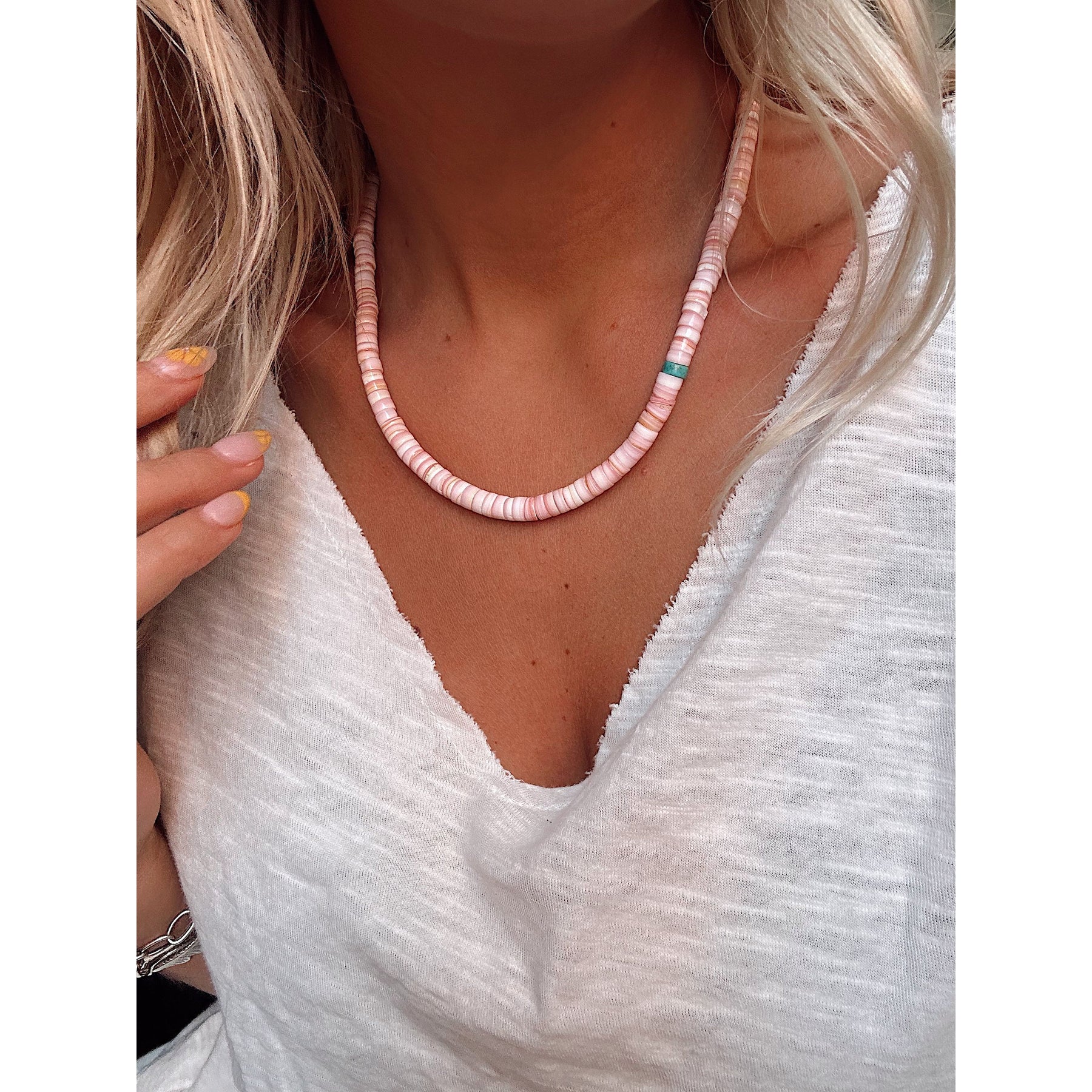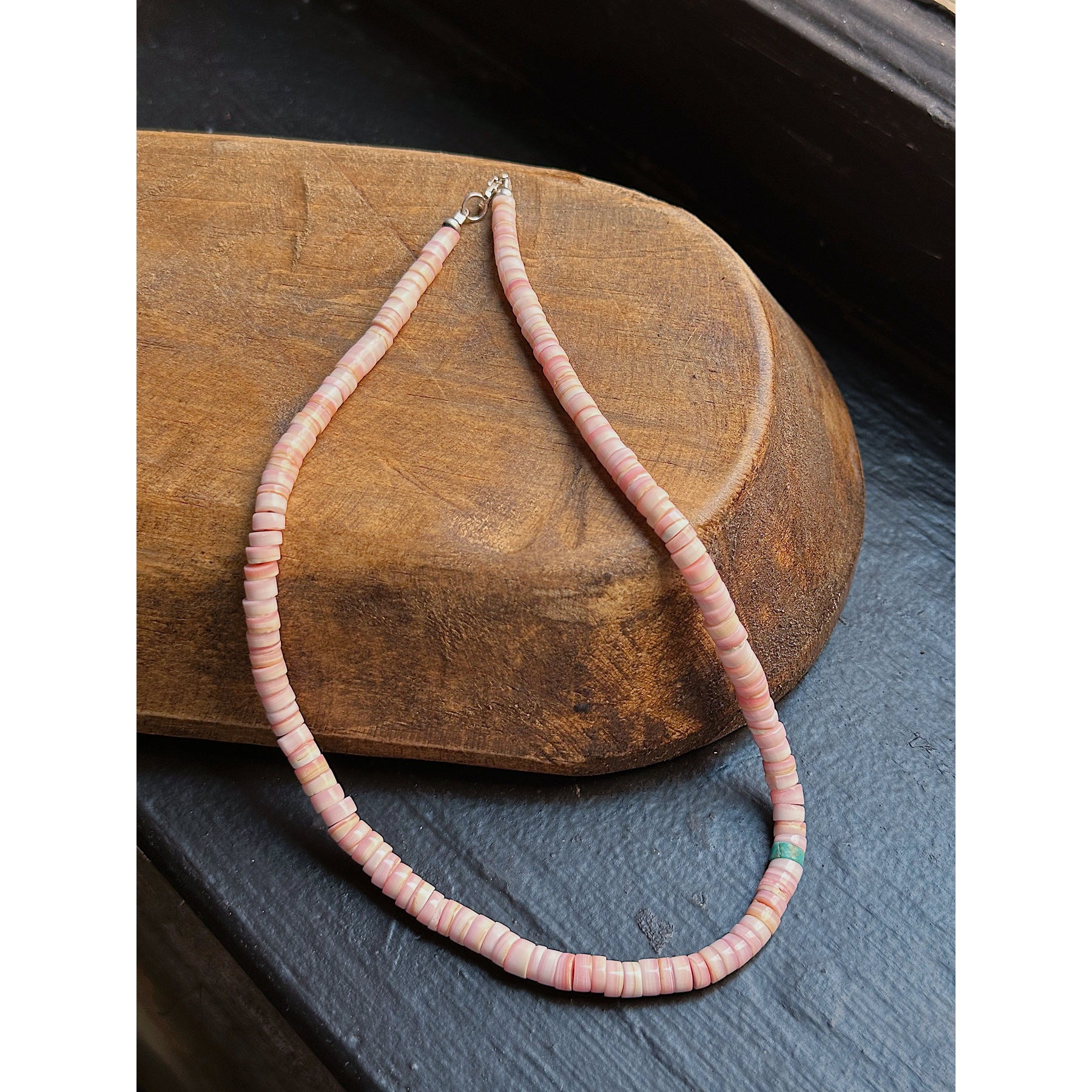 A delicate beauty with a touch of the sea—soft blush pink conch shell beads strung for that just-right drape, perfect worn solo or mingled with your favorite strands.