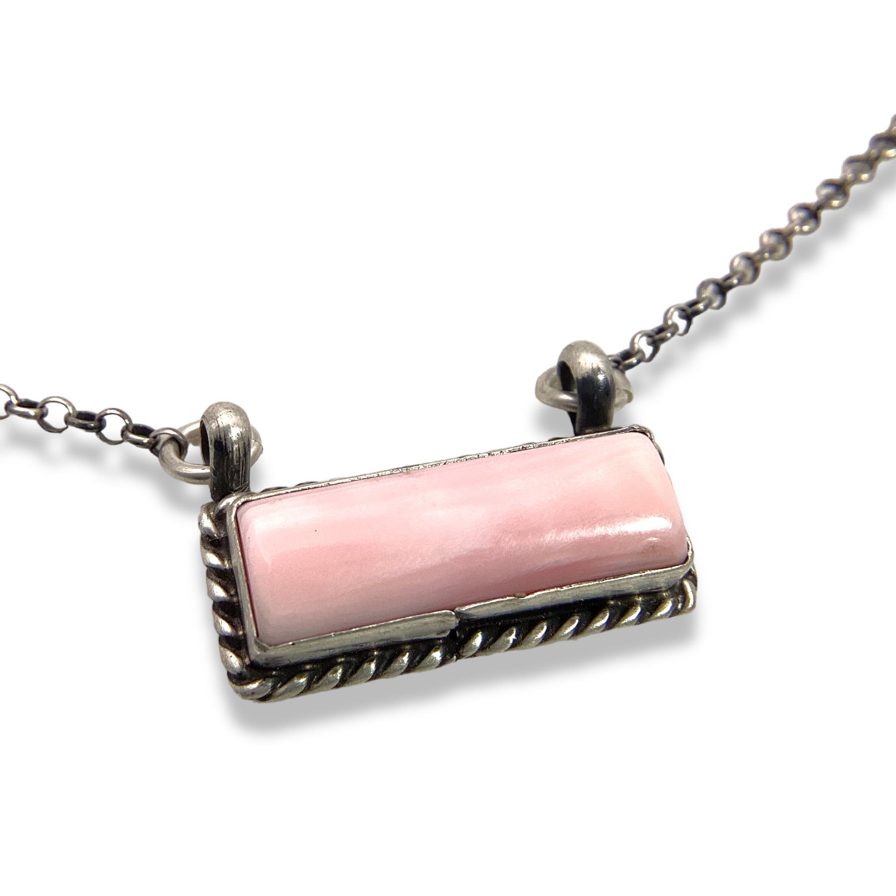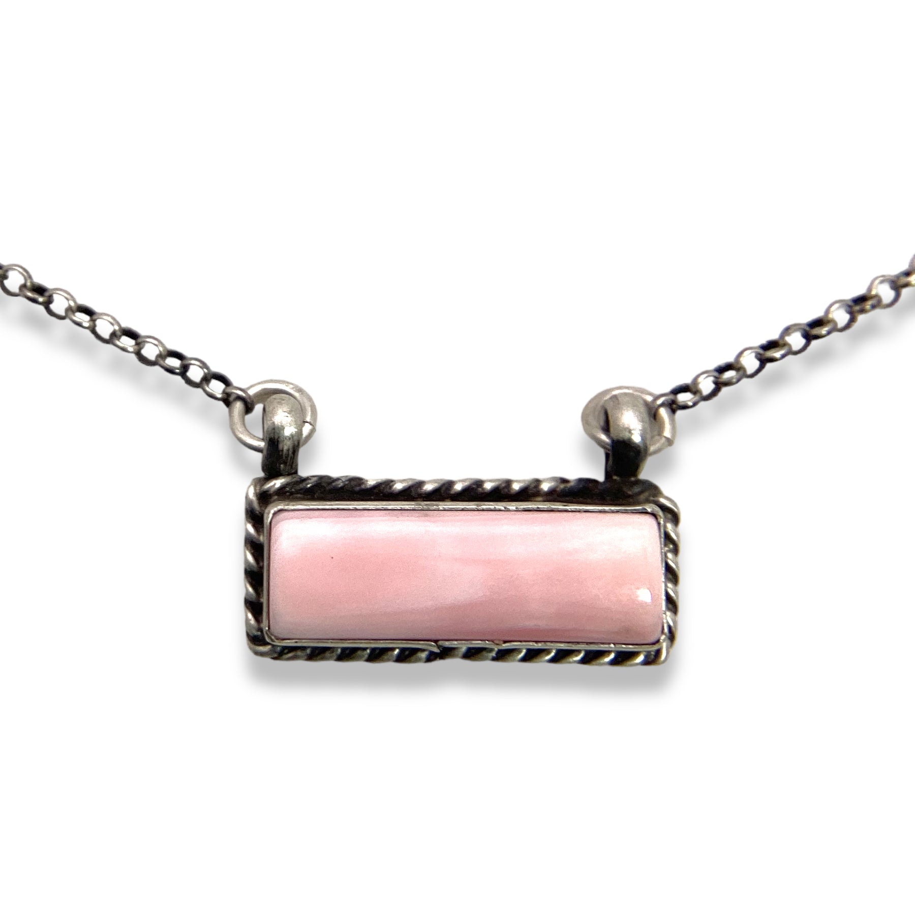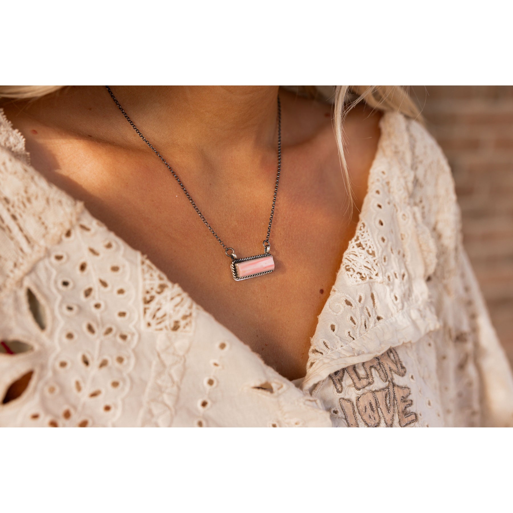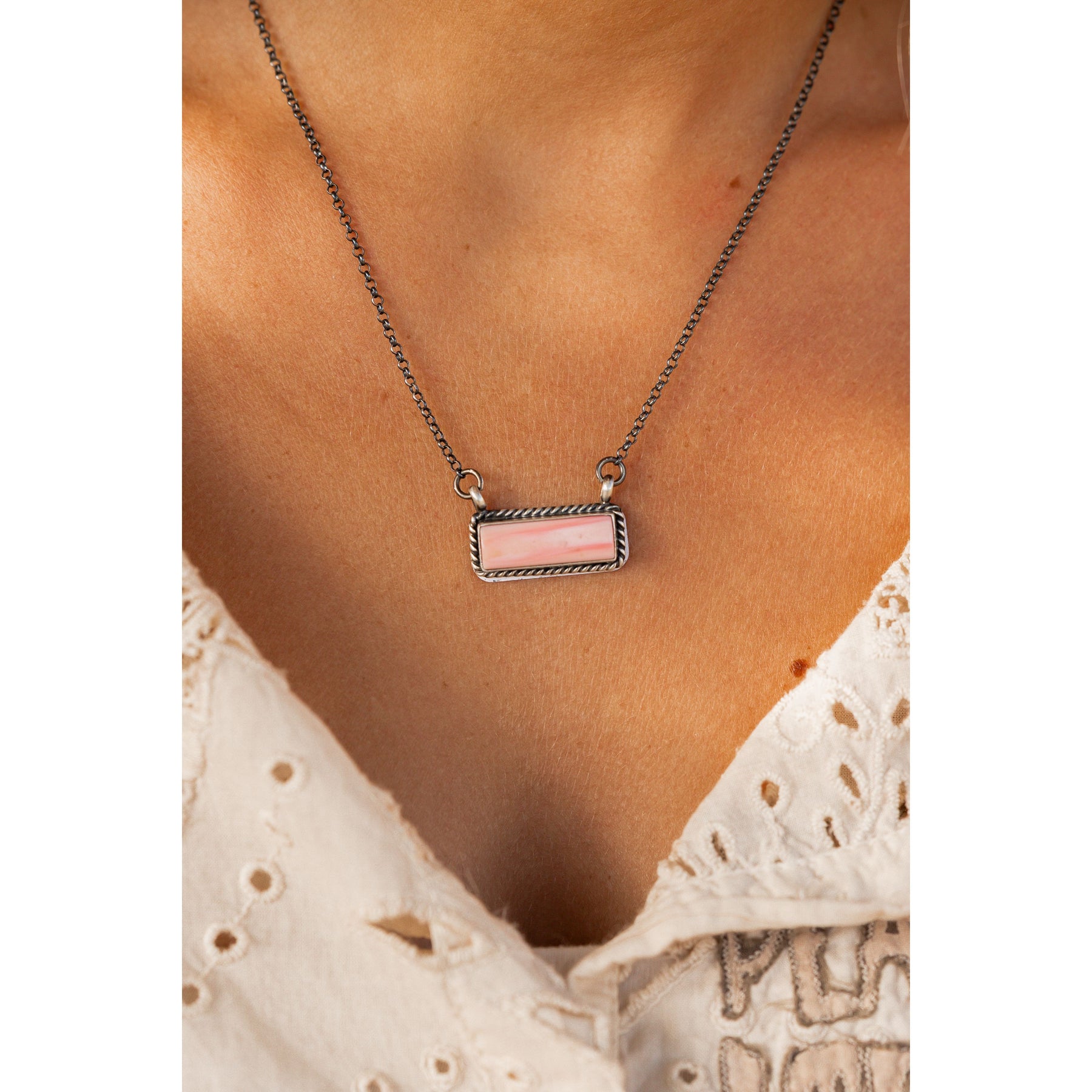 Shake up your style with the Pink Conch Shell Pettie Bar Necklace! This best seller is perfect for keeping you western with a touch of pink. Authentically native made by Elouise Kee, it adds layers of sophistication to any outfit. (And, pink is the new black!) Set in smooth silver bezel with romantic silver twist!