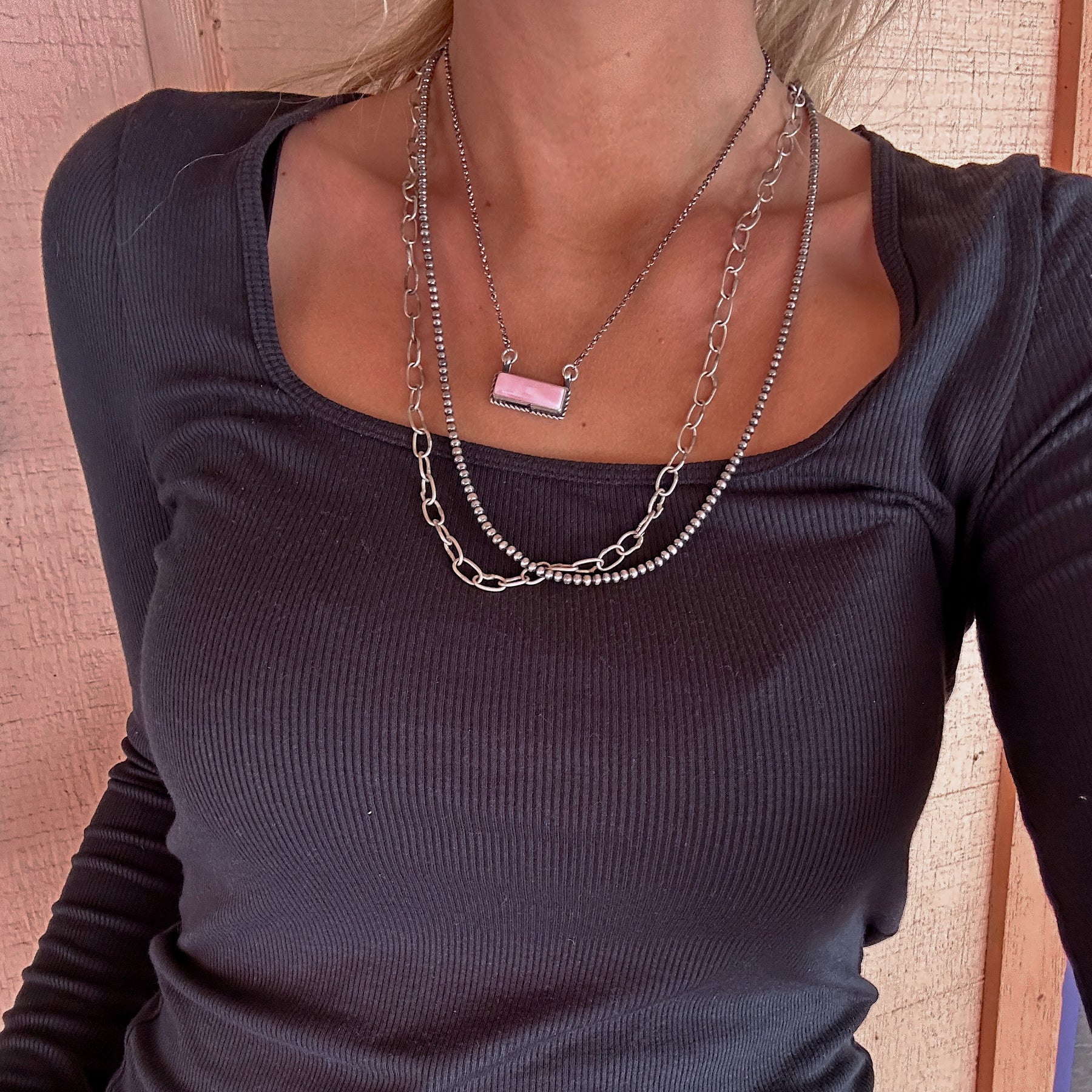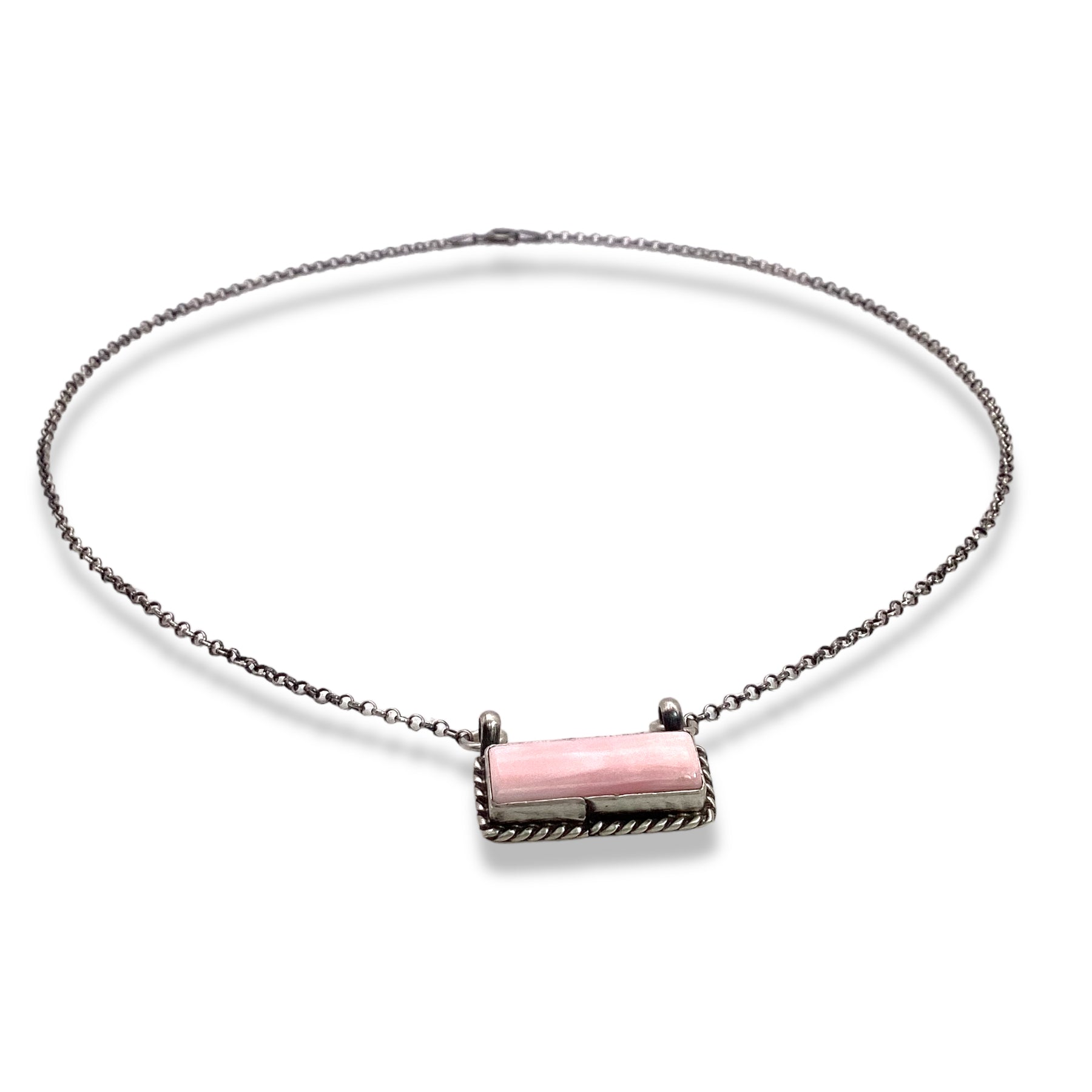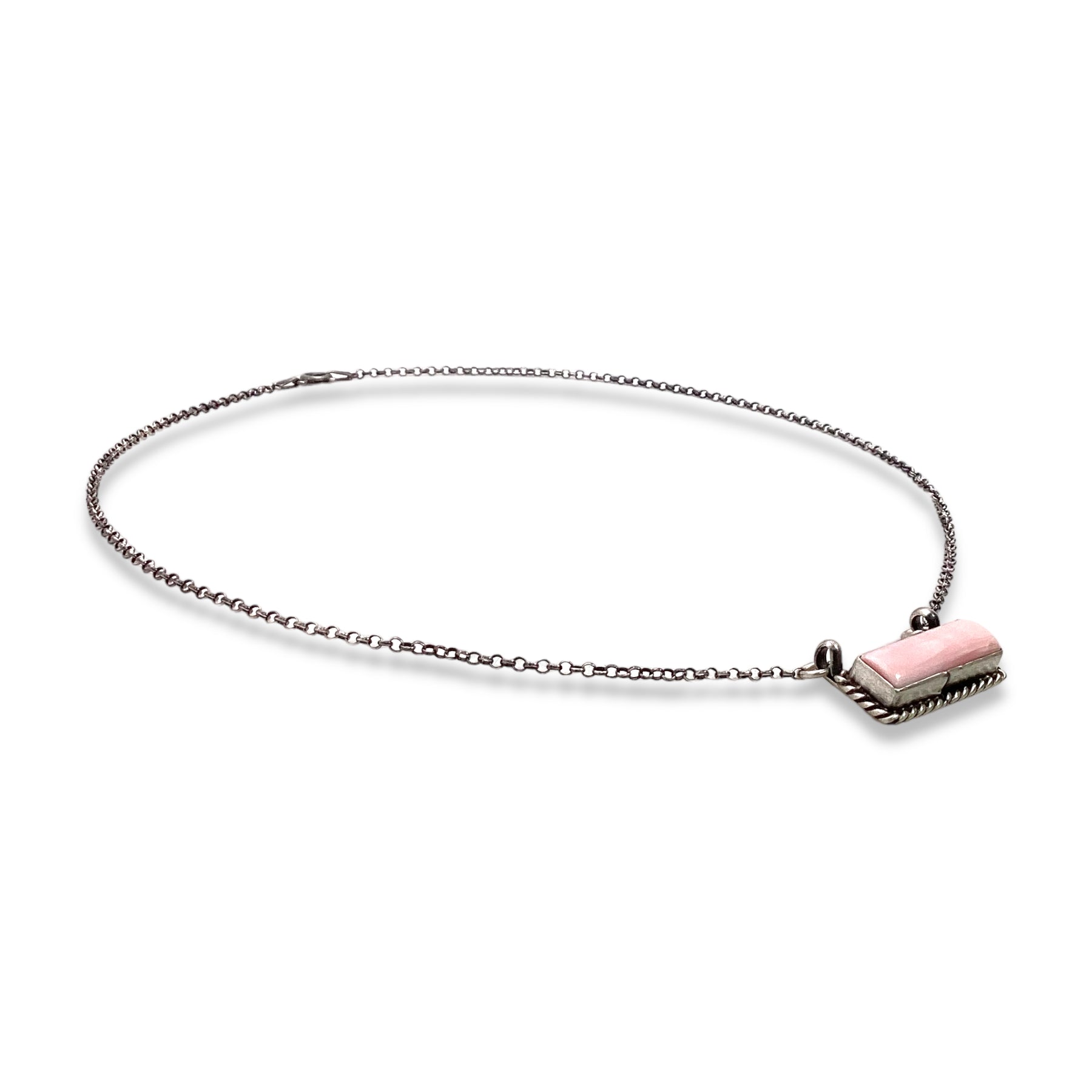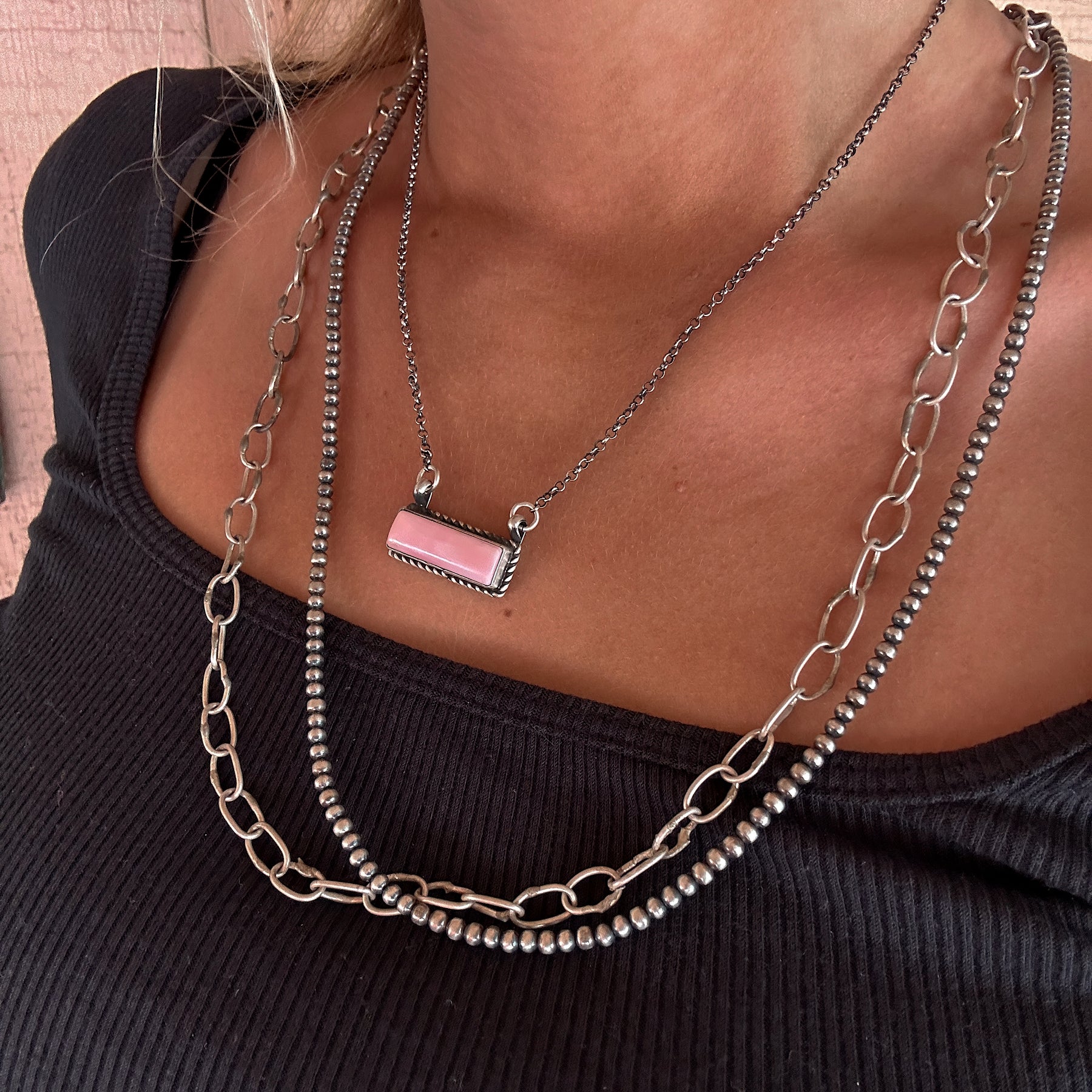 Shake up your style with the Pink Conch Shell Pettie Bar Necklace! This best seller is perfect for keeping you western with a touch of pink. Authentically native made by Elouise Kee, it adds layers of sophistication to any outfit. (And, pink is the new black!) Set in smooth silver bezel with romantic silver twist!