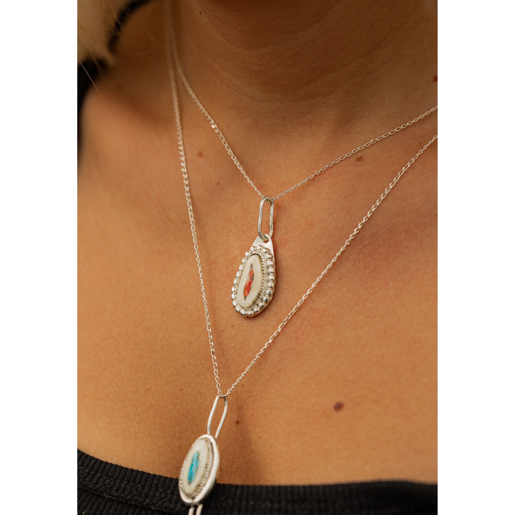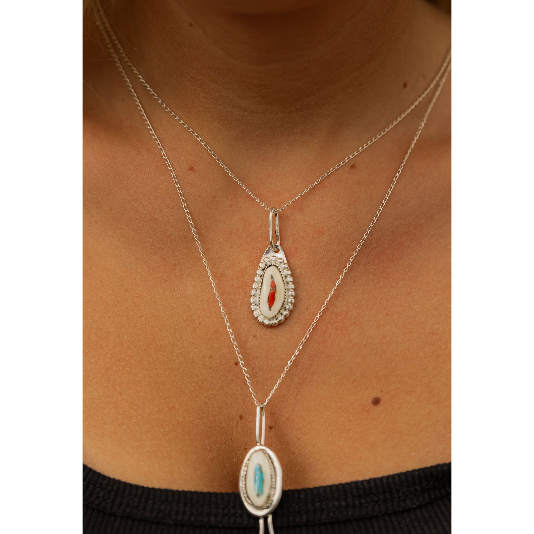 Designed by silversmith Randy Christensen, this necklace pairs the rich, fiery tones of coral with the warm, natural beauty of elk ivory. The stones are set in a smooth sterling silver bezel, framed with delicate silver bead detailing that adds depth and dimension. It’s a striking piece that honors tradition while feeling timeless.