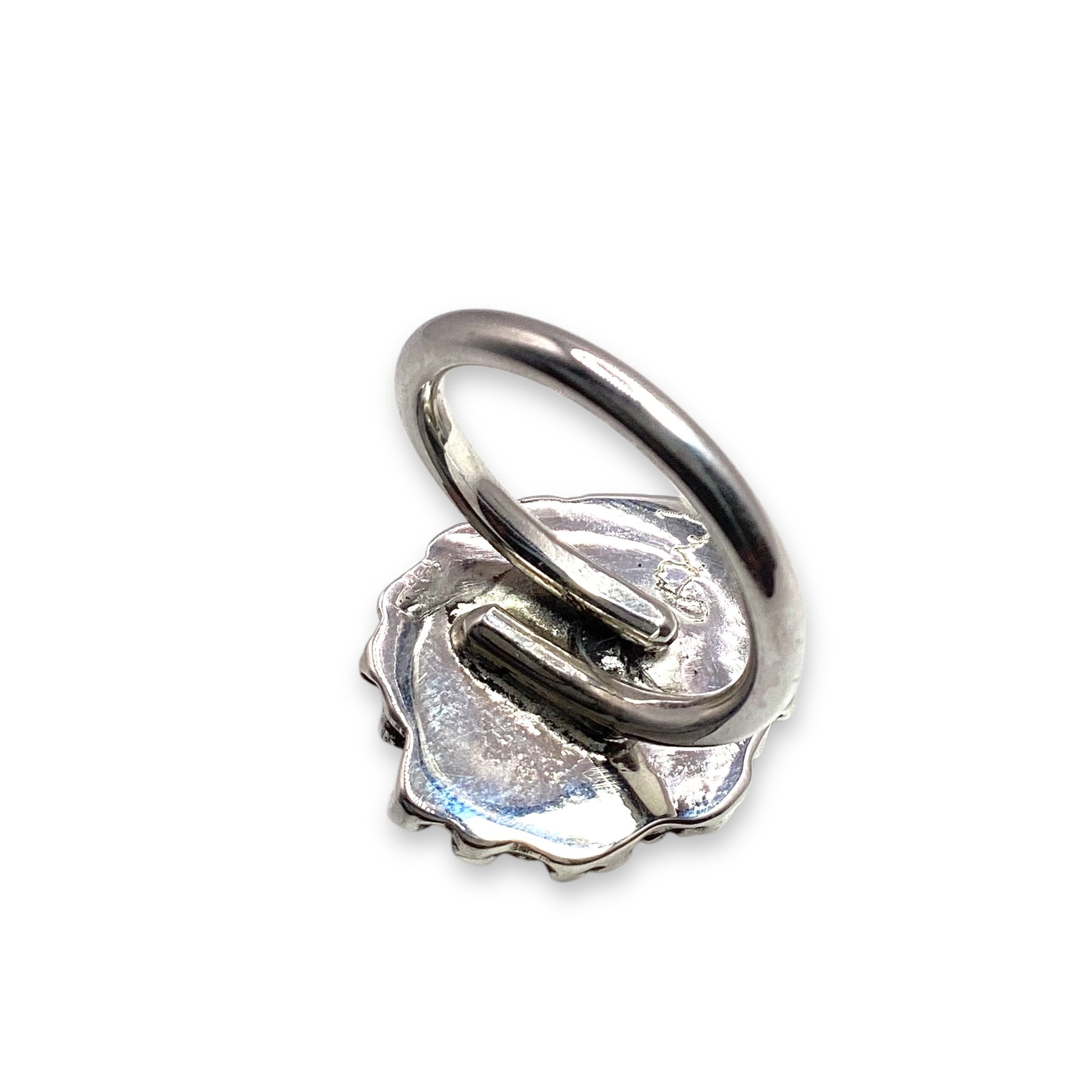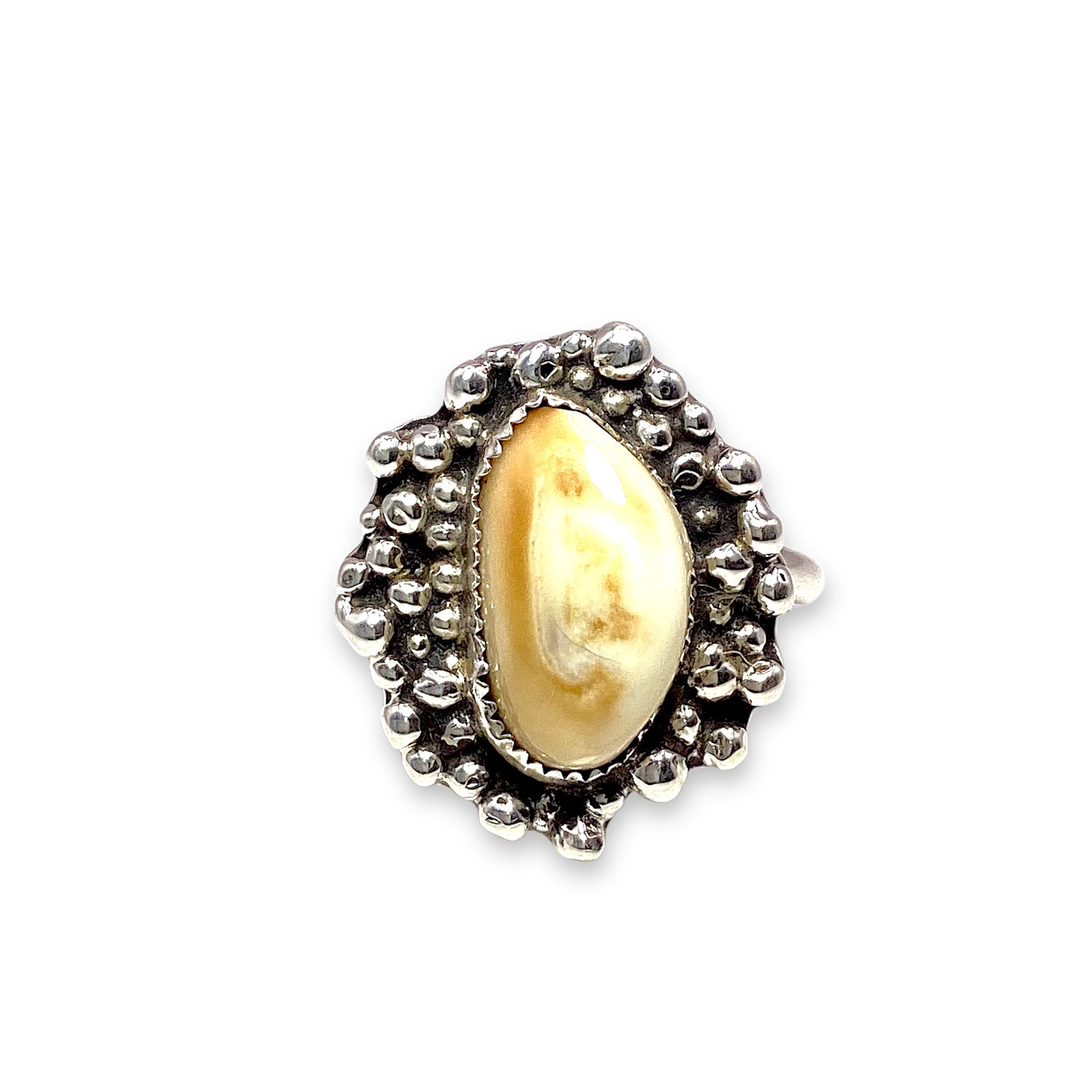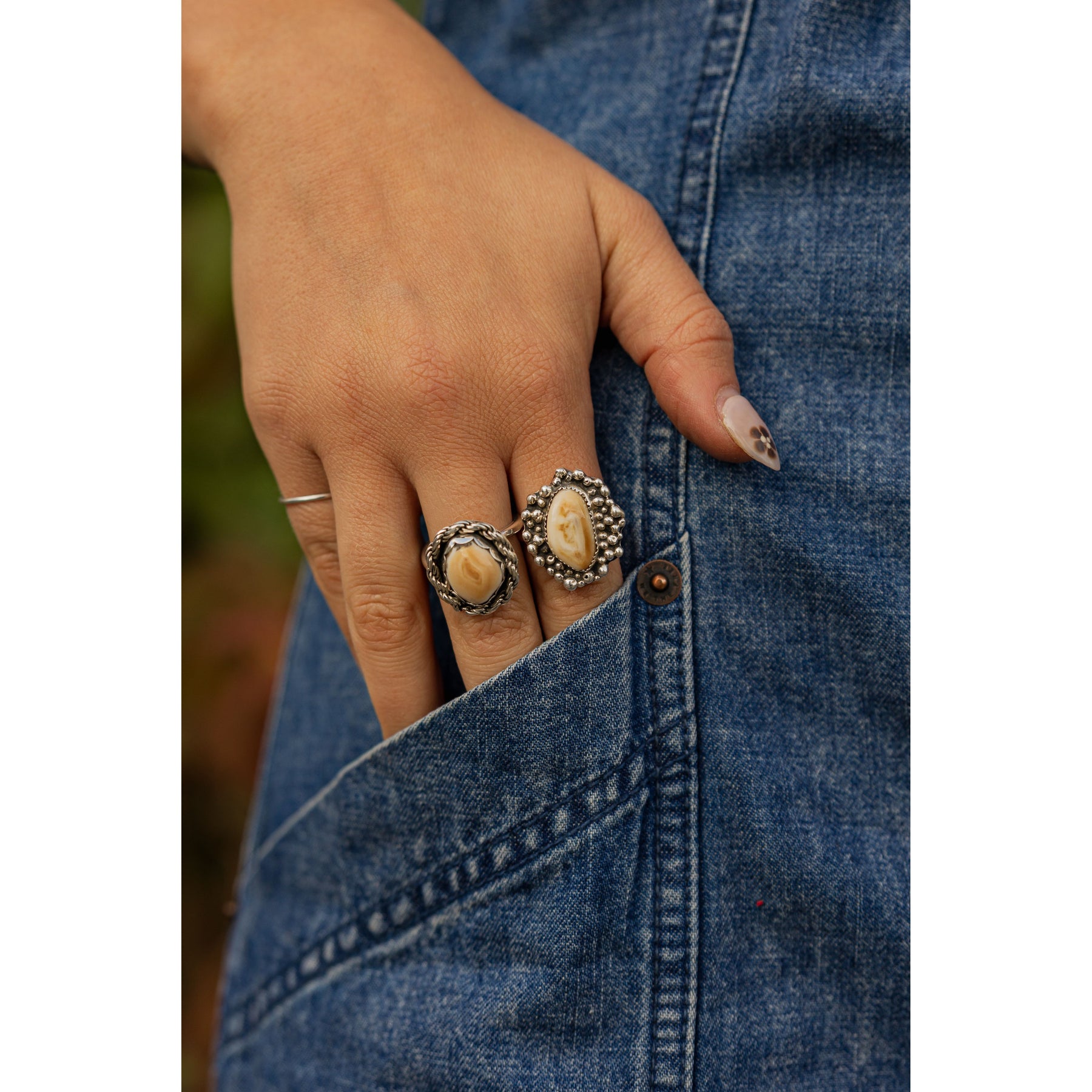Crafted with care by Randy Christensen, this Elk Ivory and sterling silver ring feels like a treasure from another time. The creamy ivory center is cradled in a sawtooth bezel, its soft warmth glowing against intricate silverwork that wraps around it with elegance. A piece that feels both intimate and enduring.
