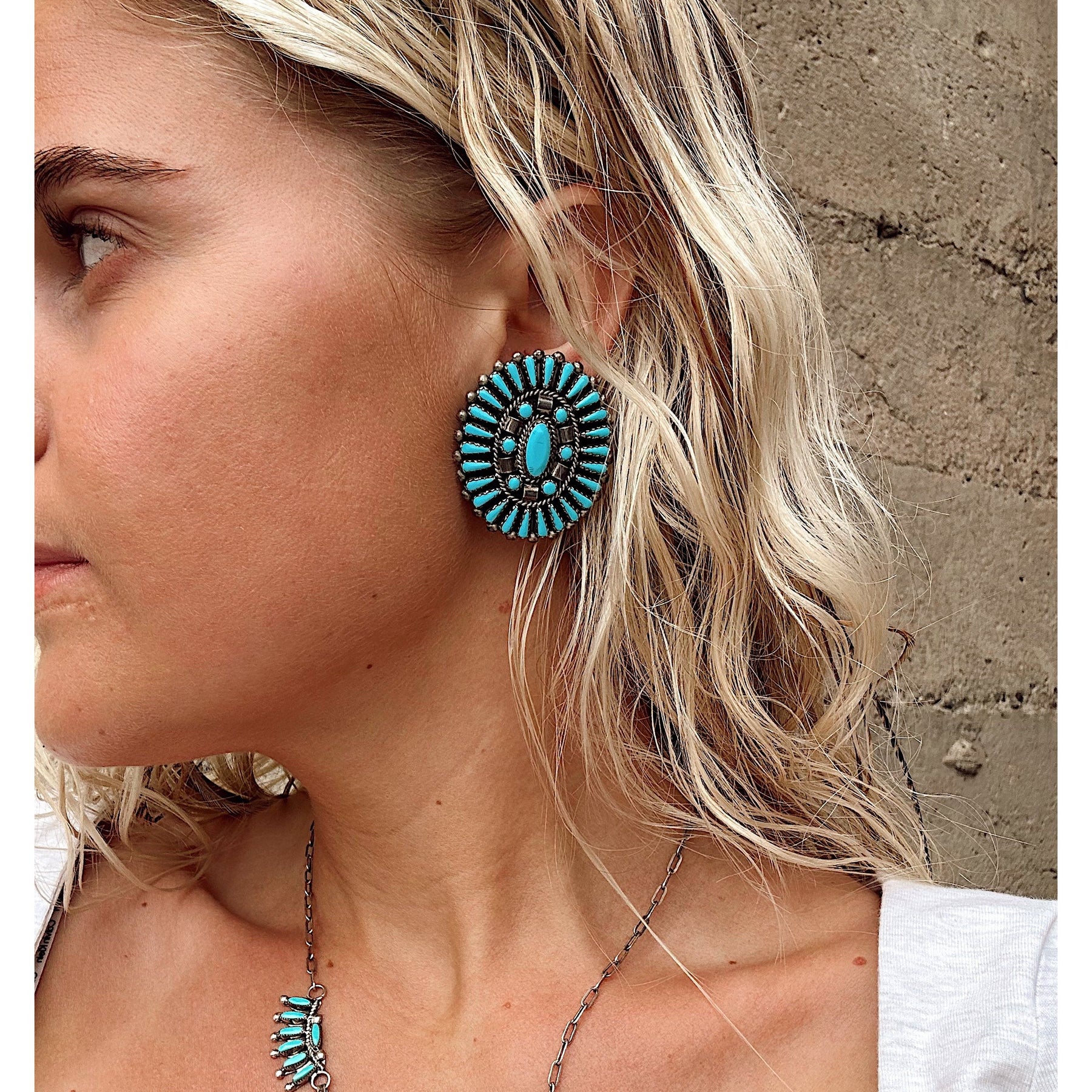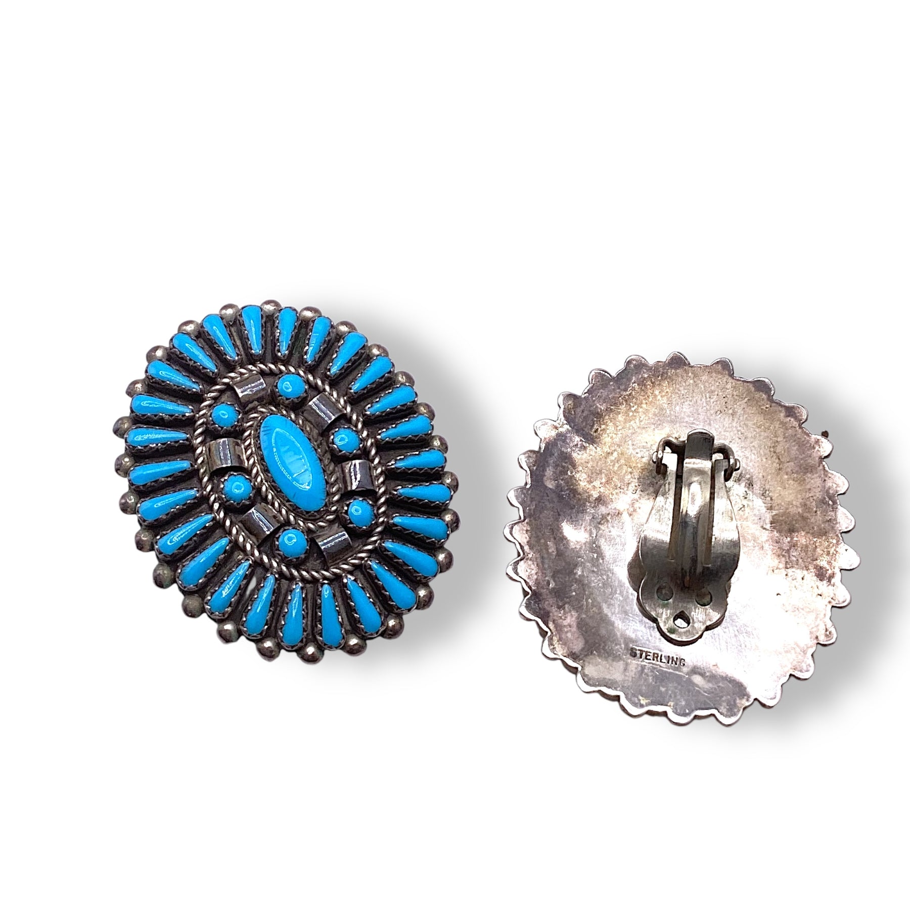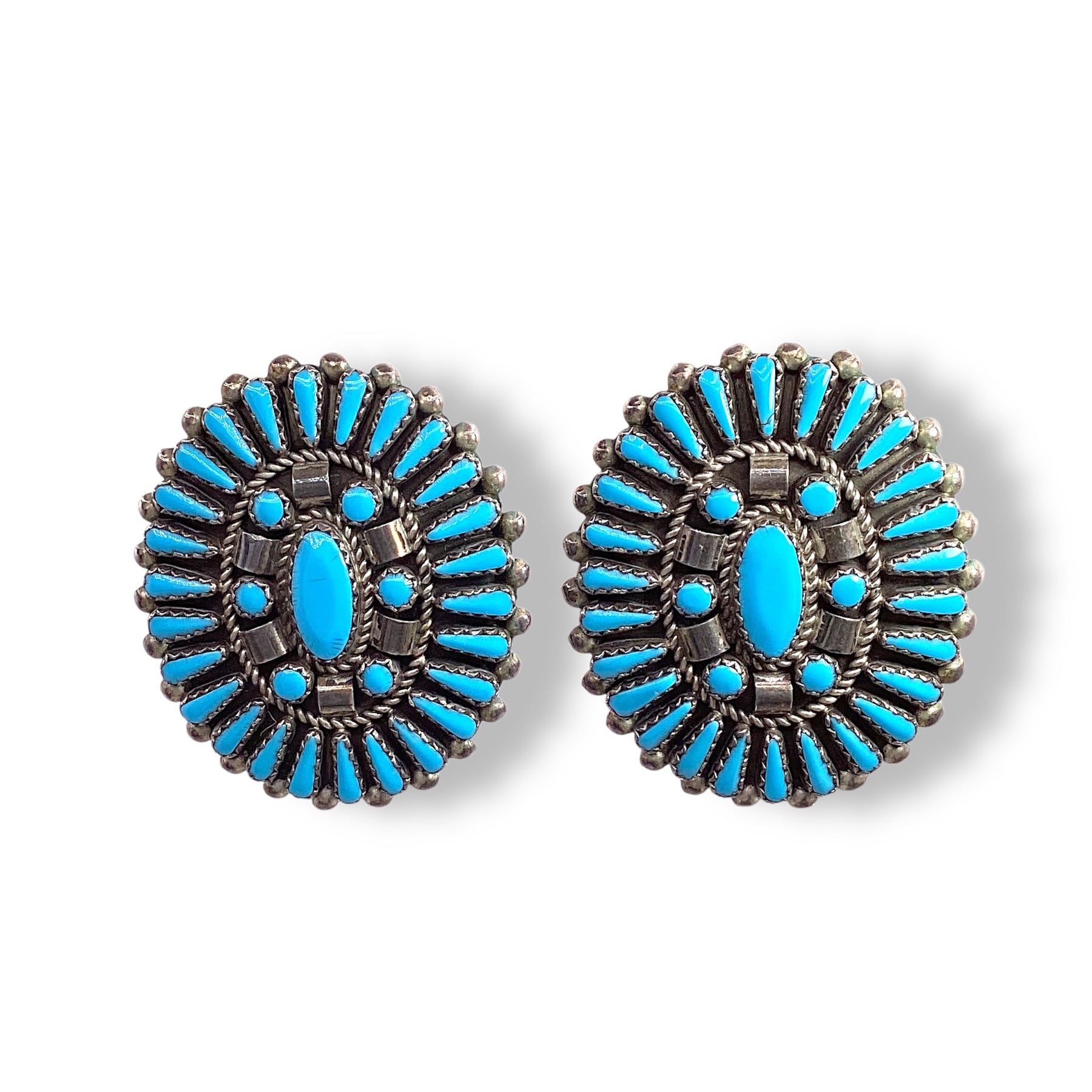 Striking vintage Zuni craftsmanship with vivid Kingman turquoise arranged in beautifully precise needlepoint. The layered detail and rich blue center give them depth and presence. A timeless Southwestern statement with true collector appeal.