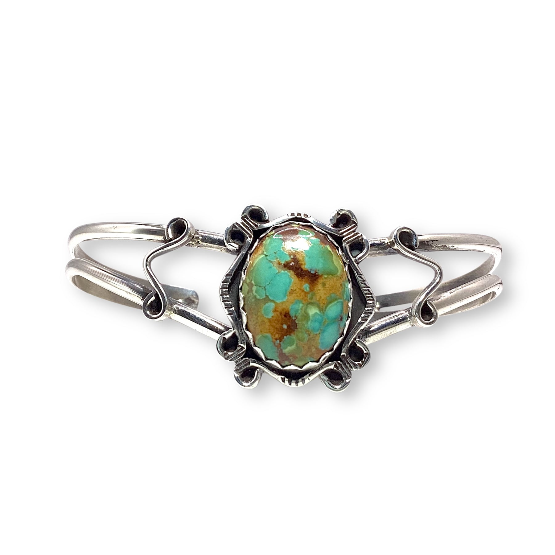 Handcrafted by Navajo artist Lyanne Goodluck, this cuff features a striking Royston Turquoise stone set in sterling silver, showcasing the vibrant blue-green hues and natural matrix of the stone. The design is bold yet refined, highlighting both the beauty of the turquoise and the artist’s meticulous craftsmanship.