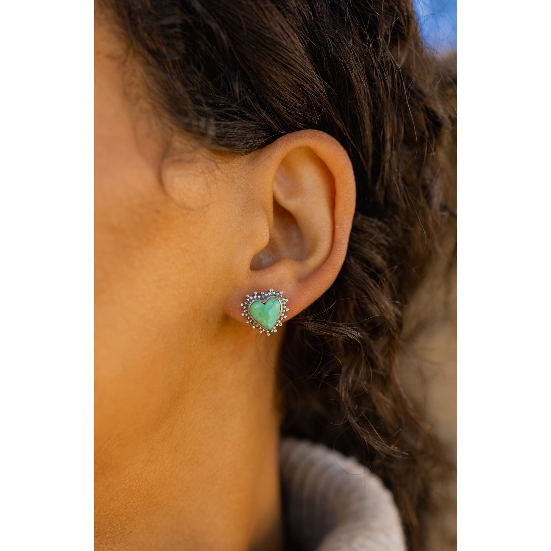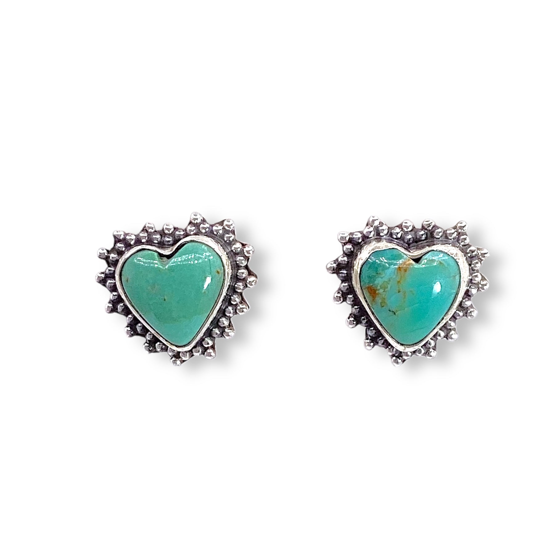 Sweet and full of soul — these heart-shaped Kingman turquoise studs are set in smooth sterling silver bezels, wrapped in delicate silverwork that catches the light just right. Handcrafted with love, they radiate that perfect mix of romance and desert charm.
