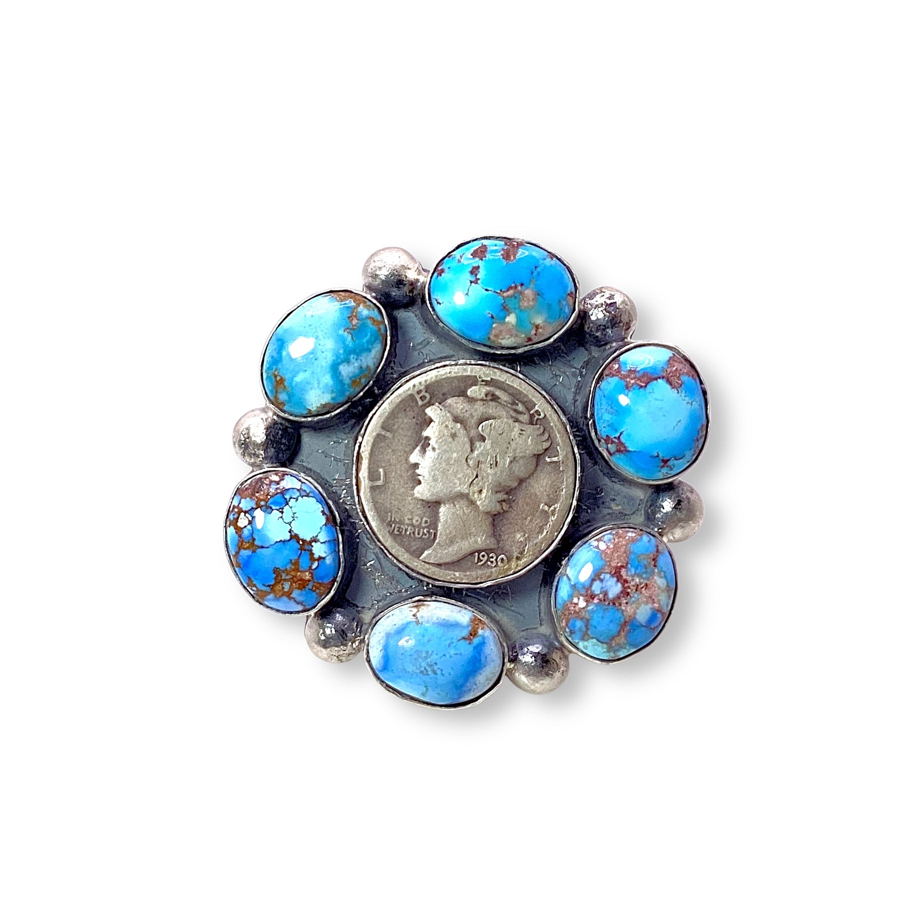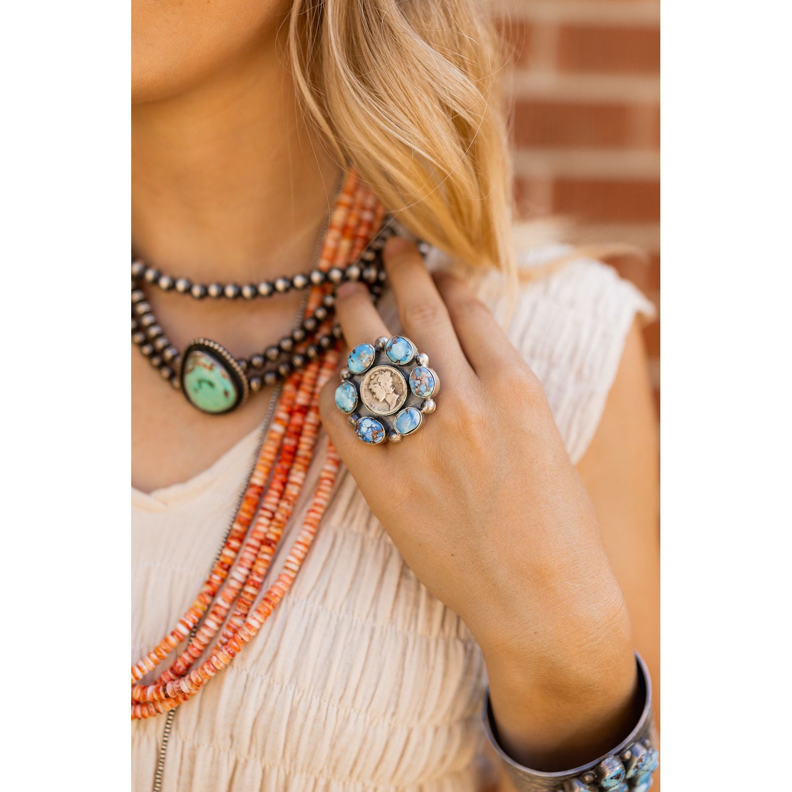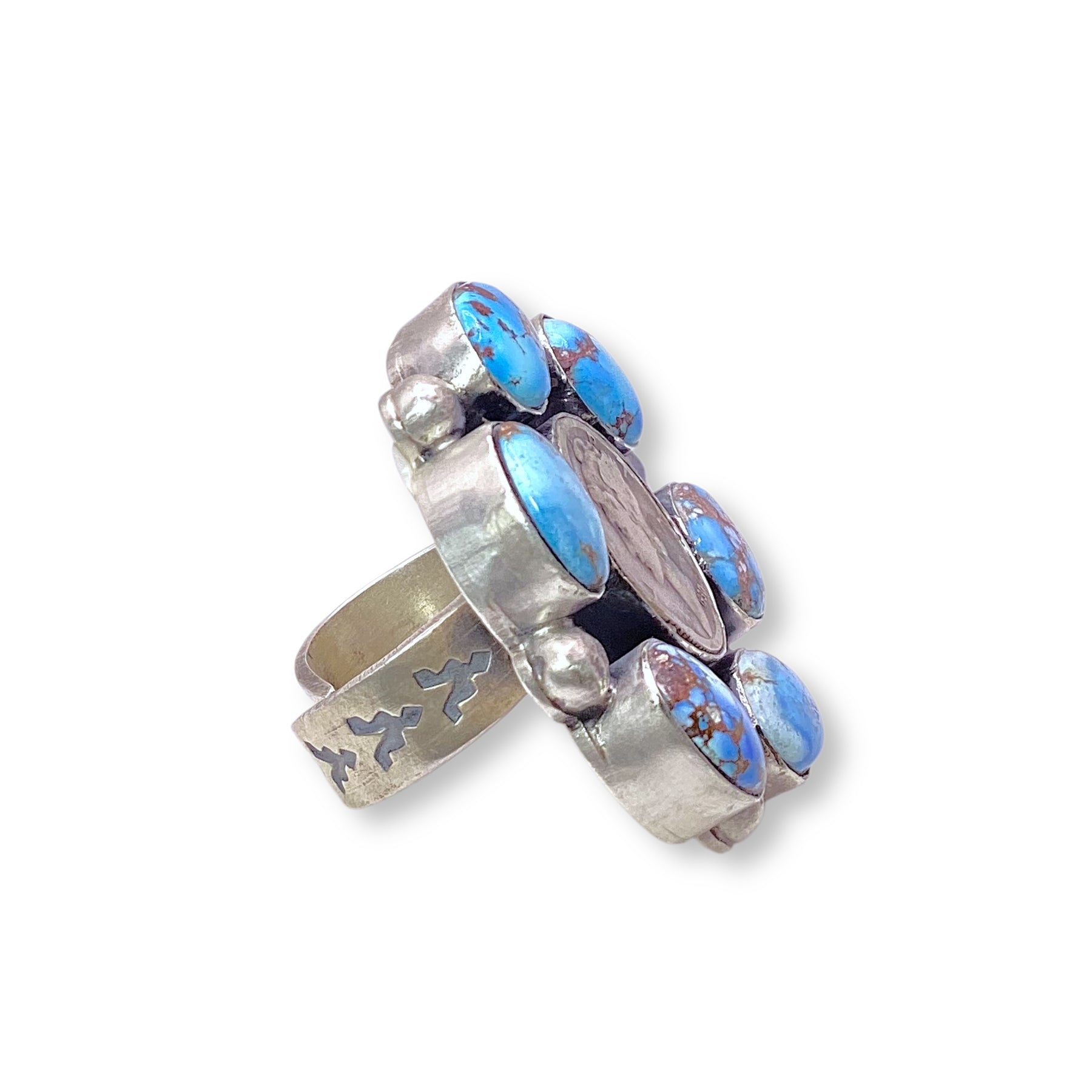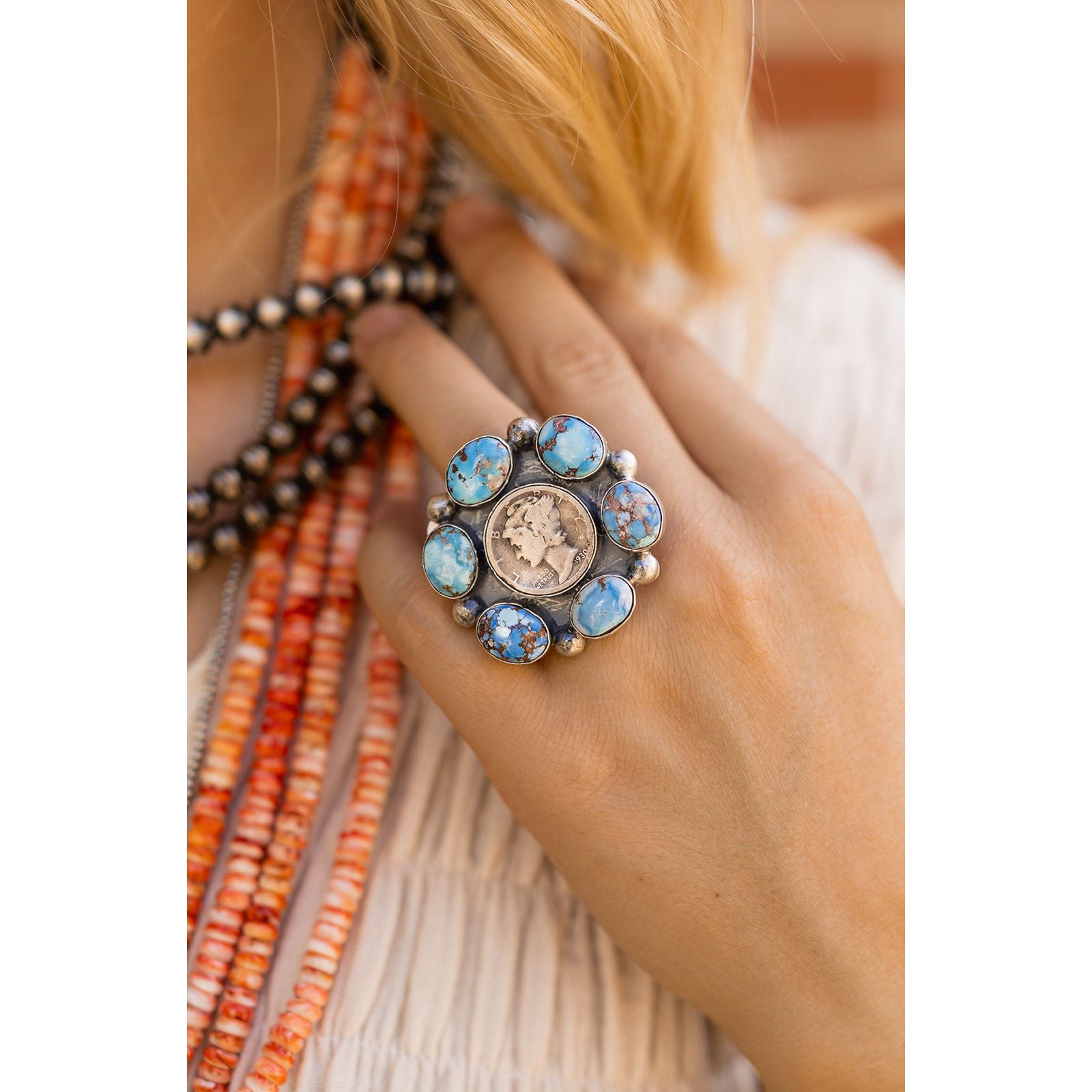 Delicate and bold all at once, this adjustable ring features a radiant Golden Hills turquoise stones in smooth sterling silver bezels, circling a 1930 United States Liberty dime. Handcrafted with love, it’s the perfect everyday sparkle with a southwestern twist.