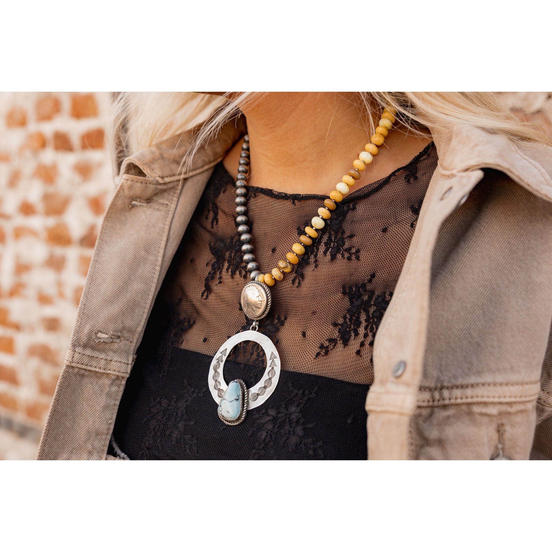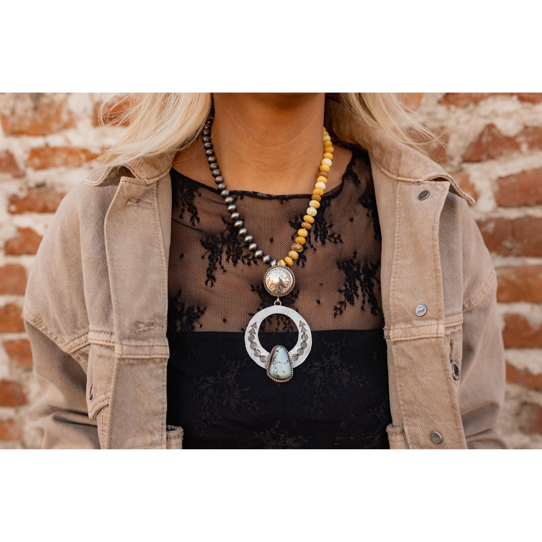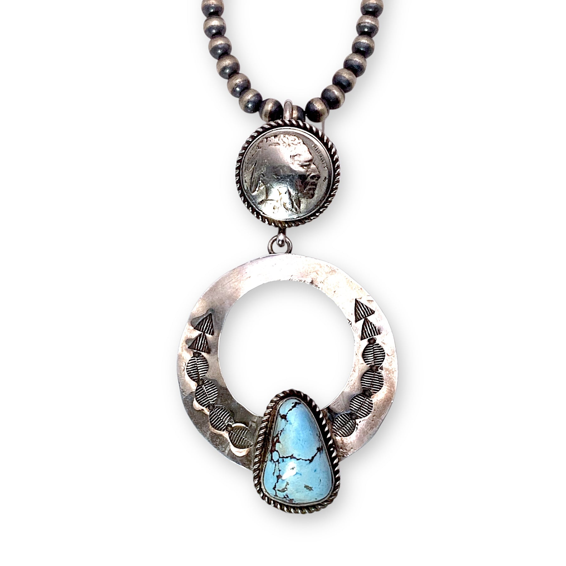 Measures: 4" long by 2.25" at widest (for bail-can fit up to 8mm Navajo Pearl Necklace)
