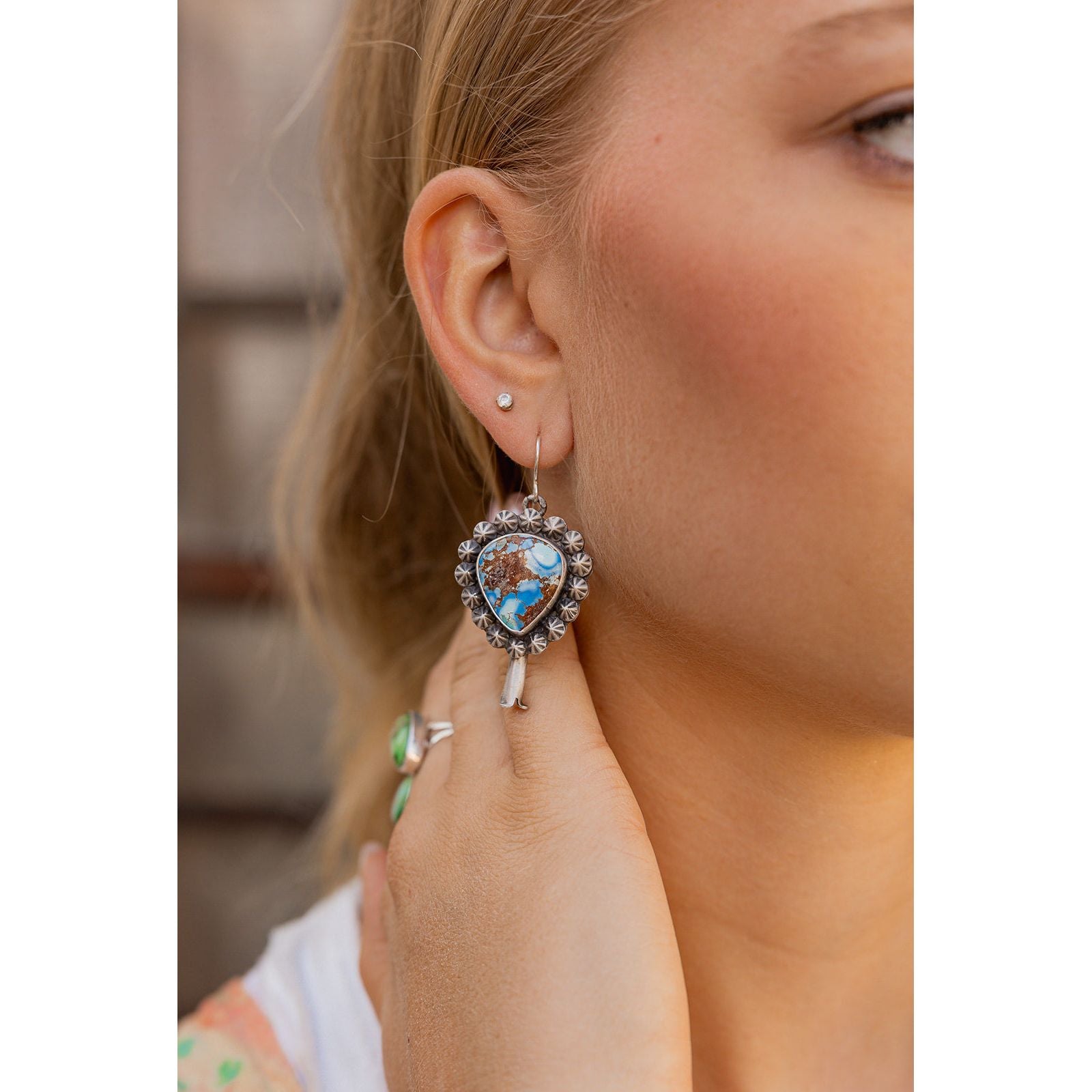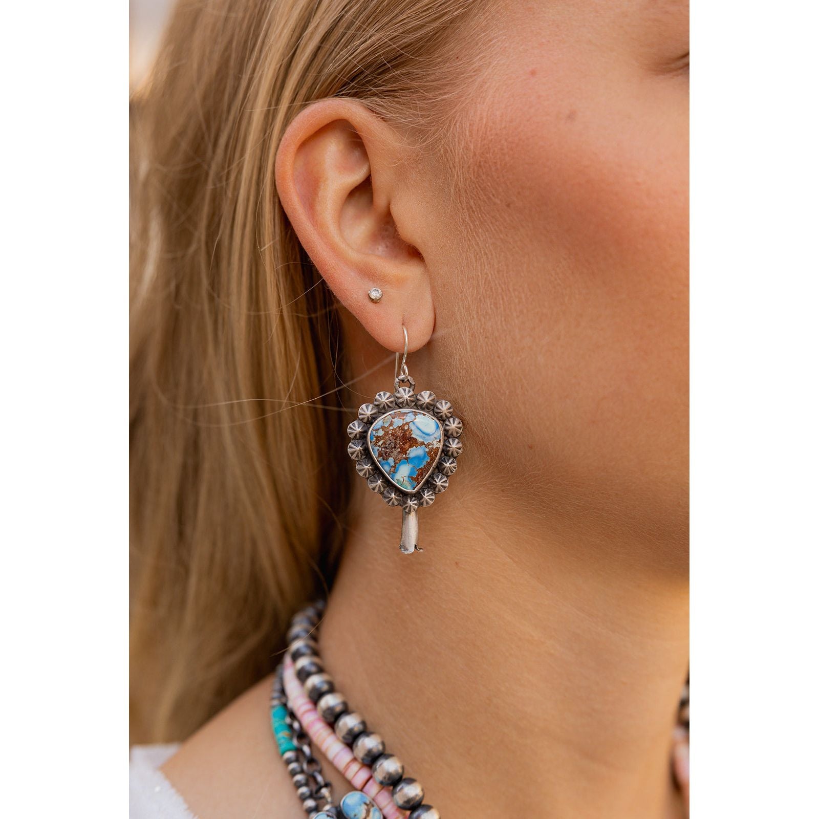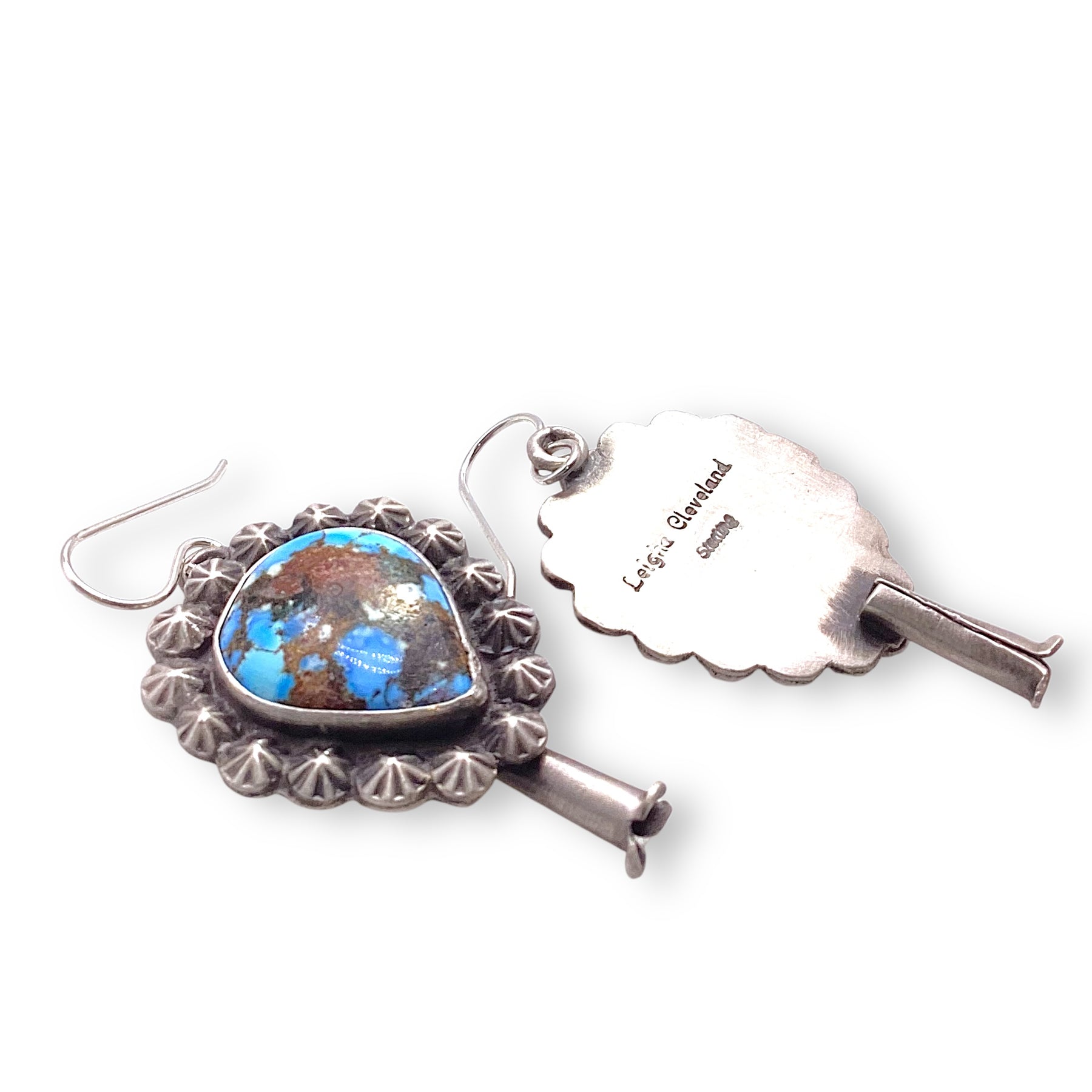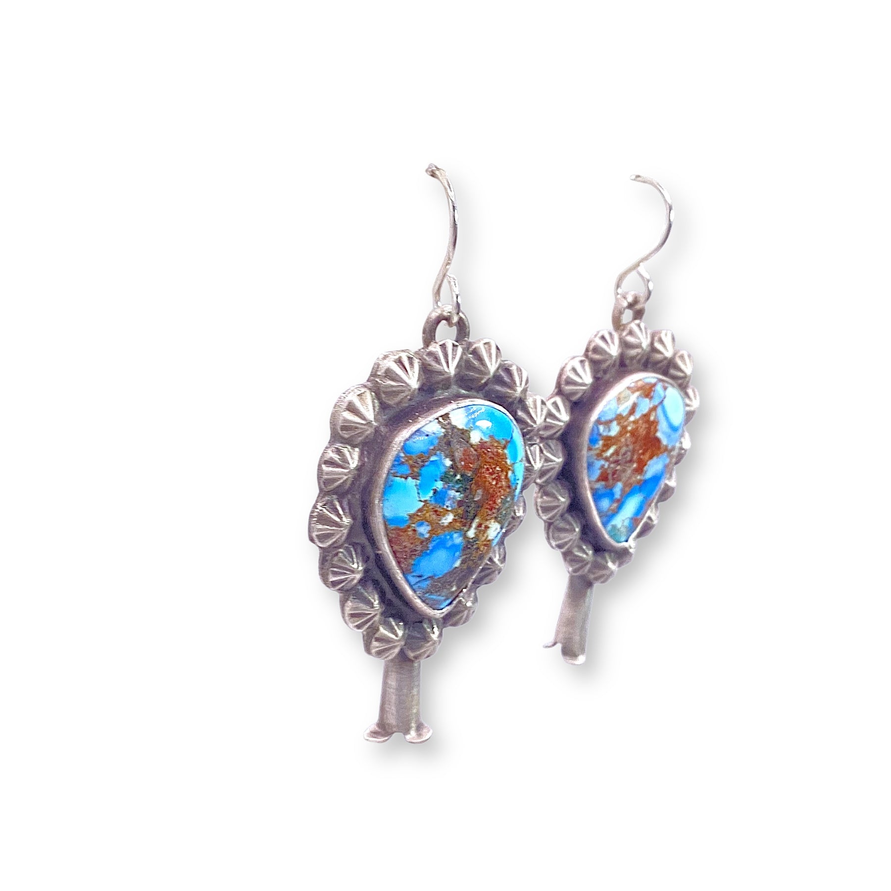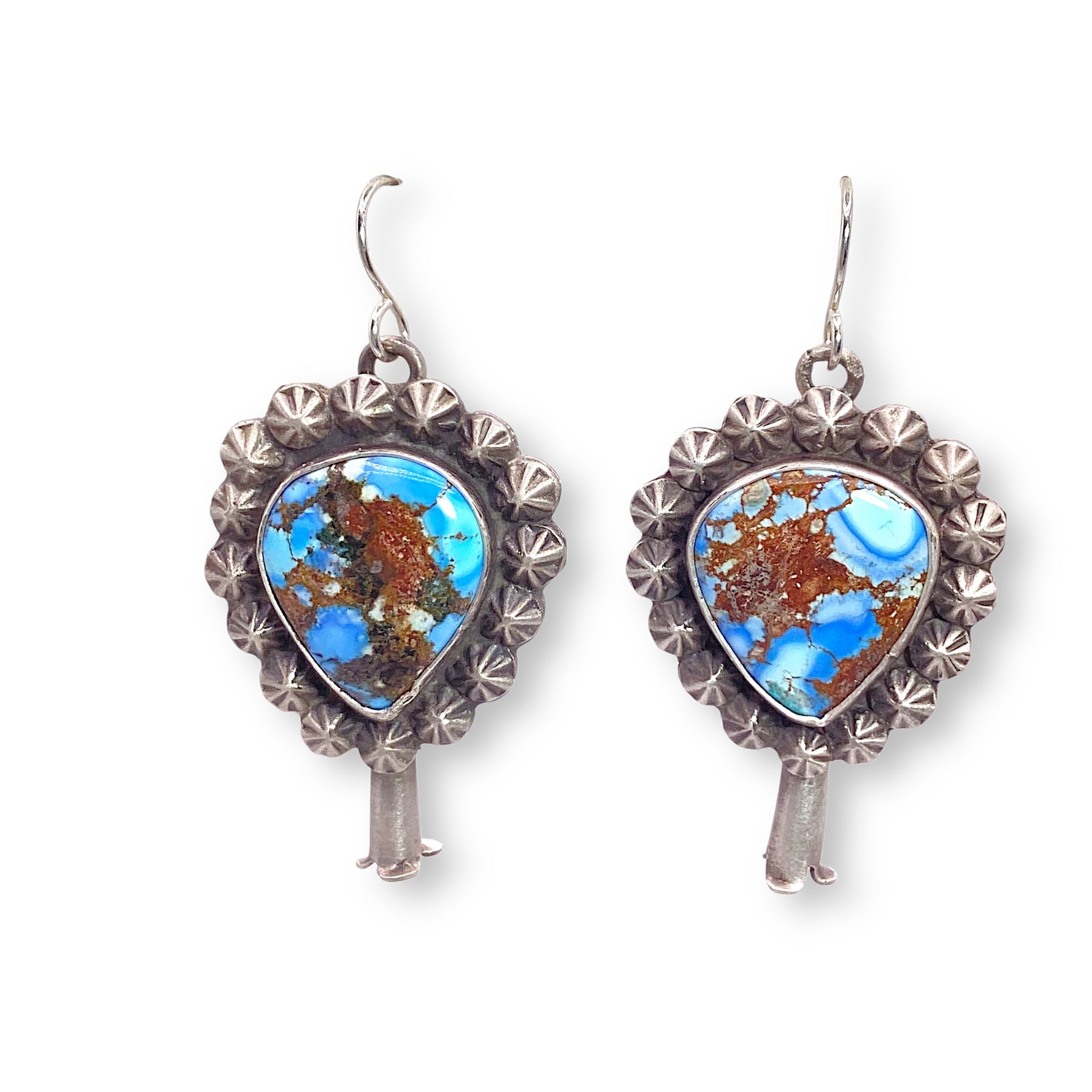 These Leigha Cleveland earrings are handcrafted in sterling silver with a timeless squash blossom design. The dreamy Golden Hills turquoise, with its soft sky-blue tones, glows in smooth bezels that make the stones feel luminous and alive. These earrings bring just the right mix of statement and soul.
