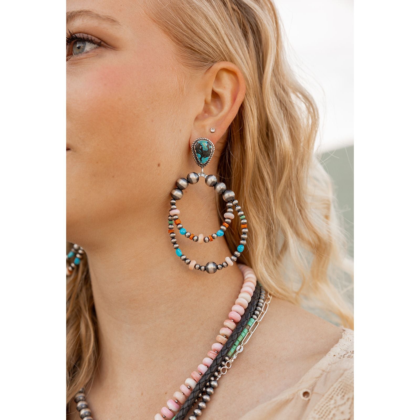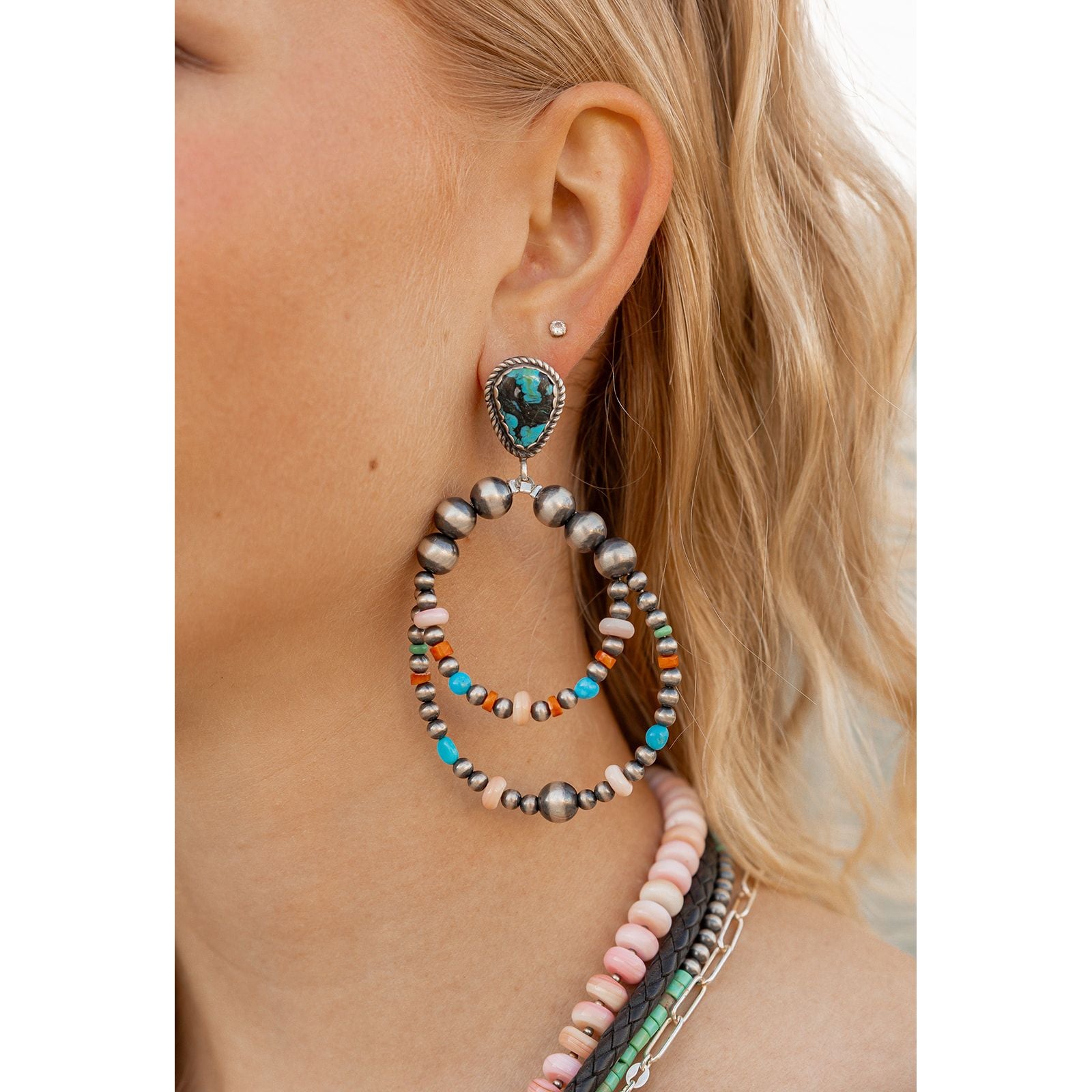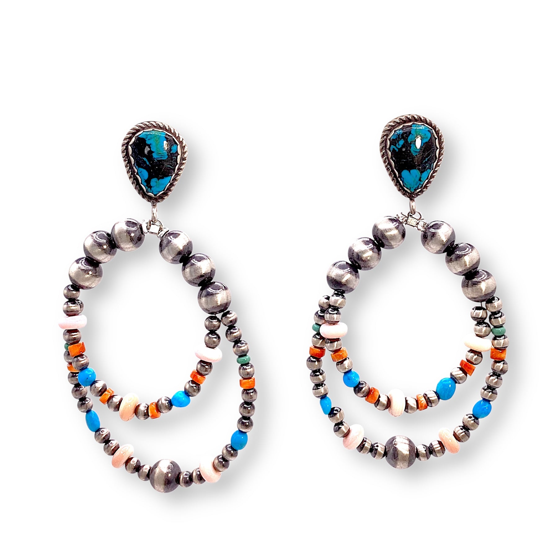 Handcrafted by Navajo artist Leigha Cleveland, these earrings start with a turquoise stud and spill into two playful loops strung with turquoise, Spiny Oyster Shell, pink conch shell, and Navajo pearls.