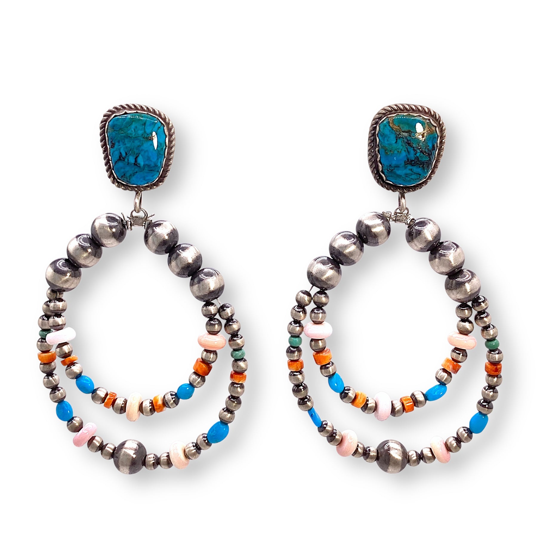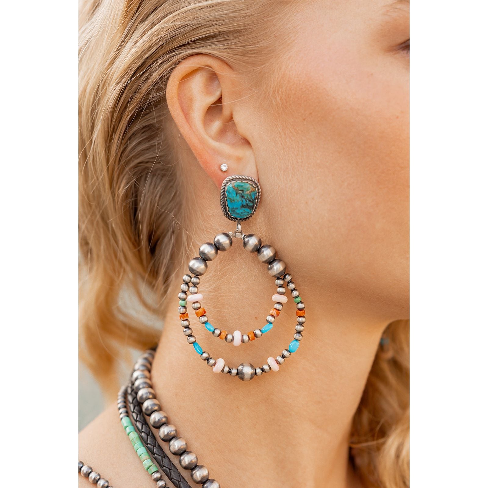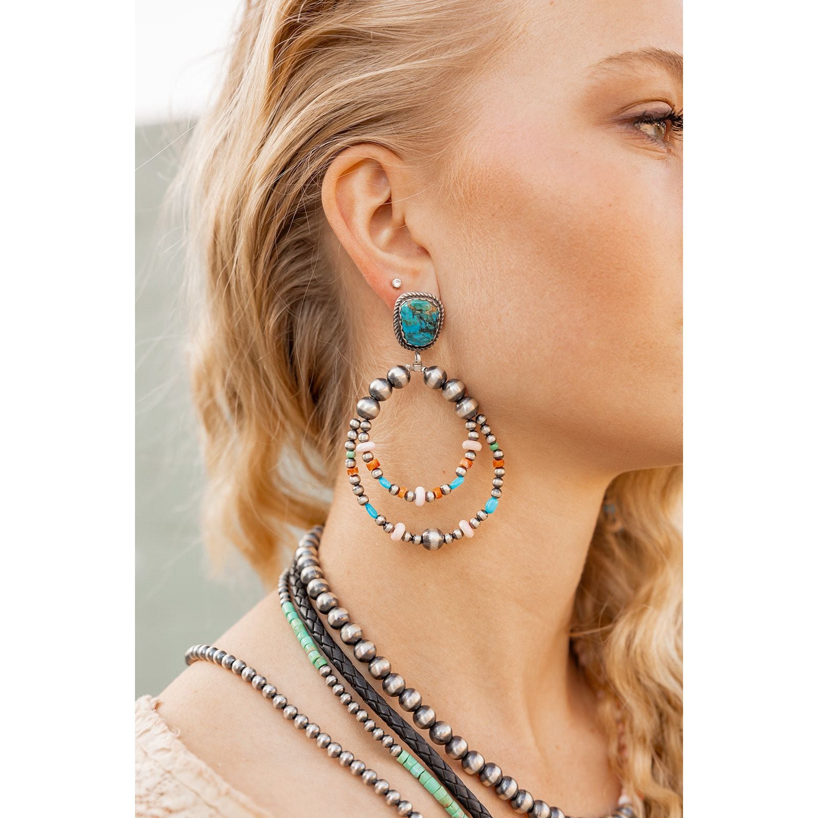 Handcrafted by Navajo artist Leigha Cleveland, these earrings start with a calming turquoise stud and flow into two loops of turquoise, Spiny Oyster Shell, pink Conch Shell, and Navajo pearls, evoking serene Southwestern landscapes.