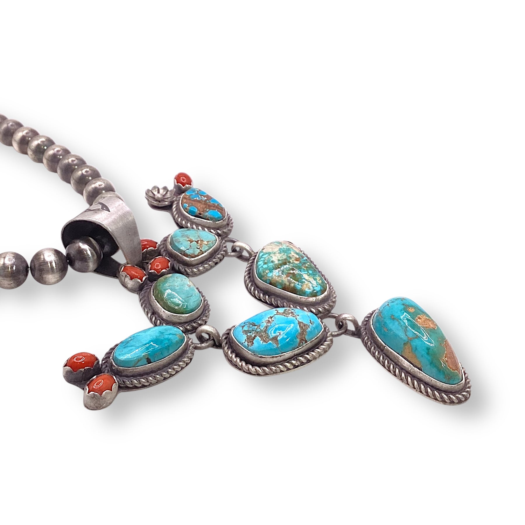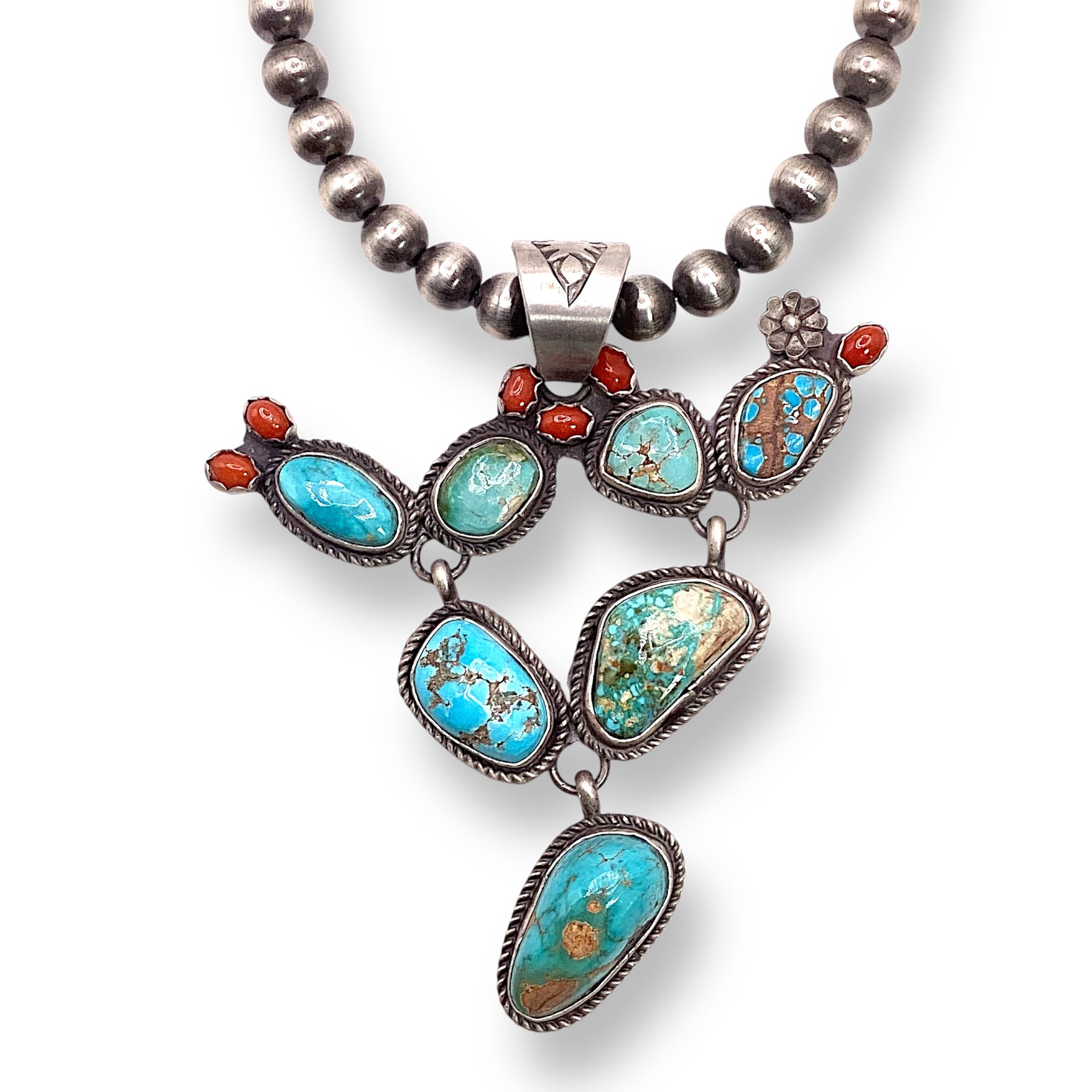Stunning cactus pendant by Navajo silversmith Leigha Cleveland, crafted in sterling silver with bright turquoise stones set in smooth bezels. A playful yet timeless piece that brings a little desert magic to any look.