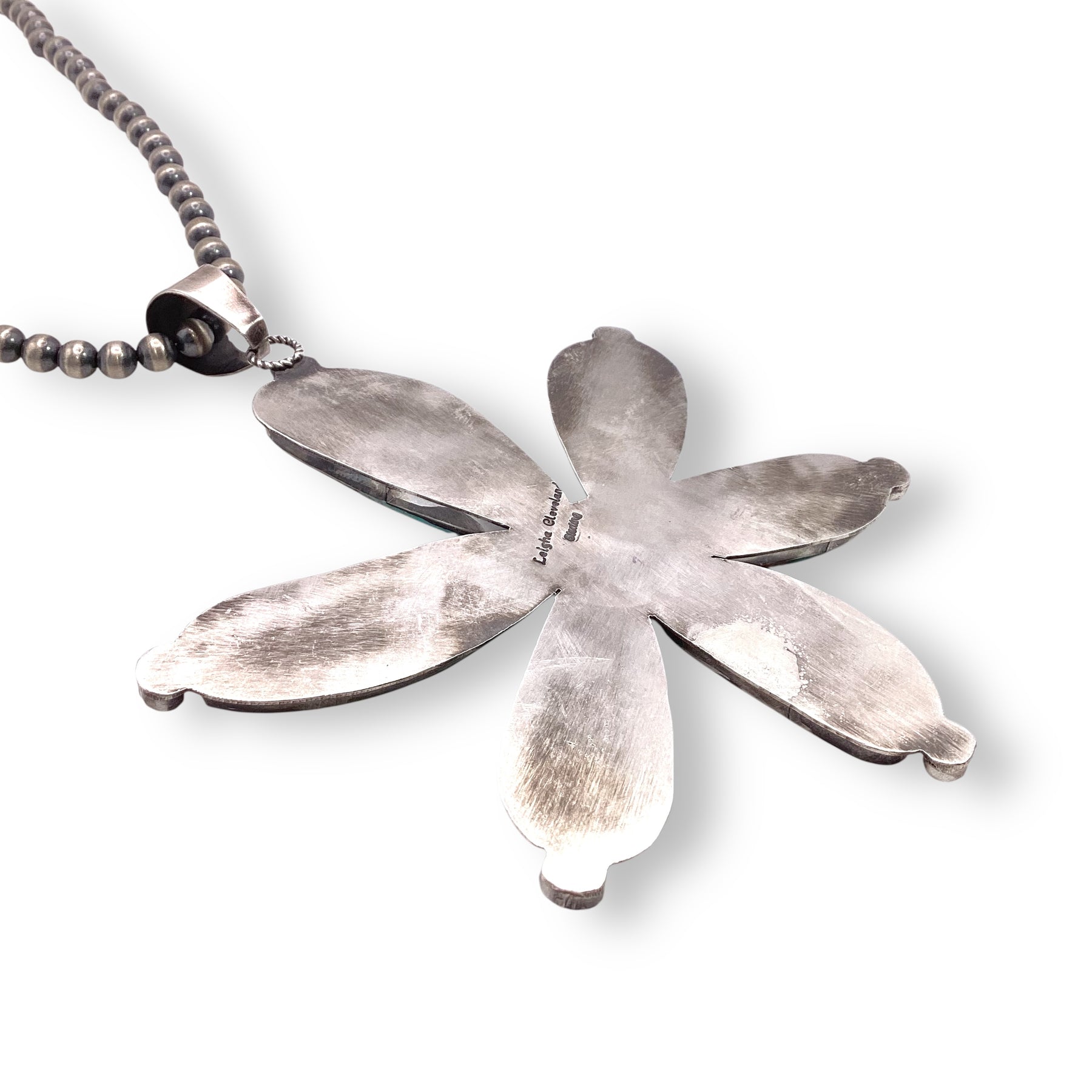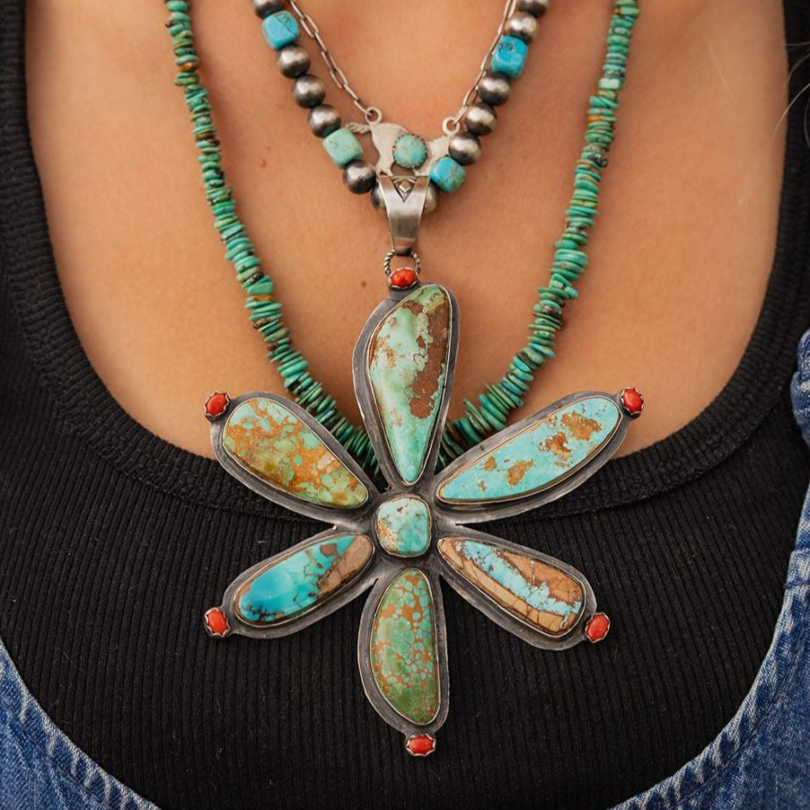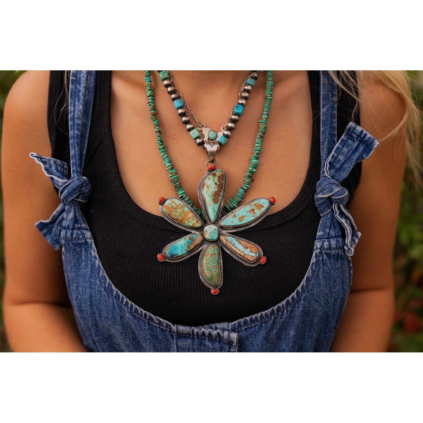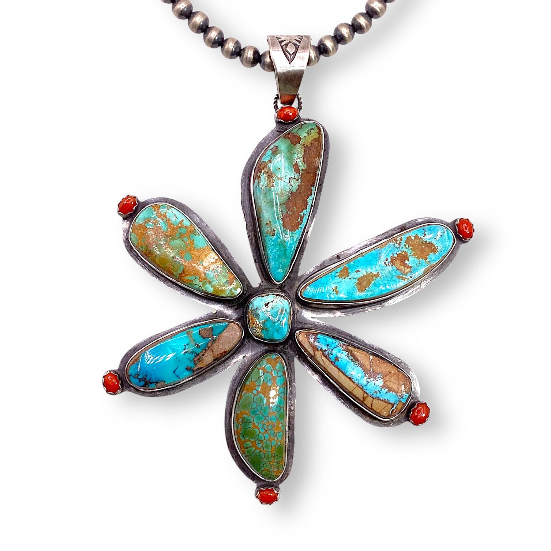 Gorgeous and one-of-a-kind, this pendant by Navajo artist Leigha Cleveland features turquoise stones arranged in a bold flower design, accented with tiny coral embellishments, all set in sterling silver.
