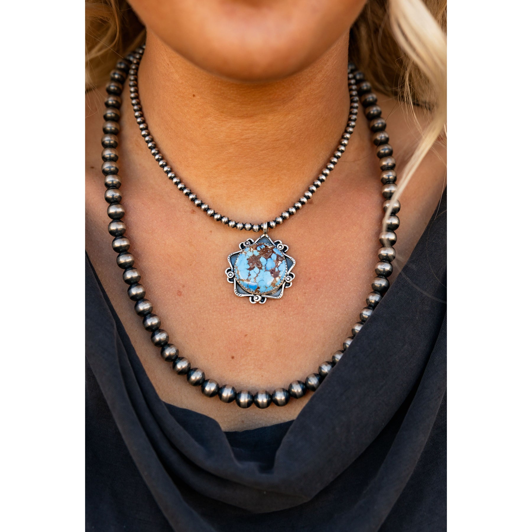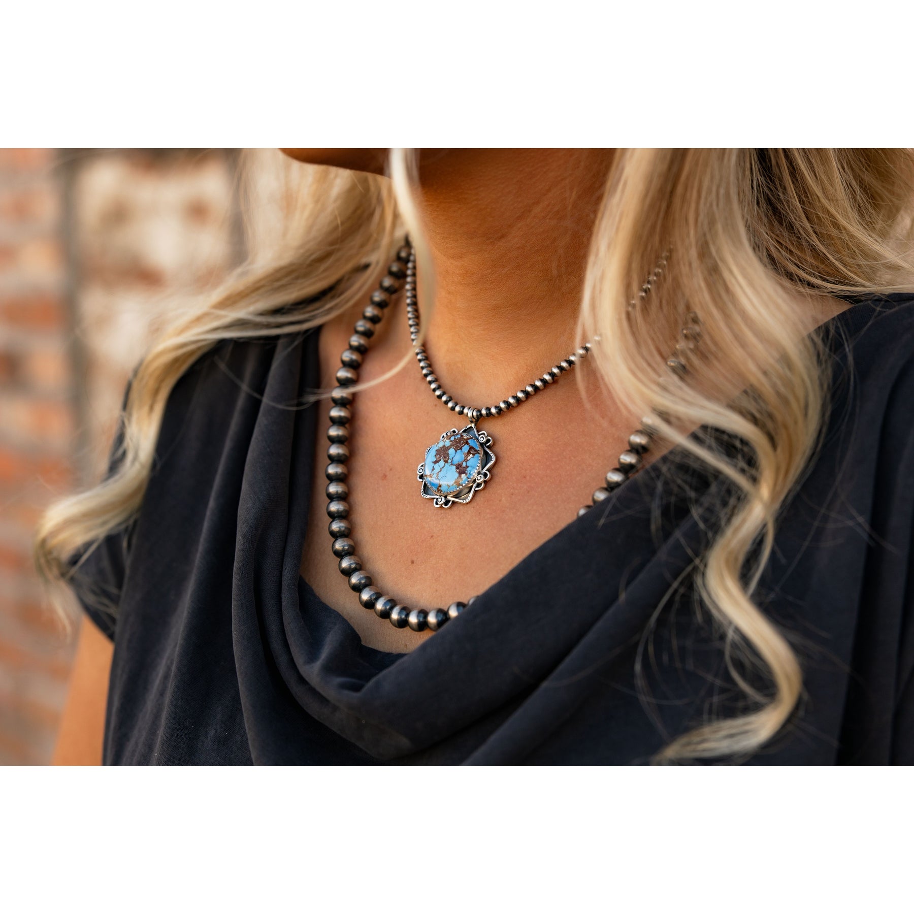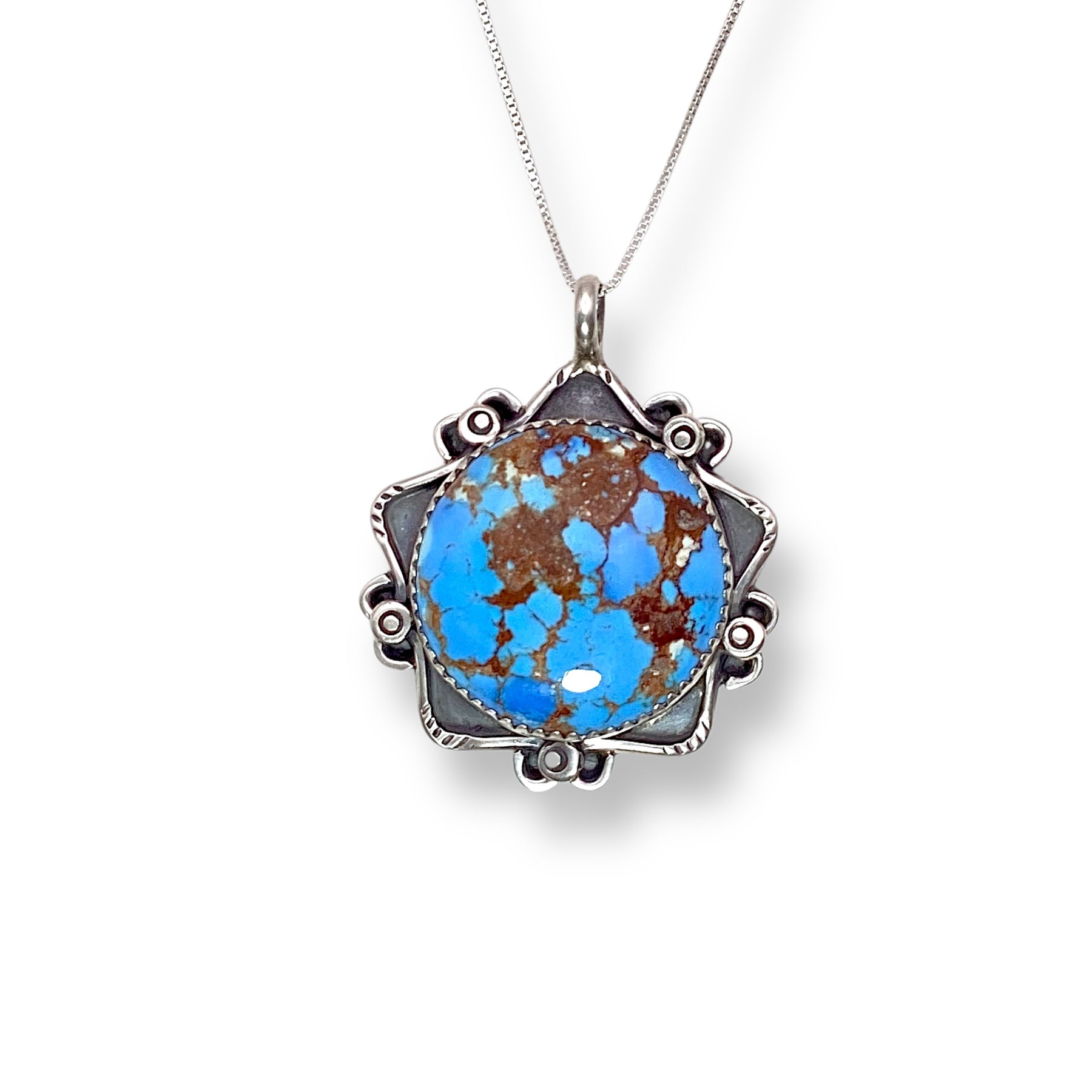 Handcrafted by Navajo artist Lyanne Goodluck, this Golden Hills Turquoise pendant radiates soft beauty with its dreamy periwinkle hues. Set in a classic sawtooth bezel and framed with delicate silverwork, it feels both artful and effortlessly refined — a piece that carries quiet strength and desert-sky charm.