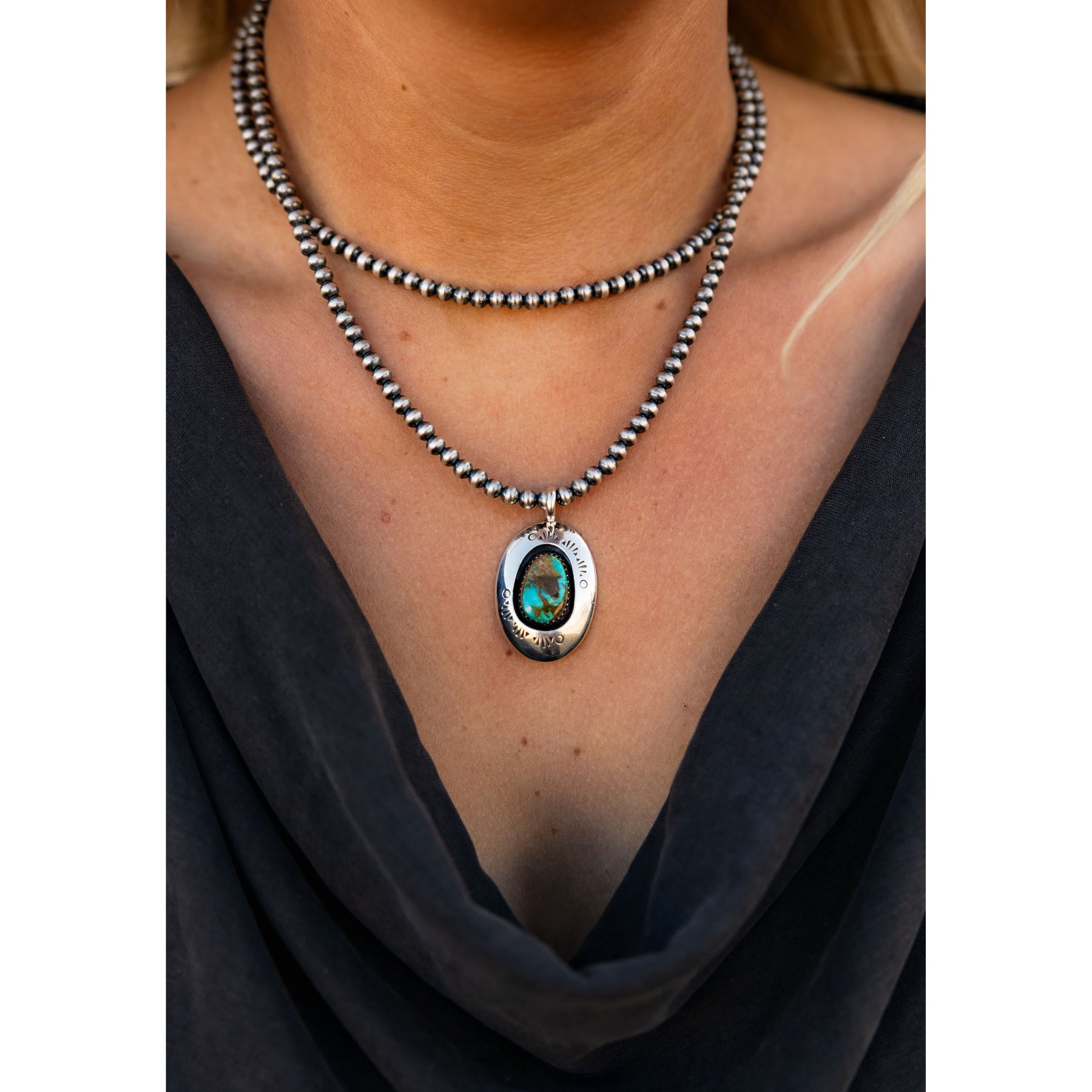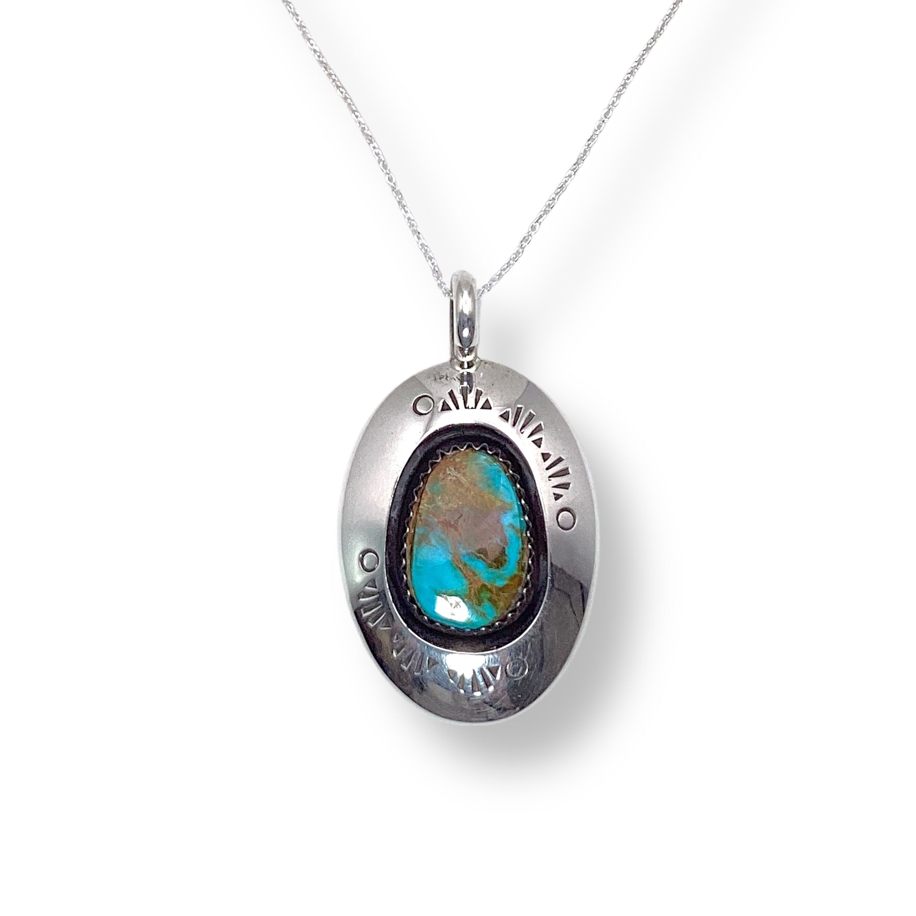 Handcrafted by Navajo artist Lyanne Goodluck, this striking pendant showcases a vibrant Royston turquoise stone set in a bold sawtooth bezel, framed by a strong shadowbox of sterling silver with powerful Southwestern stamping. A true statement piece that commands attention.