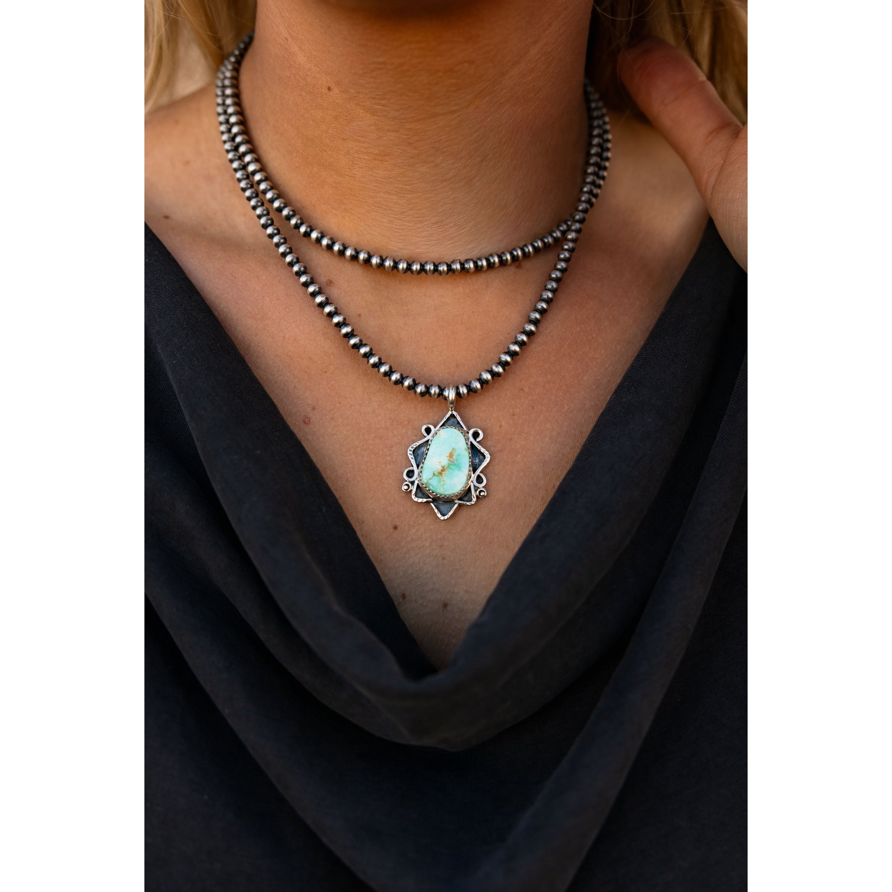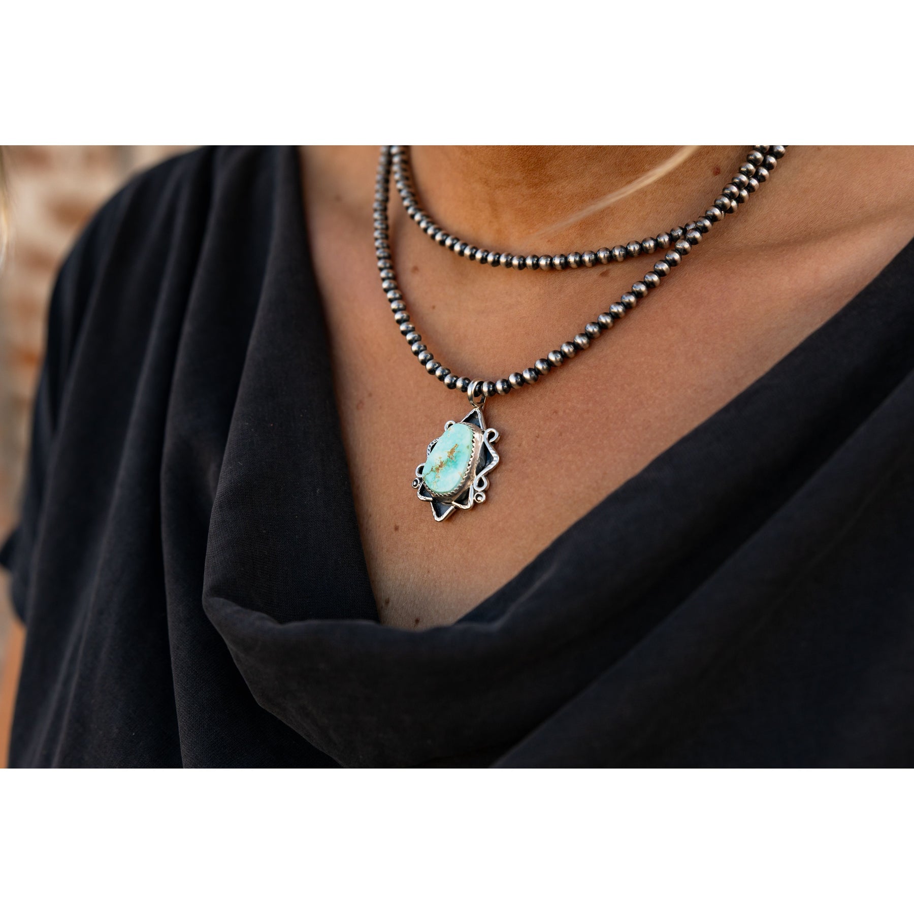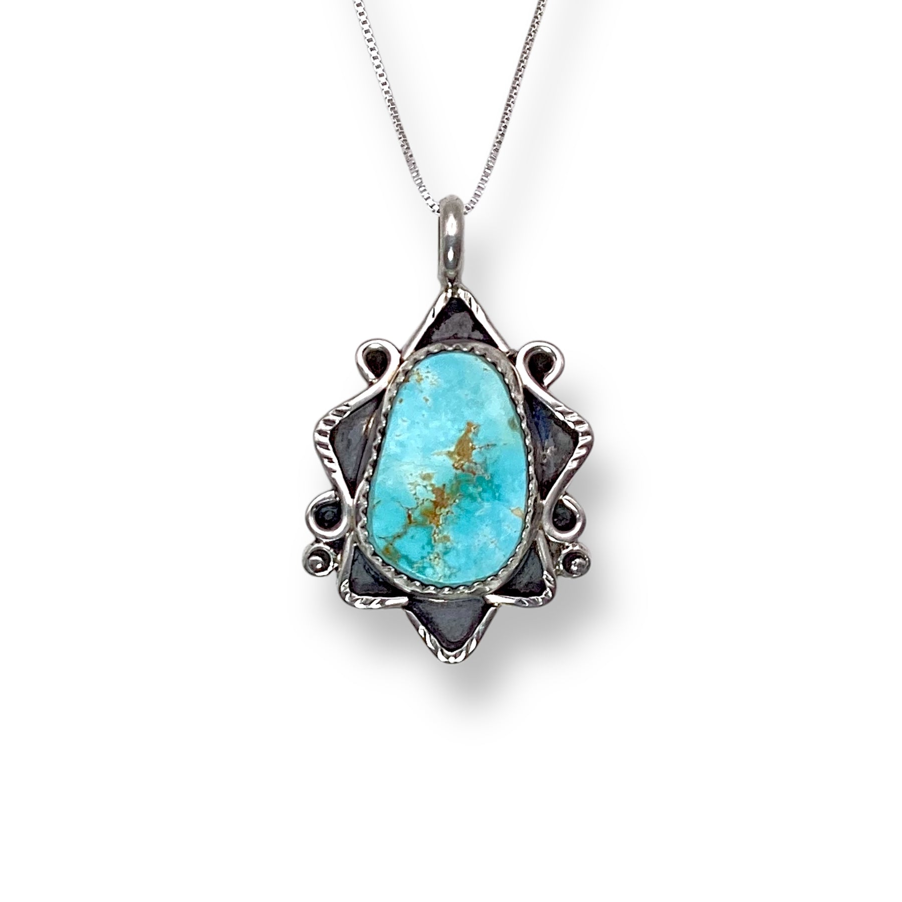 Handmade by Navajo artist Lyanne Goodluck, this pendant feels like a little slice of desert magic you can wear. The Royston Turquoise — all dreamy greens and blues — rests in a sawtooth bezel with soft, soulful silverwork that gives it that perfectly lived-in, free-spirited feel. It’s the kind of piece that looks like it’s already been on a few adventures.