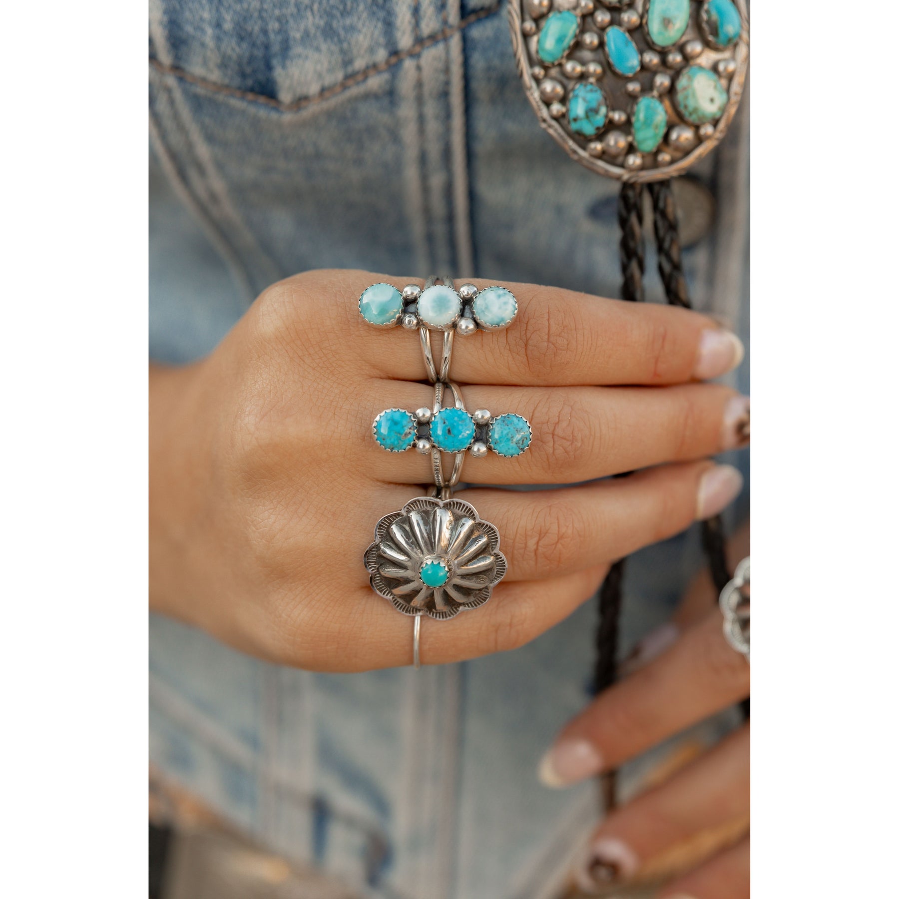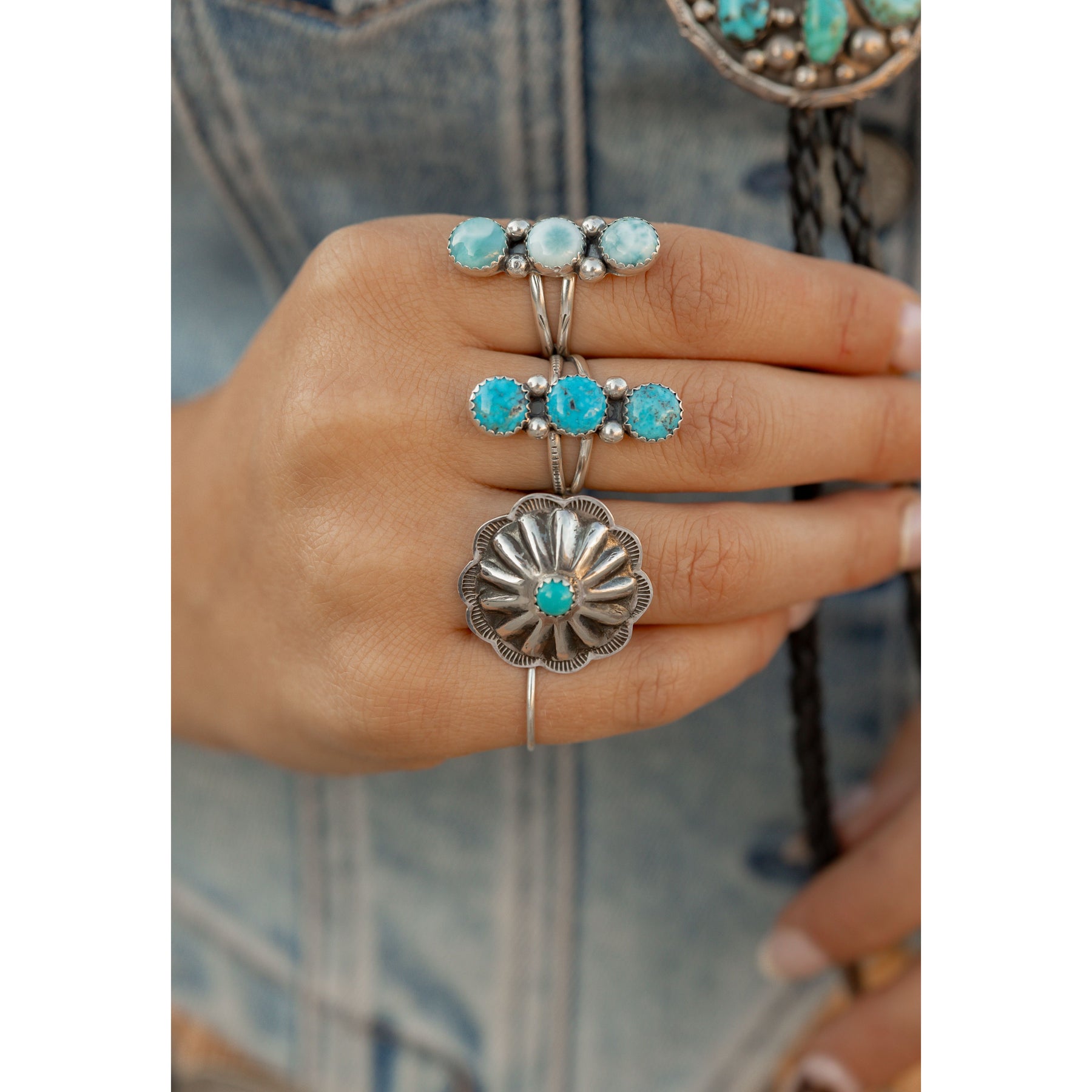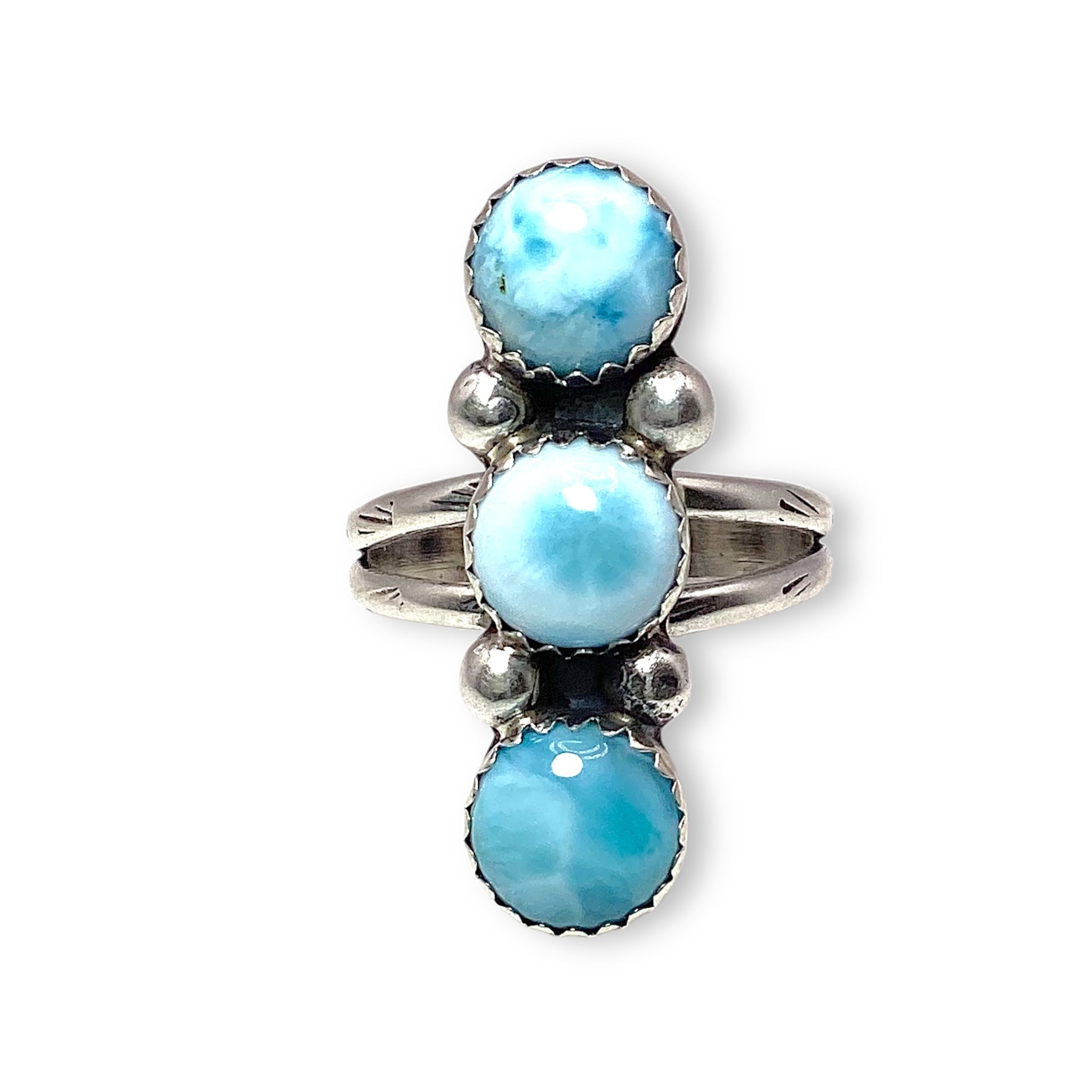Handcrafted by Navajo artist Lyanne Goodluck, this stunning row ring features three dreamy Larimar stones set in sterling silver sawtooth bezels. Each stone brings soft ocean-blue hues that feel both grounding and ethereal, wrapped in timeless Southwestern style.