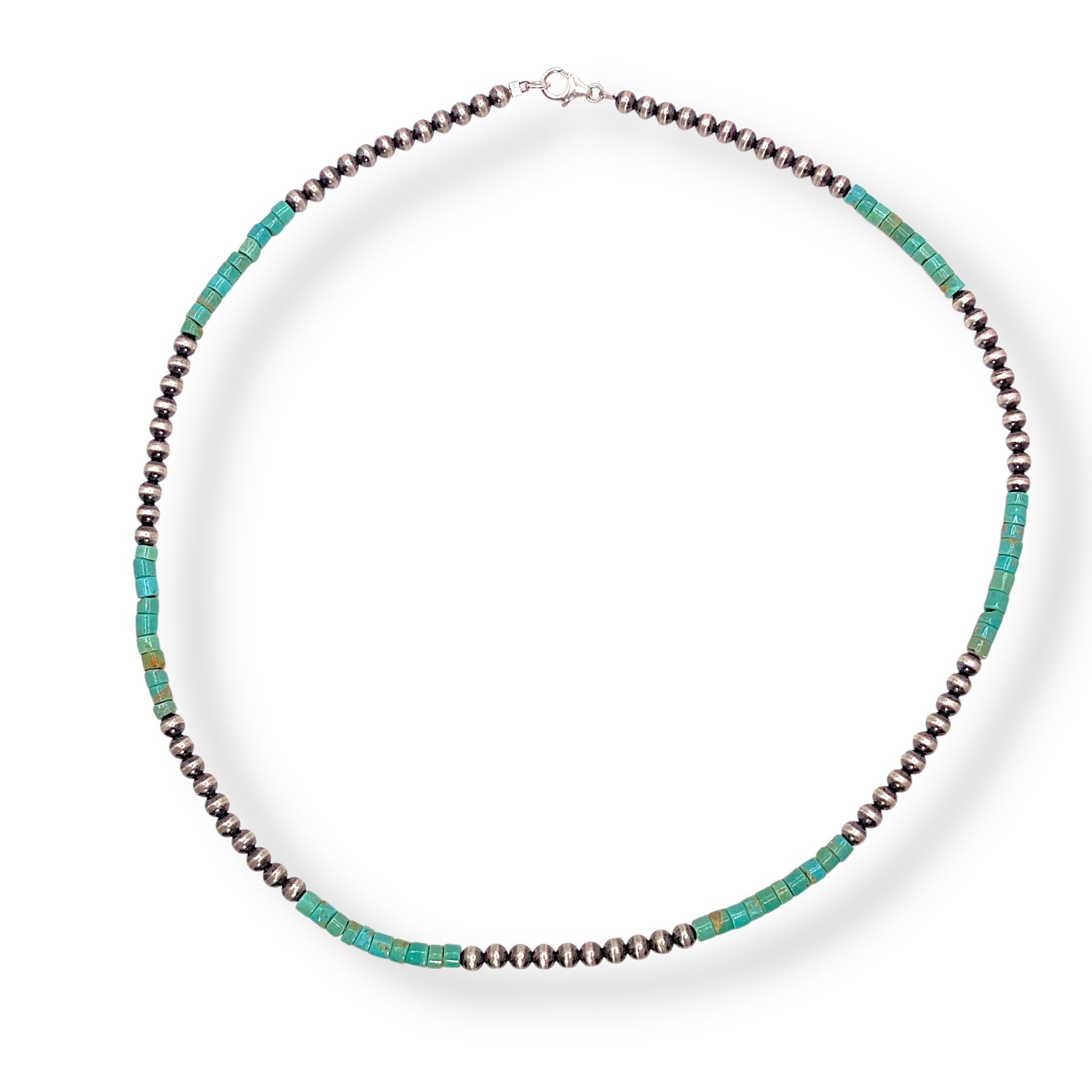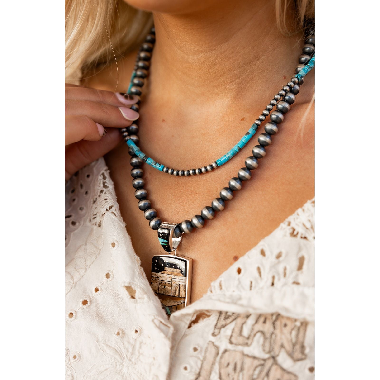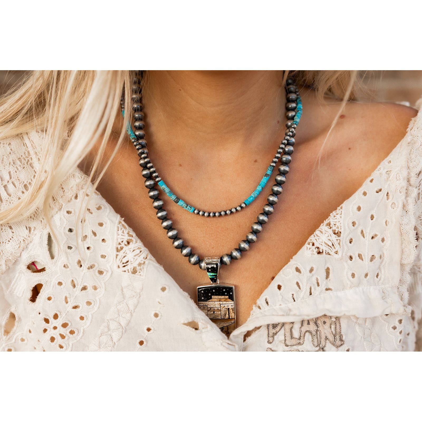 A Lantern Dancer original, this Heishi Turquoise and Navajo Pearl Necklace captures timeless Southwestern elegance. Smooth turquoise beads and polished silver pearls come together in a look that’s both classic and effortlessly refined.