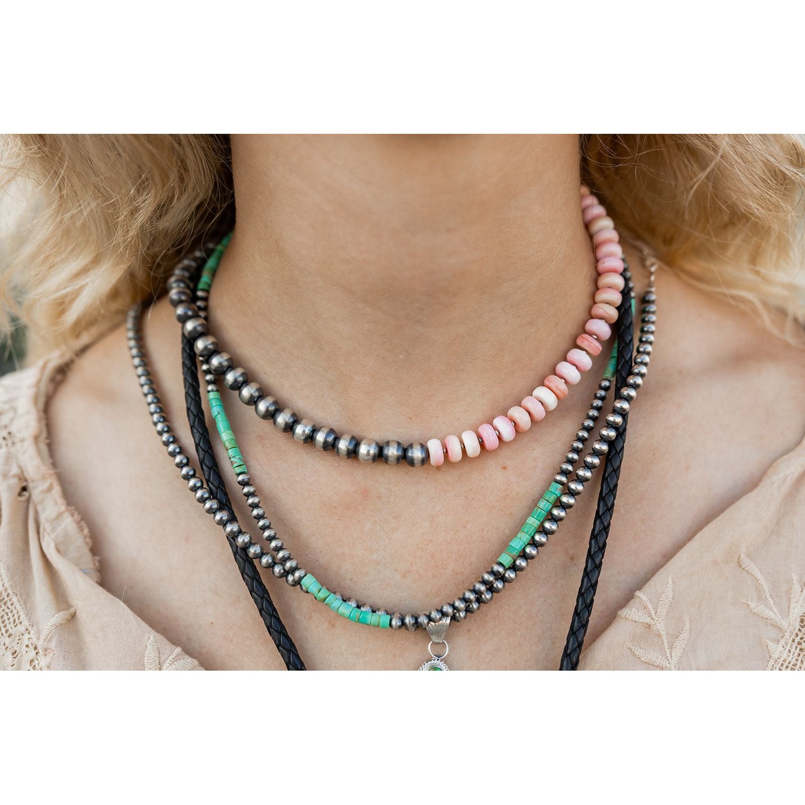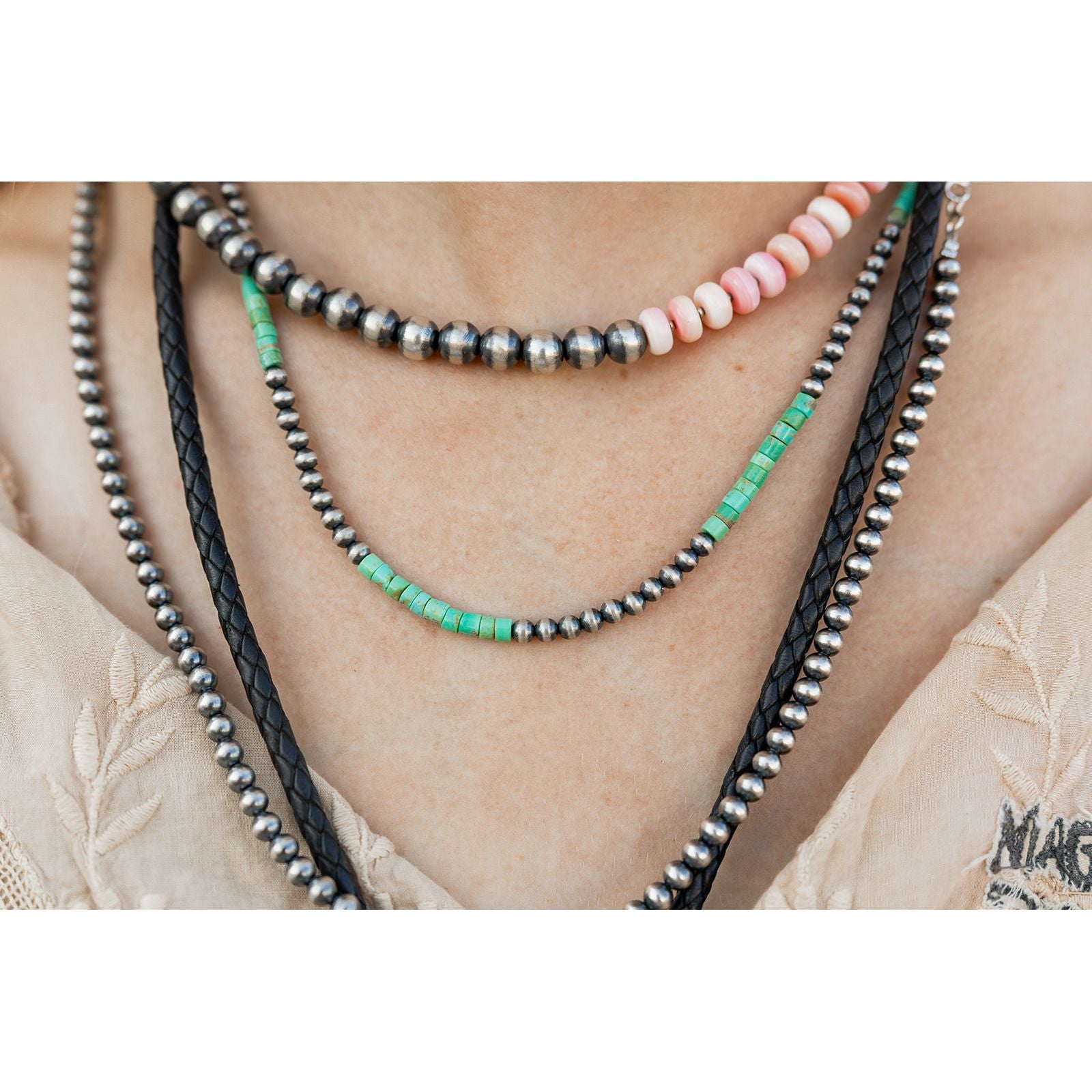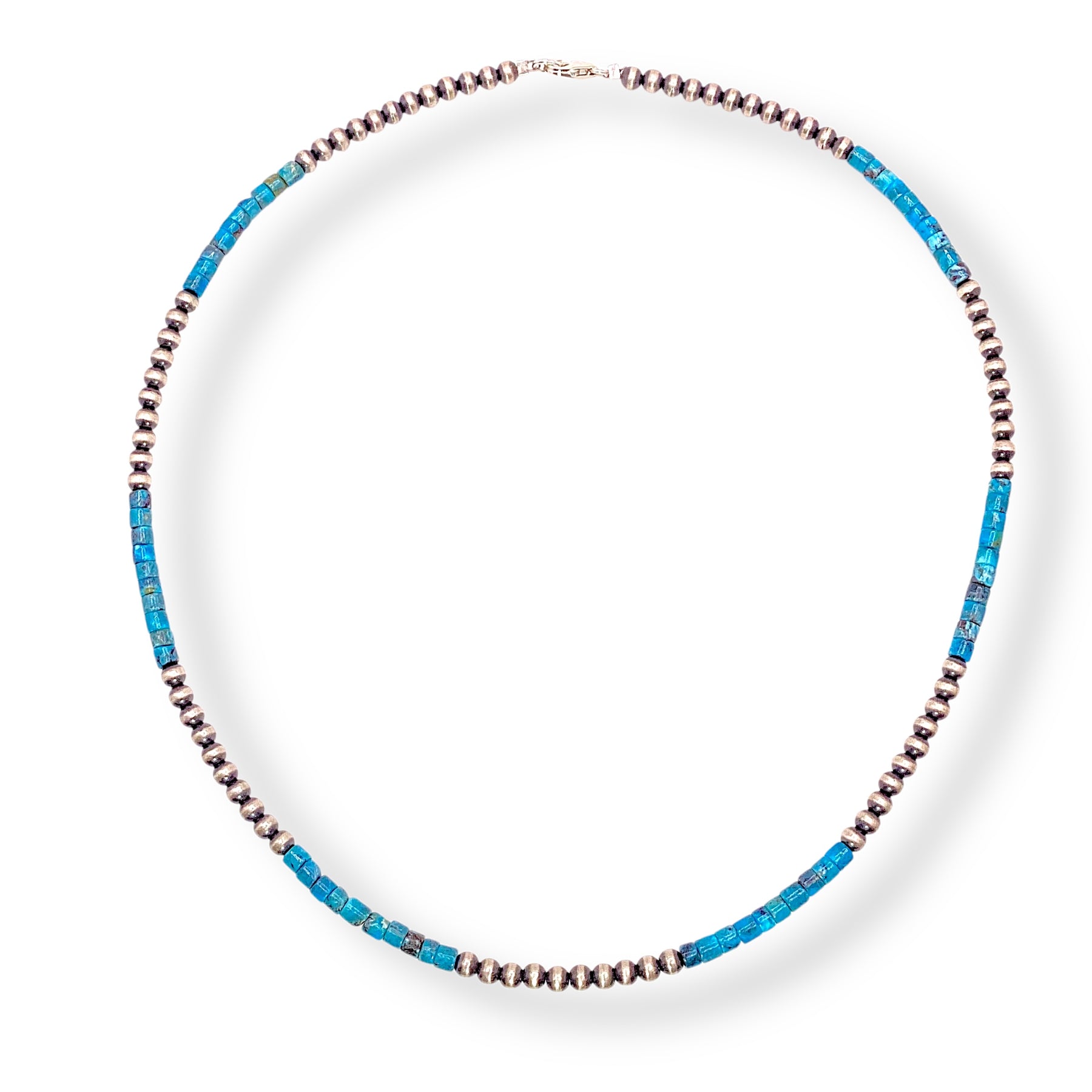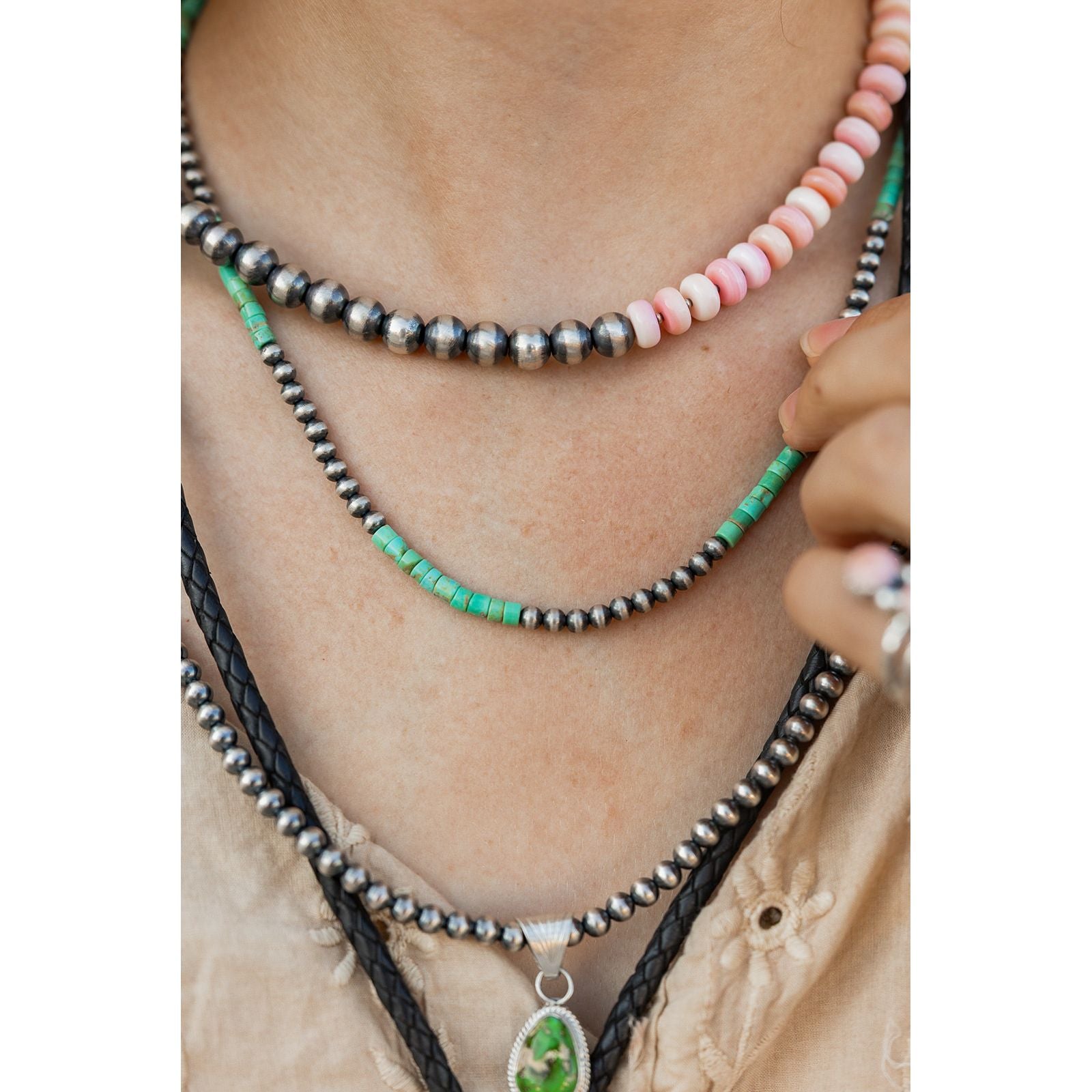 A Lantern Dancer original, this Heishi Turquoise and Navajo Pearl Necklace captures timeless Southwestern elegance. Smooth turquoise beads and polished silver pearls come together in a look that’s both classic and effortlessly refined.