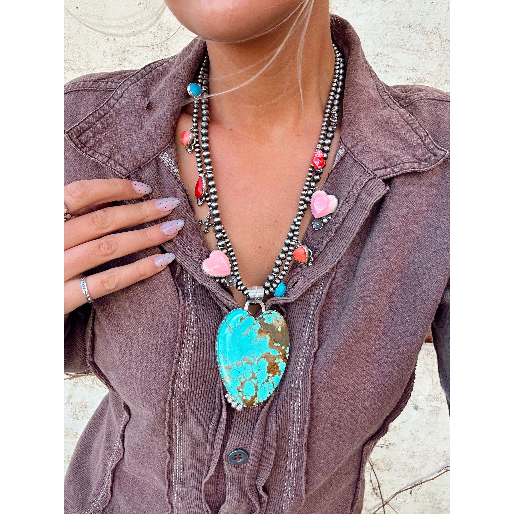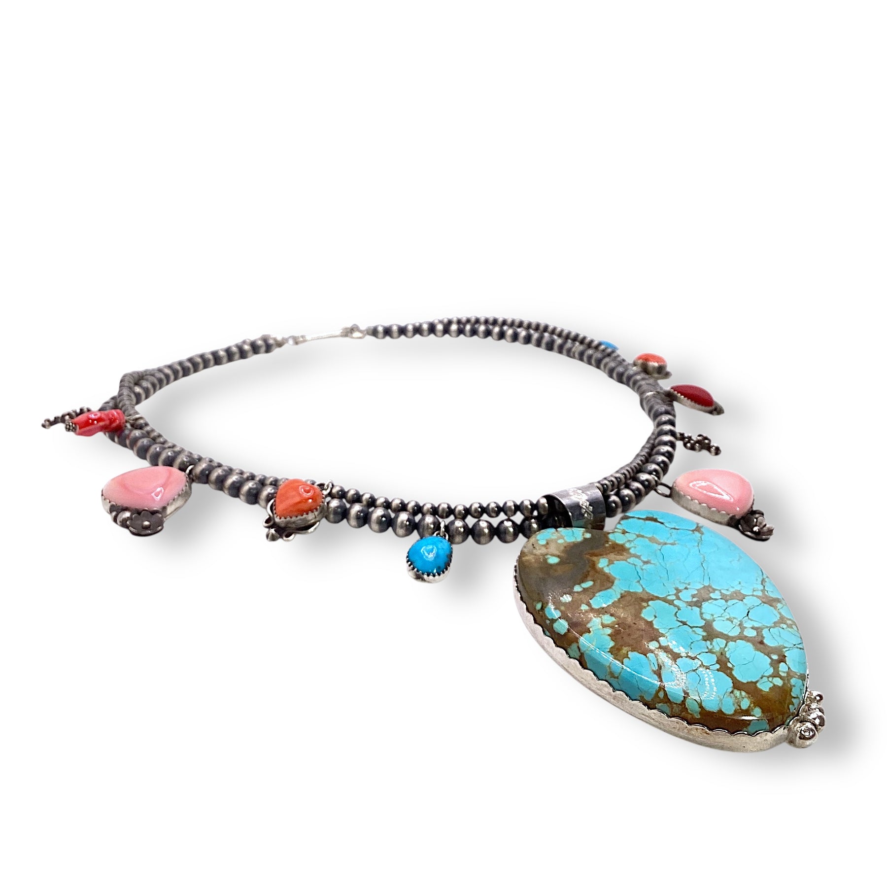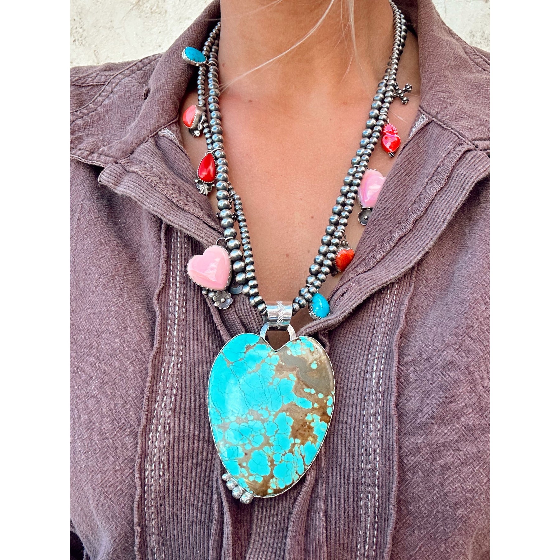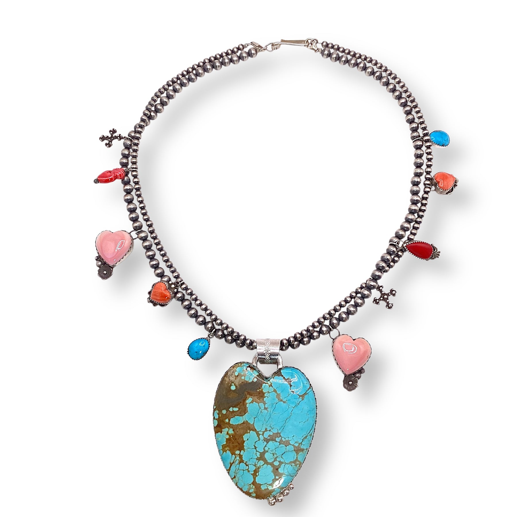 This one-of-a-kind necklace is a true celebration of Southwestern artistry, brought to life through a collaboration of talented artists including Michael Silberhorn, Leigha Cleveland, Mary Tso, Lantern Dancer, and Ristra Ranch. At its center is a large Number 8 Turquoise heart, framed by conch shell, spiny oyster shell, and turquoise stones, all strung across two elegant Navajo pearl strands. Bold, vibrant, and meticulously handcrafted, it’s a statement piece that combines color, texture, and tradition.