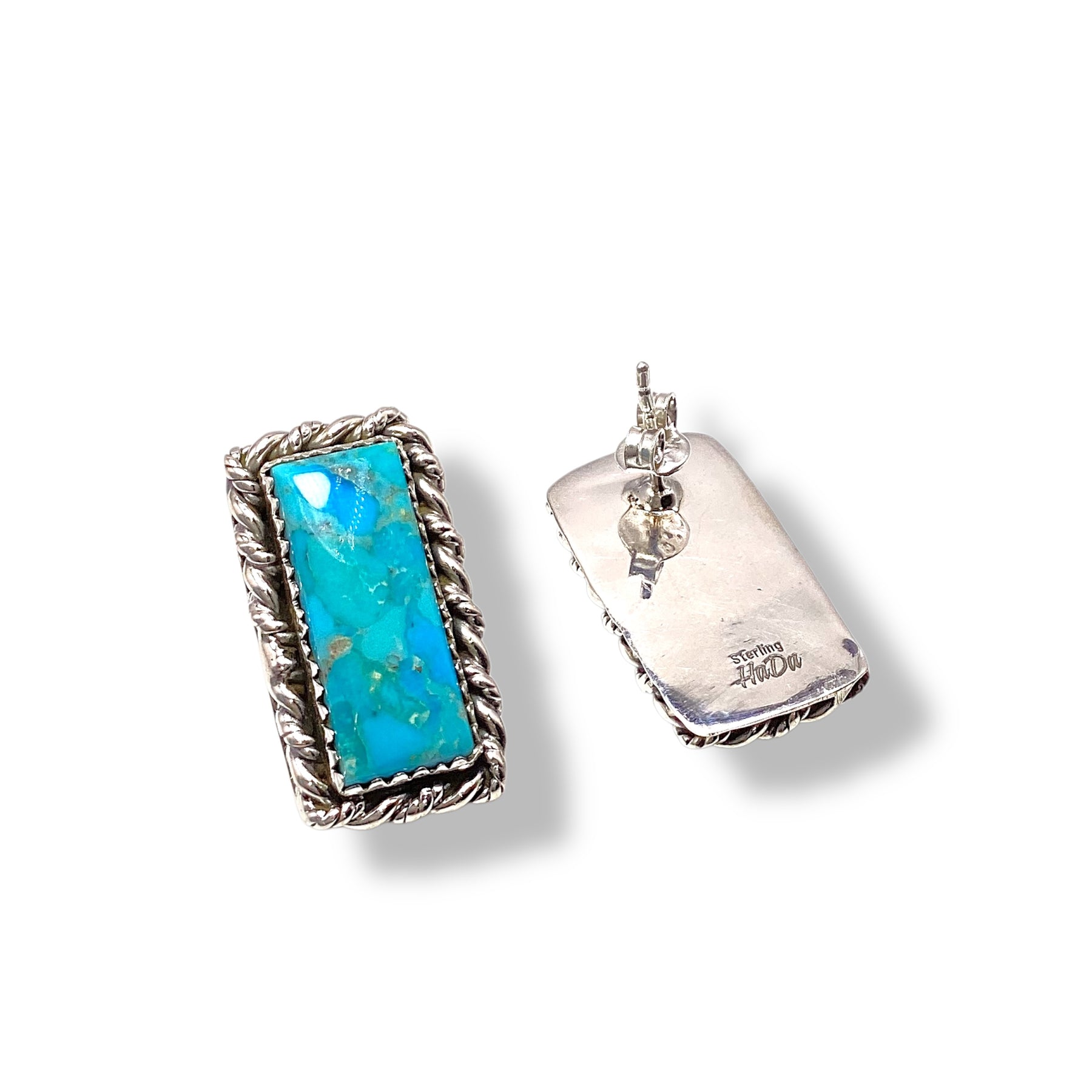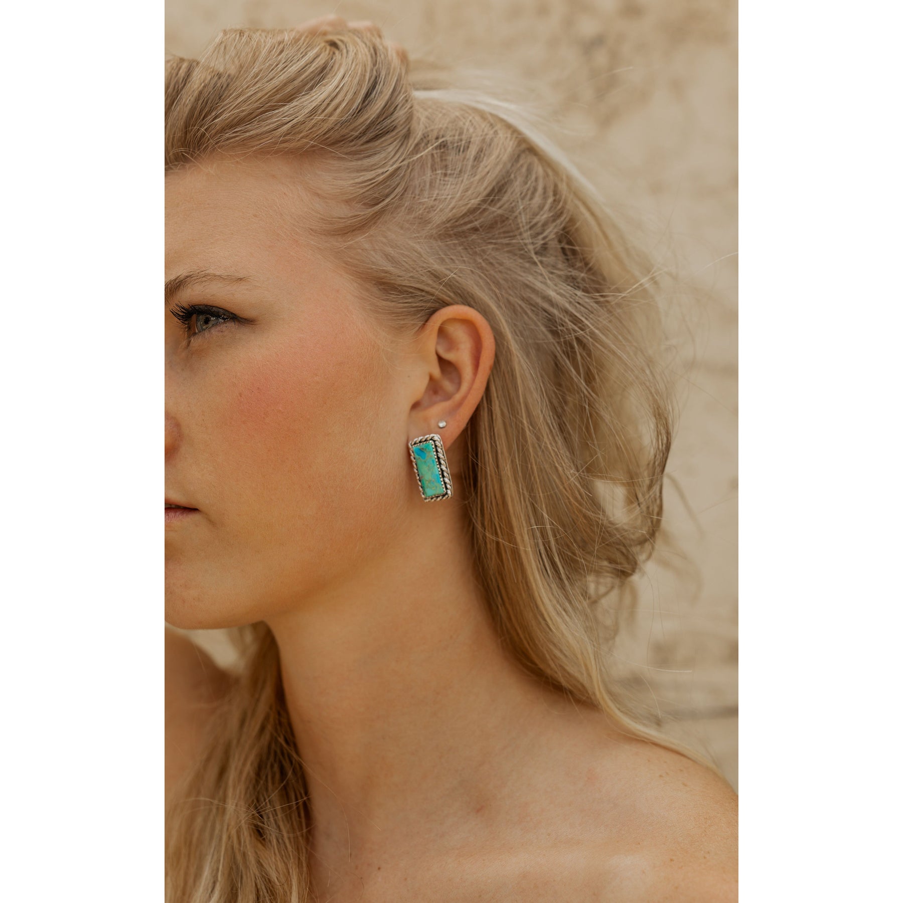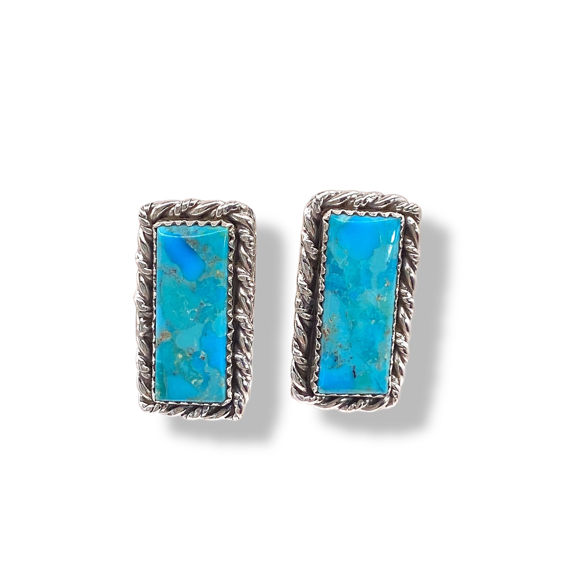 Long, slender bars of turquoise are set in sterling silver sawtooth bezels, finished with delicate braided silver. A classic silhouette with just the right touch of Southwestern charm.