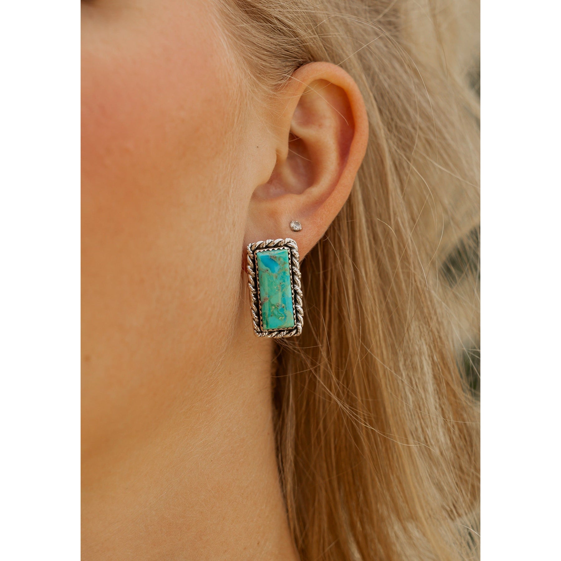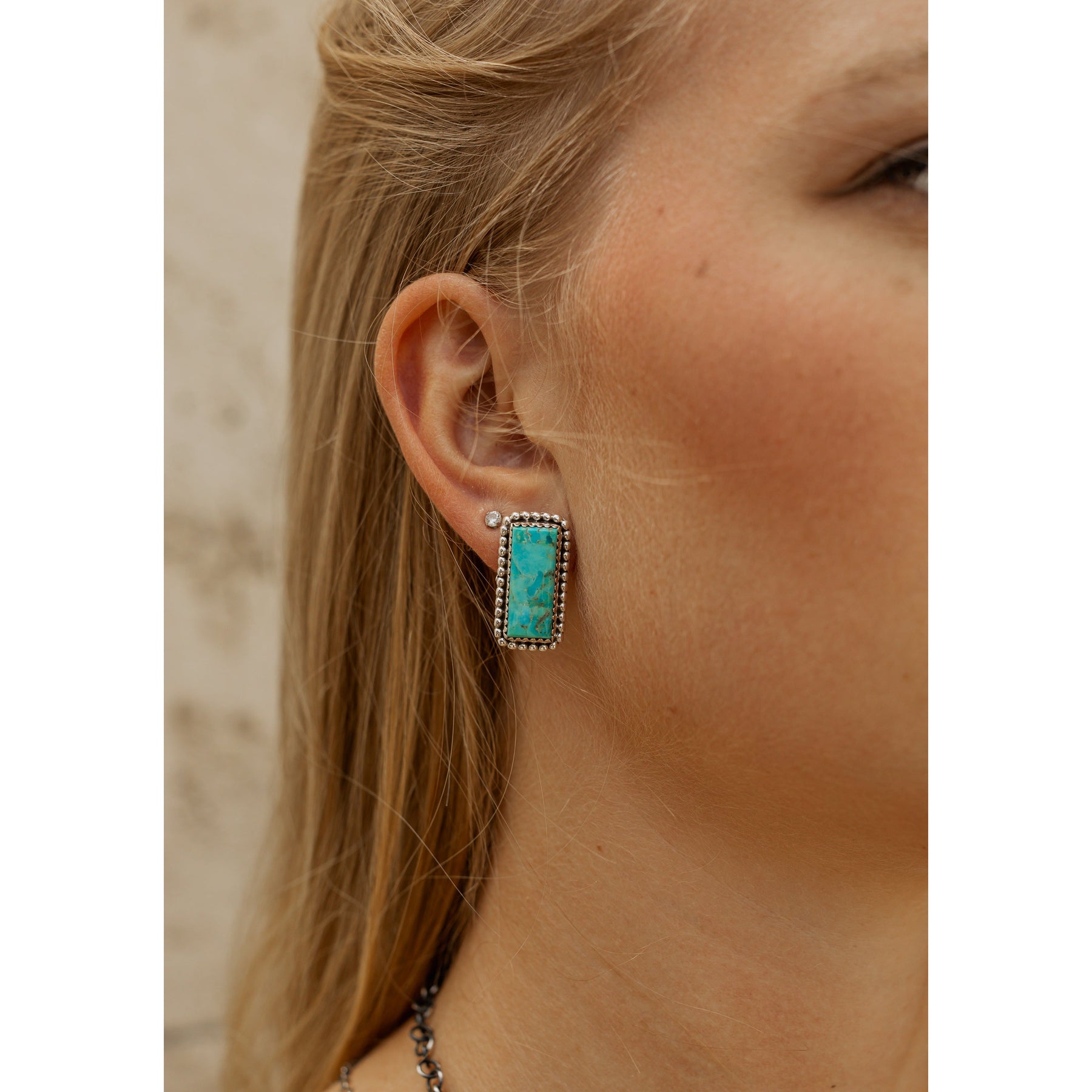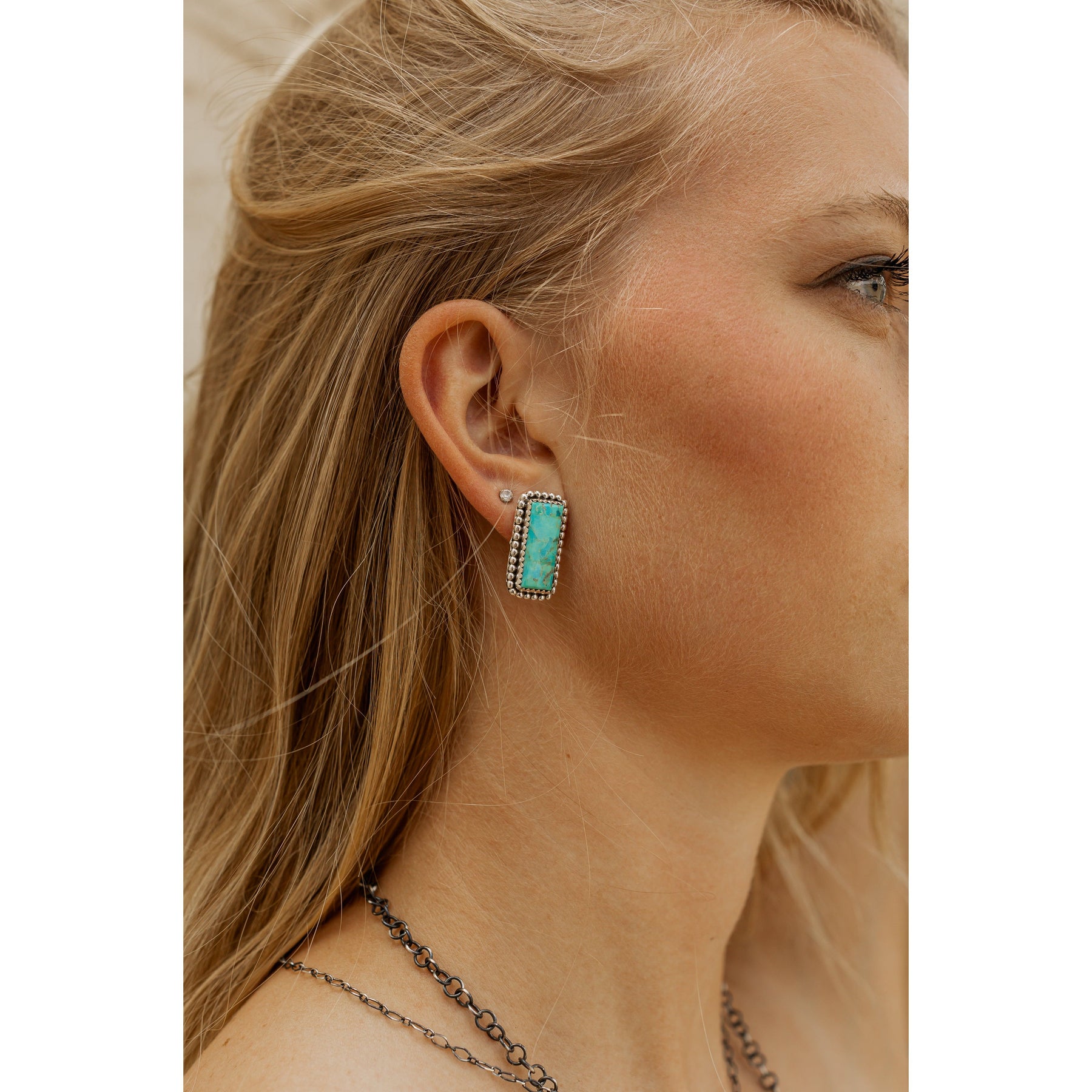 Long, slender bars of turquoise are set in sterling silver sawtooth bezels, finished with delicate braided silver. A classic silhouette with just the right touch of Southwestern charm.