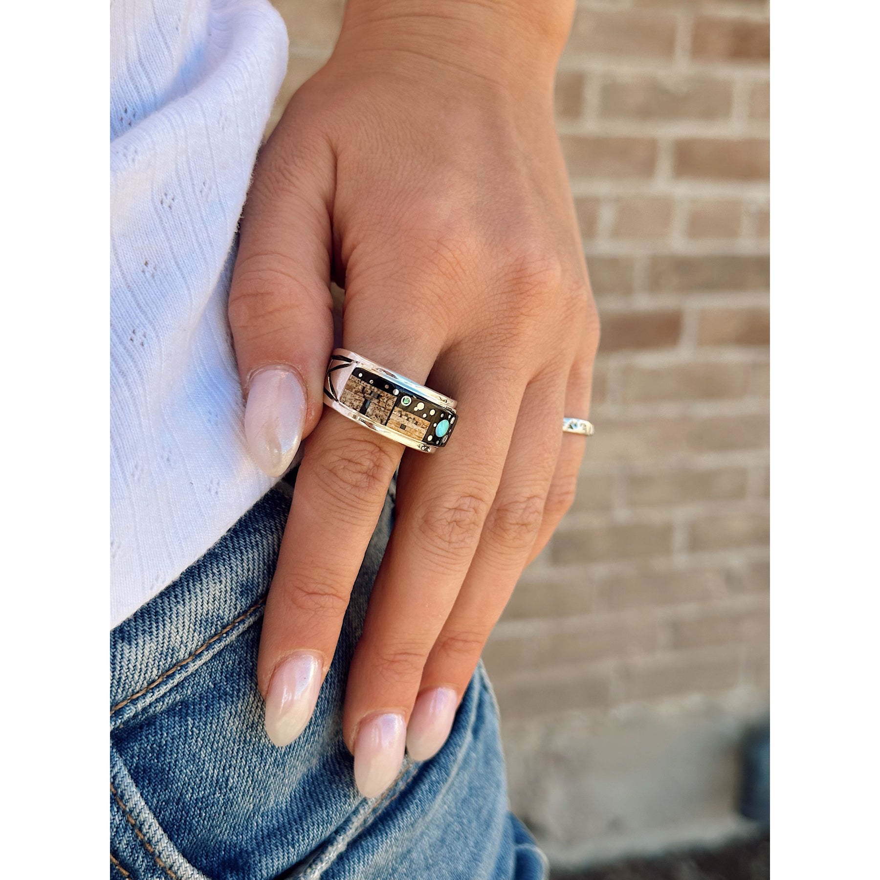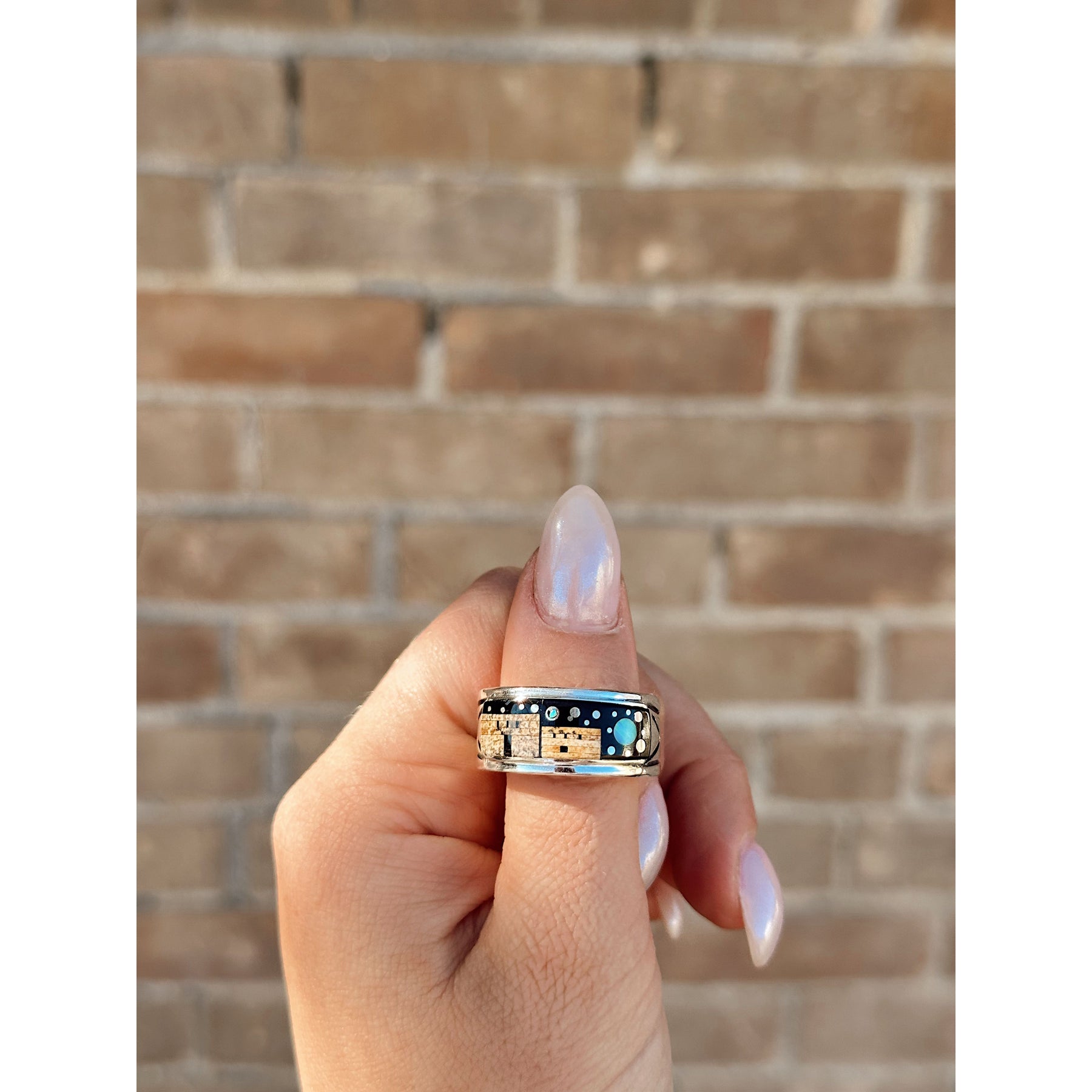 Why We ❤ It: Calvin Begay's work continues to impress. This handcrafted ring showcases the beauty of the the architecture of the Santo Domingo's tribe with gorgeous night sky. This ring is sure to enhance any outfit.