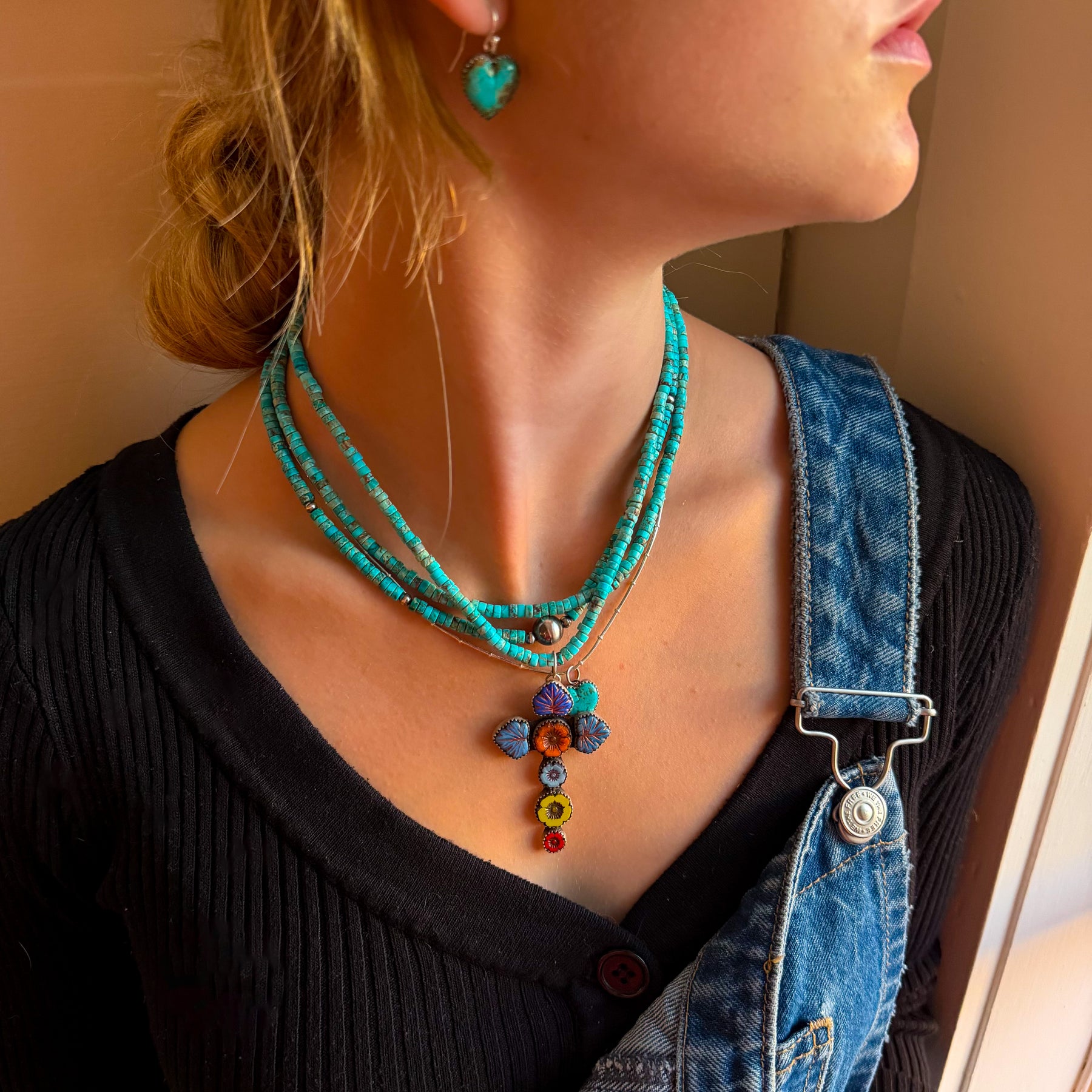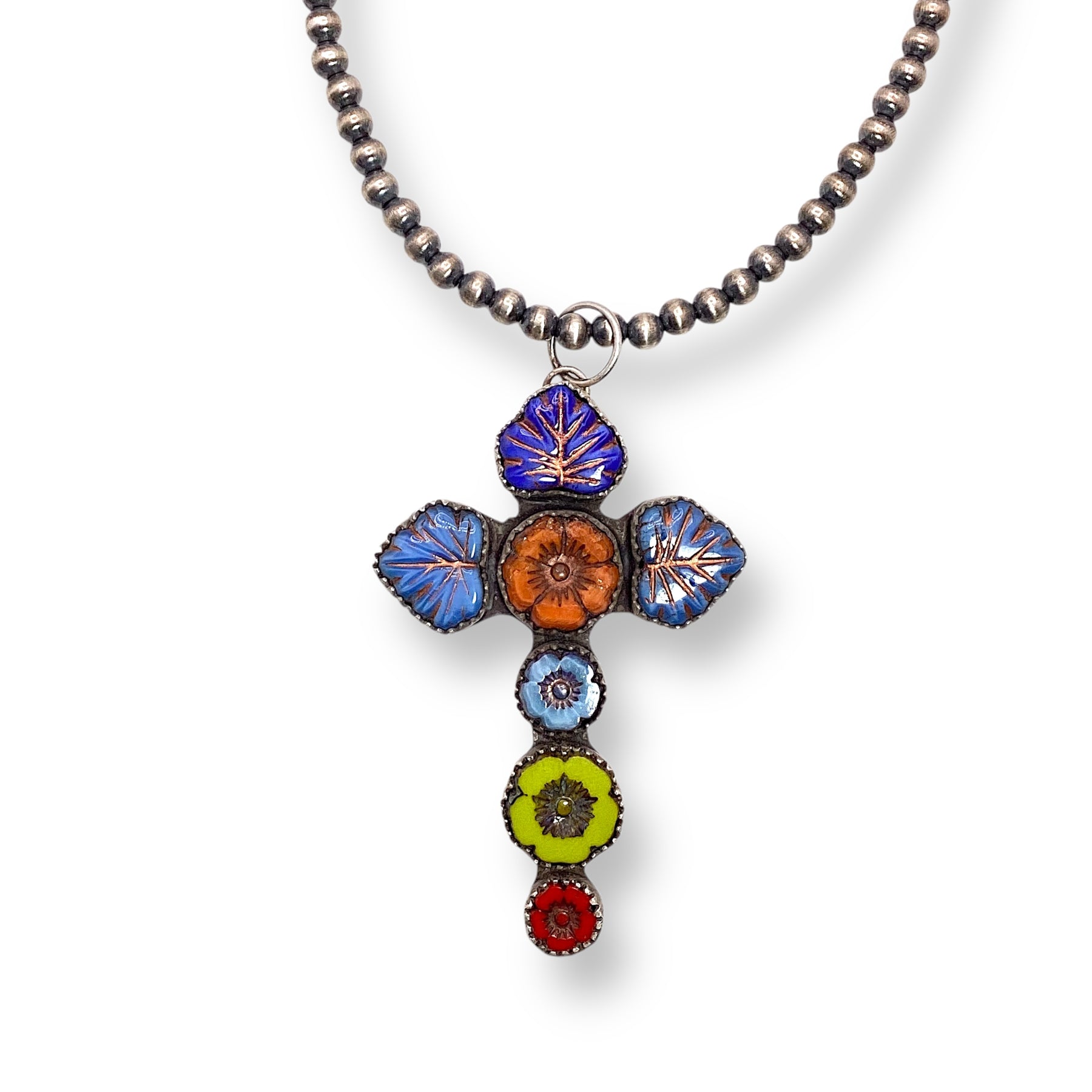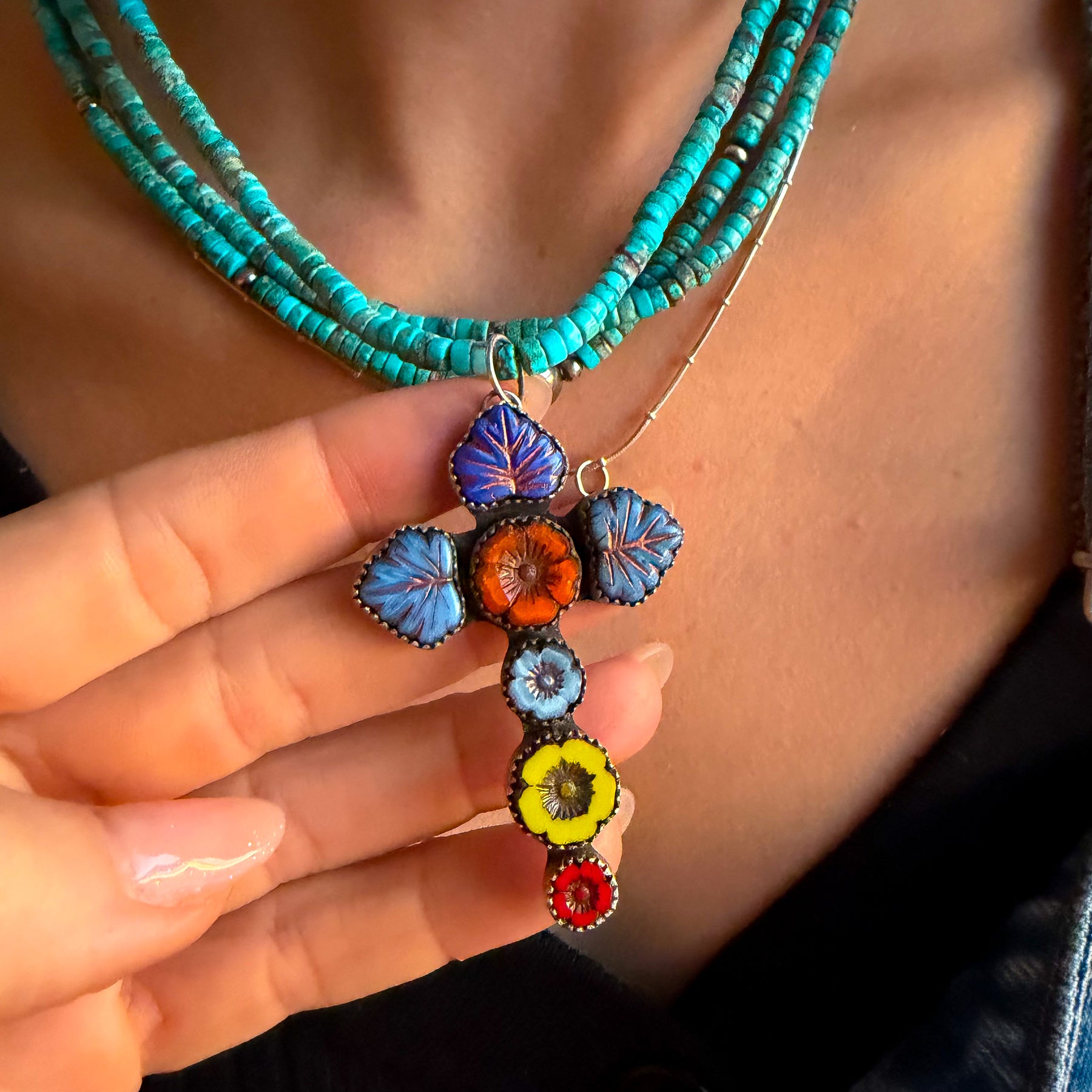 Handcrafted by Ristra Ranch, this pendant turns a classic cross into a vibrant statement piece. The cross is composed of individual, multi-colored flowers, set in sterling silver to create a bold, eye-catching design full of life and texture. It’s a fearless, original take on a timeless symbol.