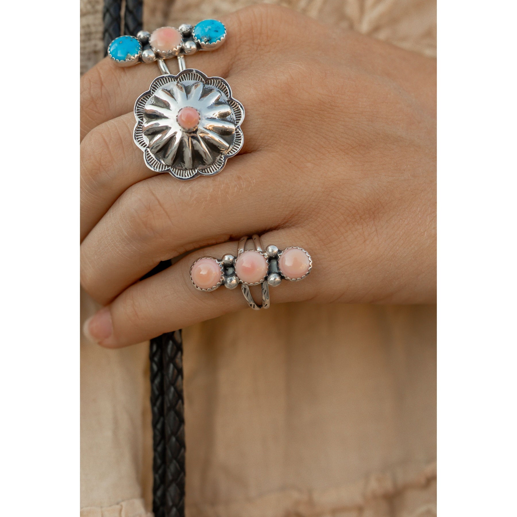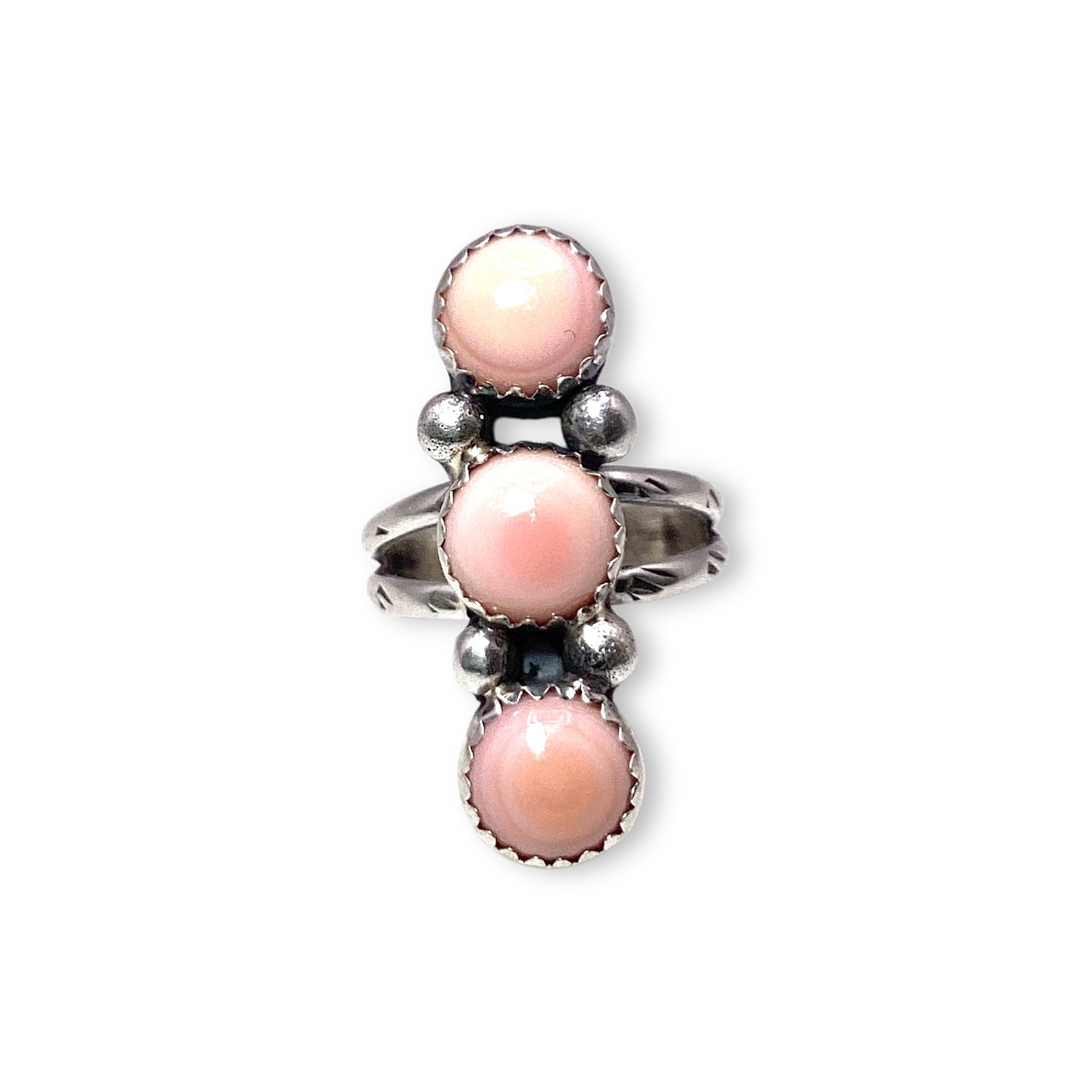 This chic row ring by Navajo artist Lyanne Goodluck is all about understated cool. Three soft pink conch shell stones are set in sterling silver sawtooth bezels, creating a fresh, modern take on classic Southwestern design.