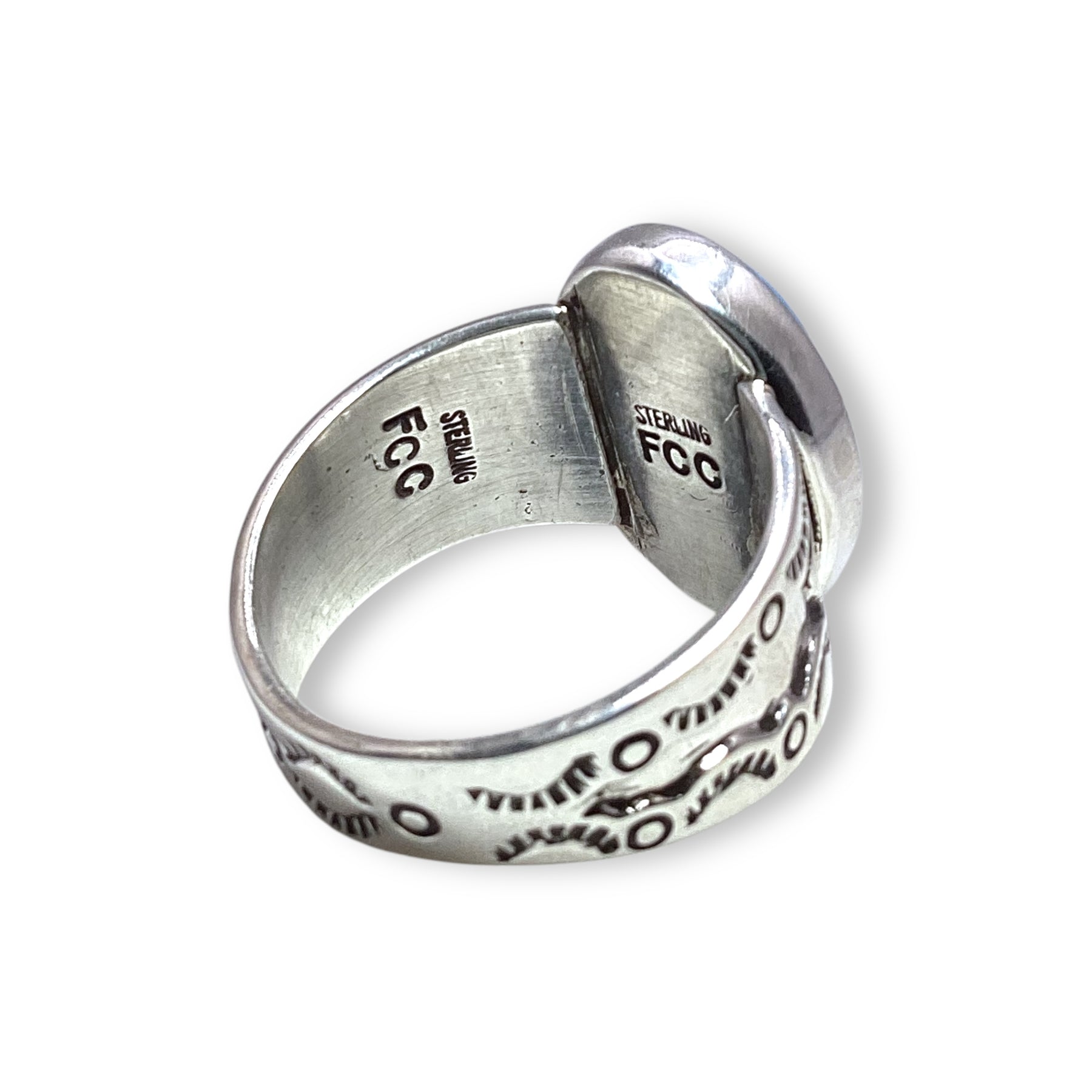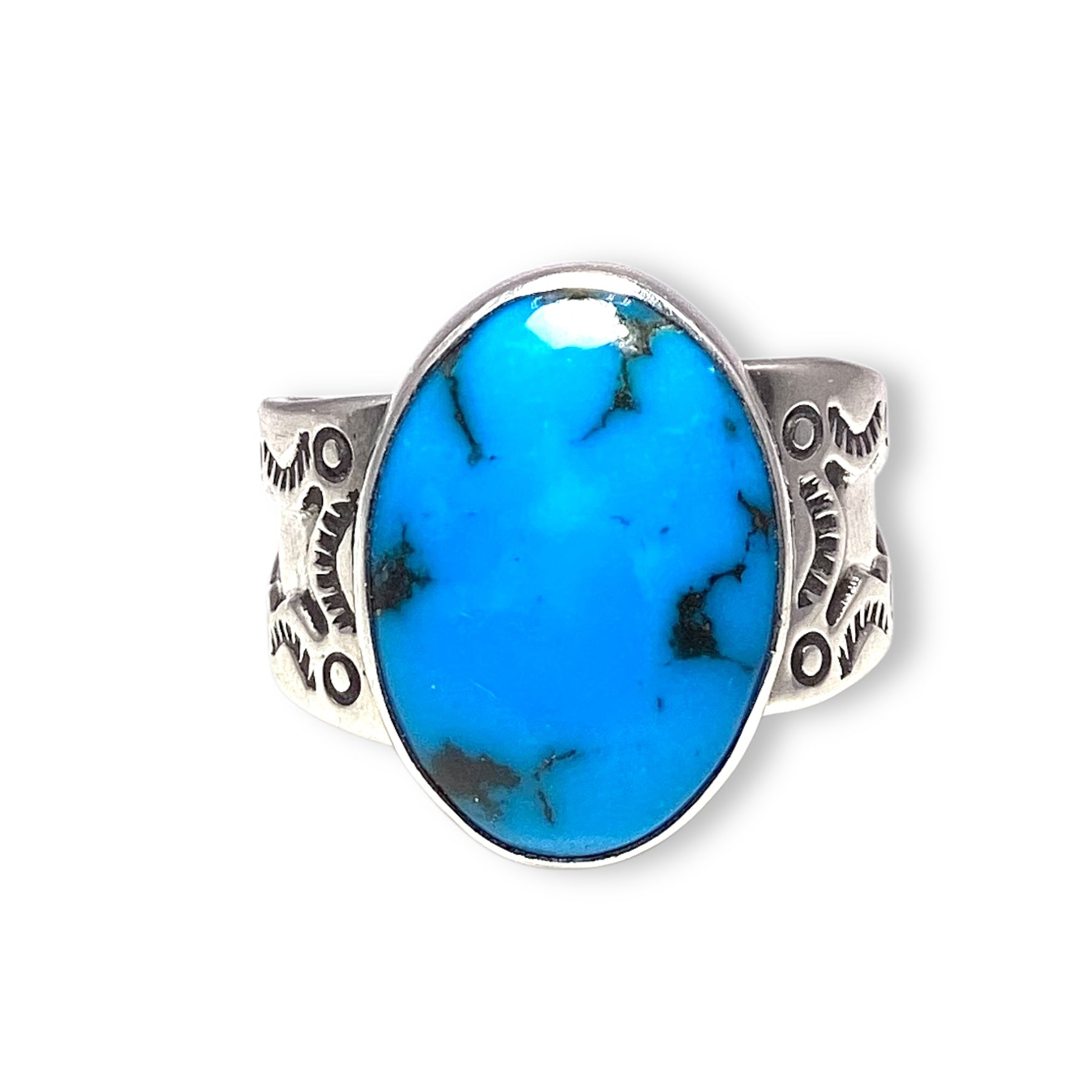Handcrafted by Navajo artist Franklin C. Crowther, son of Lyanne Goodluck, this playful ring features a bright oval turquoise stone set in a smooth bezel. The wide sterling silver band sparkles with fun Southwestern silverwork that’s full of personality.