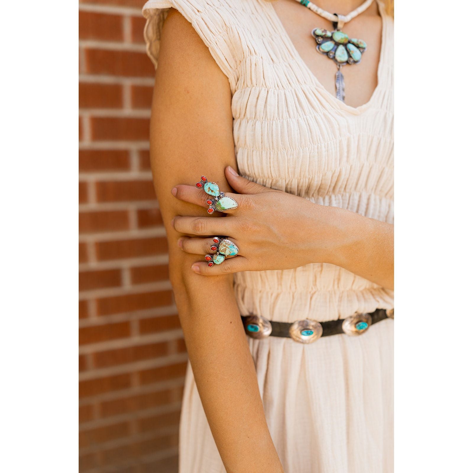 We love this design with a beautiful half blossom flower by Navajo artist Leigha Cleveland. Wear it like a pretty shield. It hugs just right.