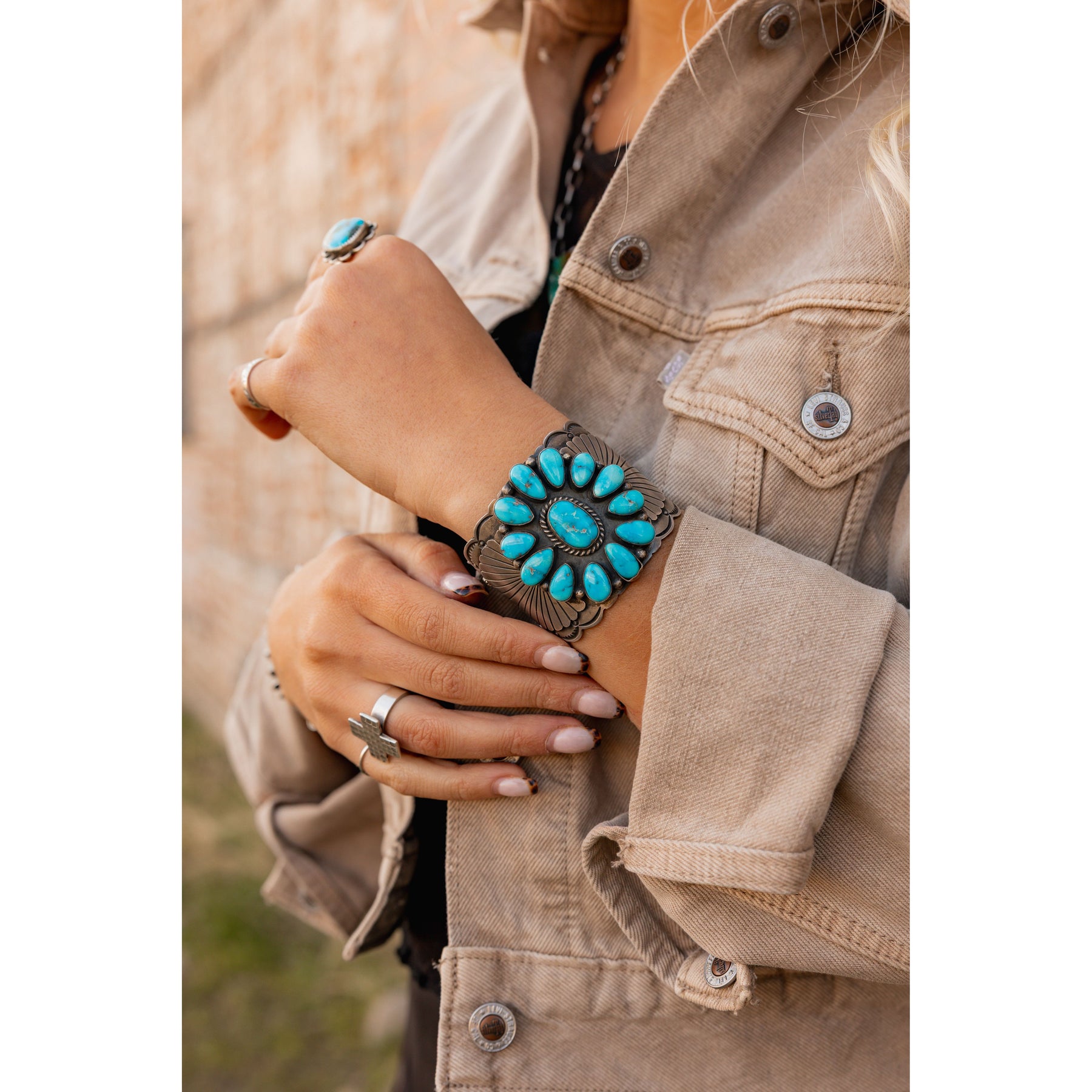 Amazing uncharted count-the-stars ⭐️ piece! This Heavy Weighted Rose Sonoran Gold is glossy high grade turquoise made by Native Artisan and master silversmith Ronald Tom