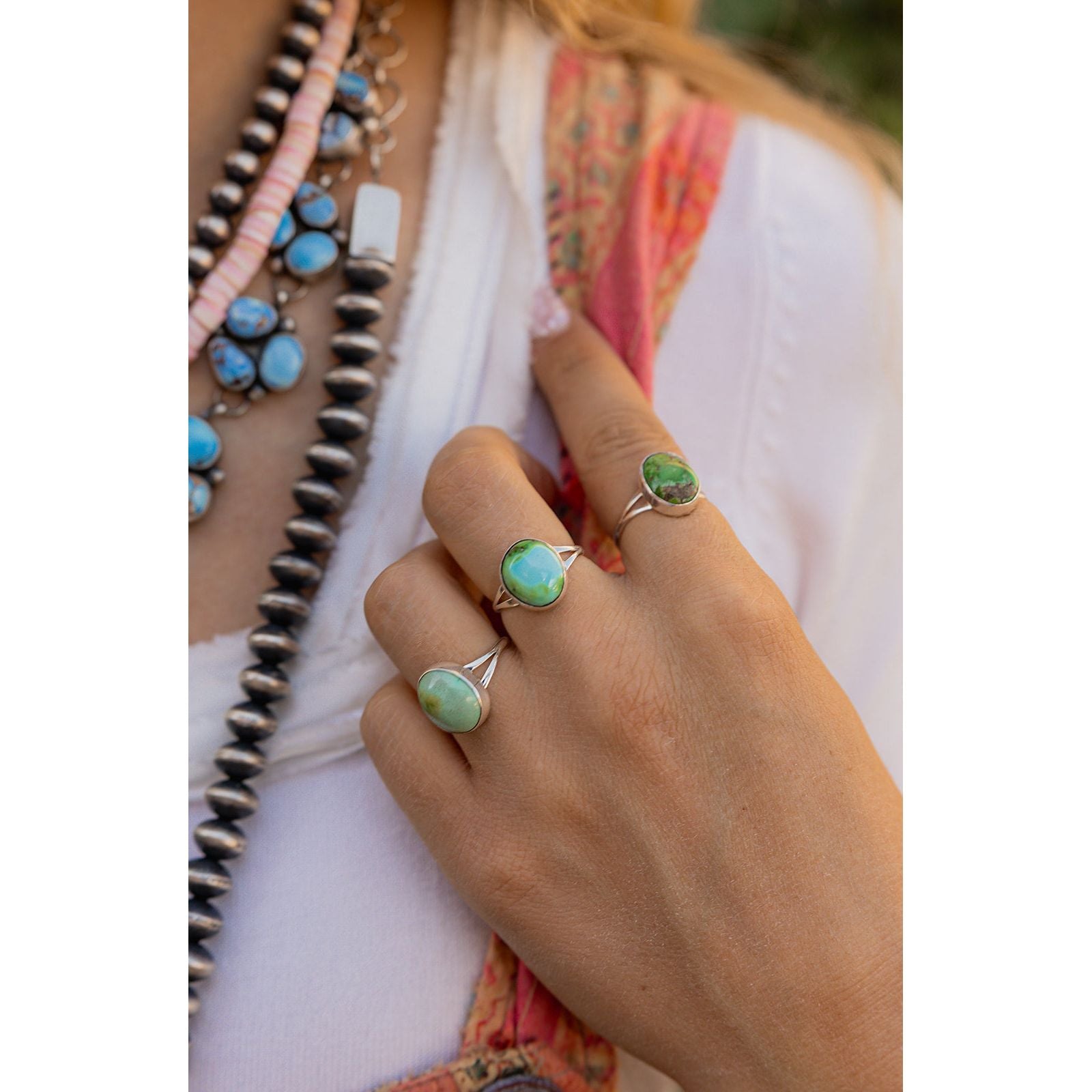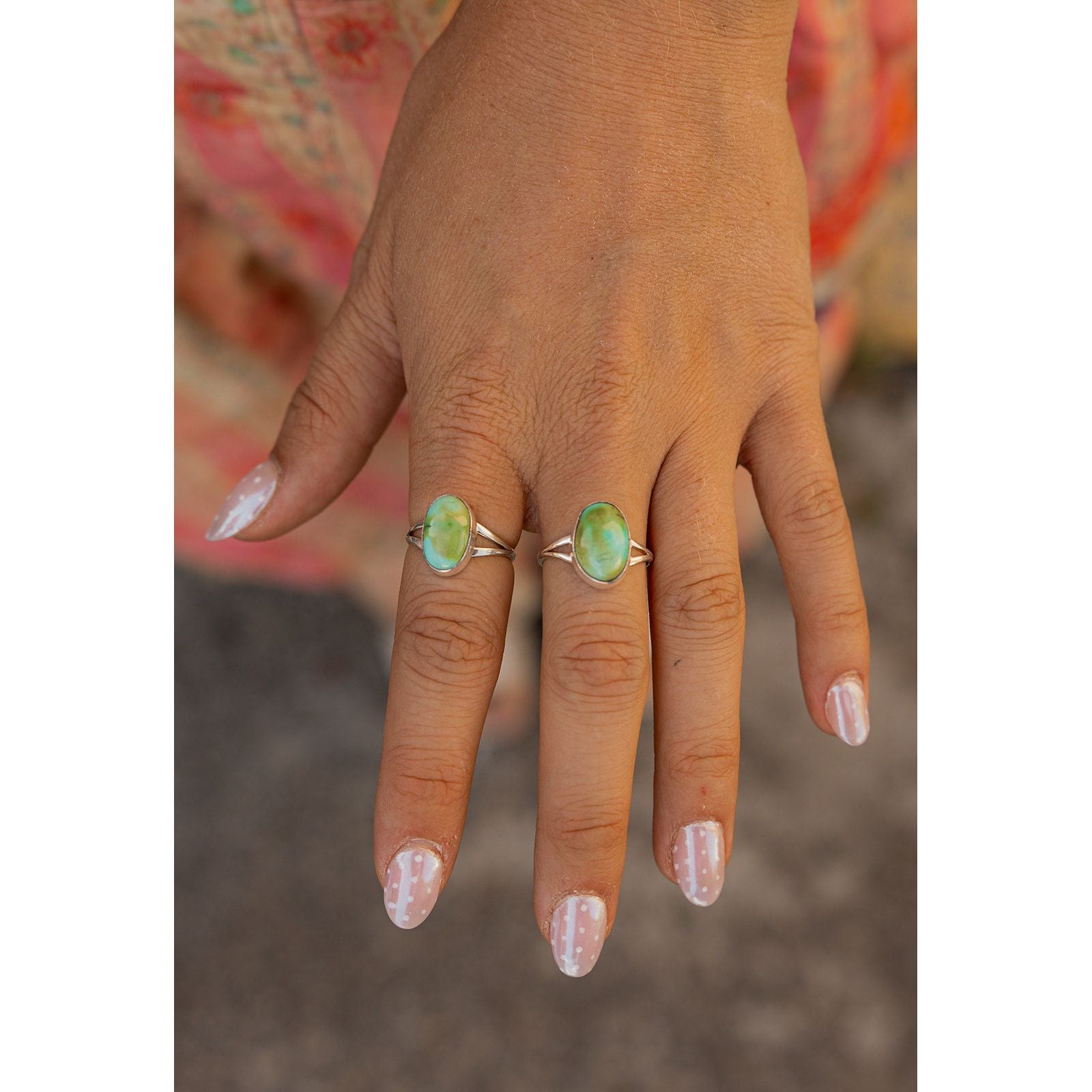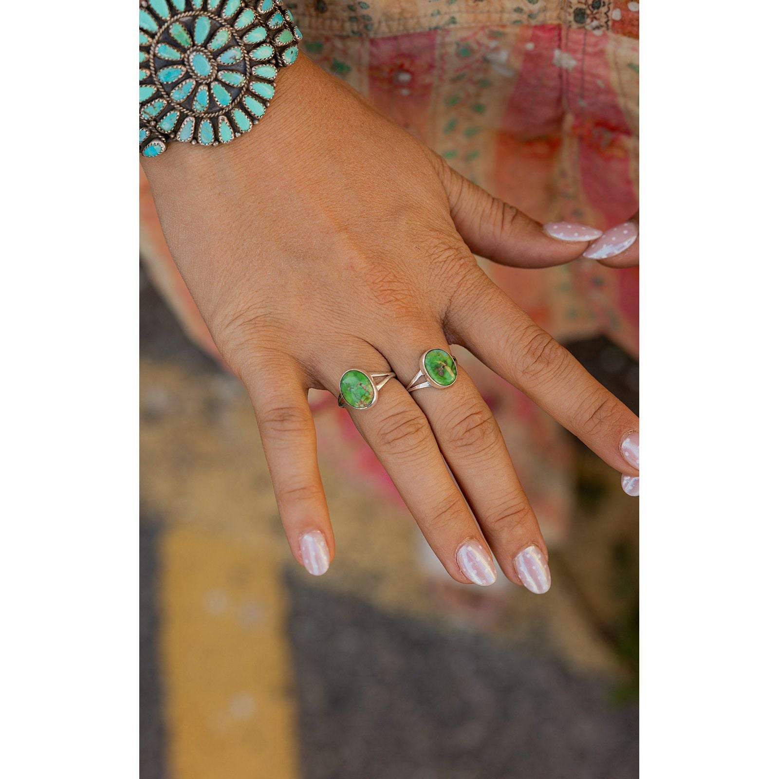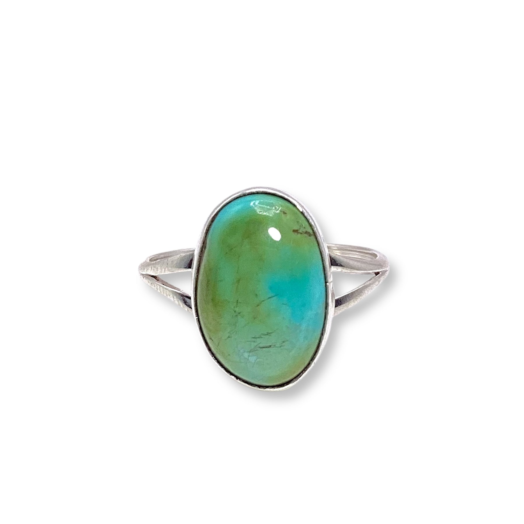 Handcrafted by Navajo artist Theresa Smith, this playful ring shows off a vibrant Sonoran Gold turquoise stone set in a smooth sterling silver bezel. It’s fresh, bold, and full of that free-spirited desert energy.