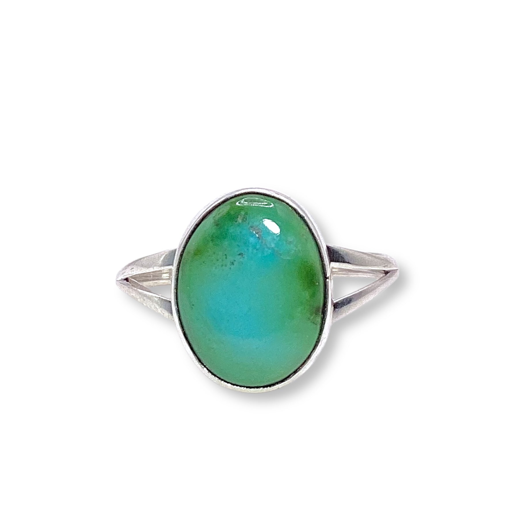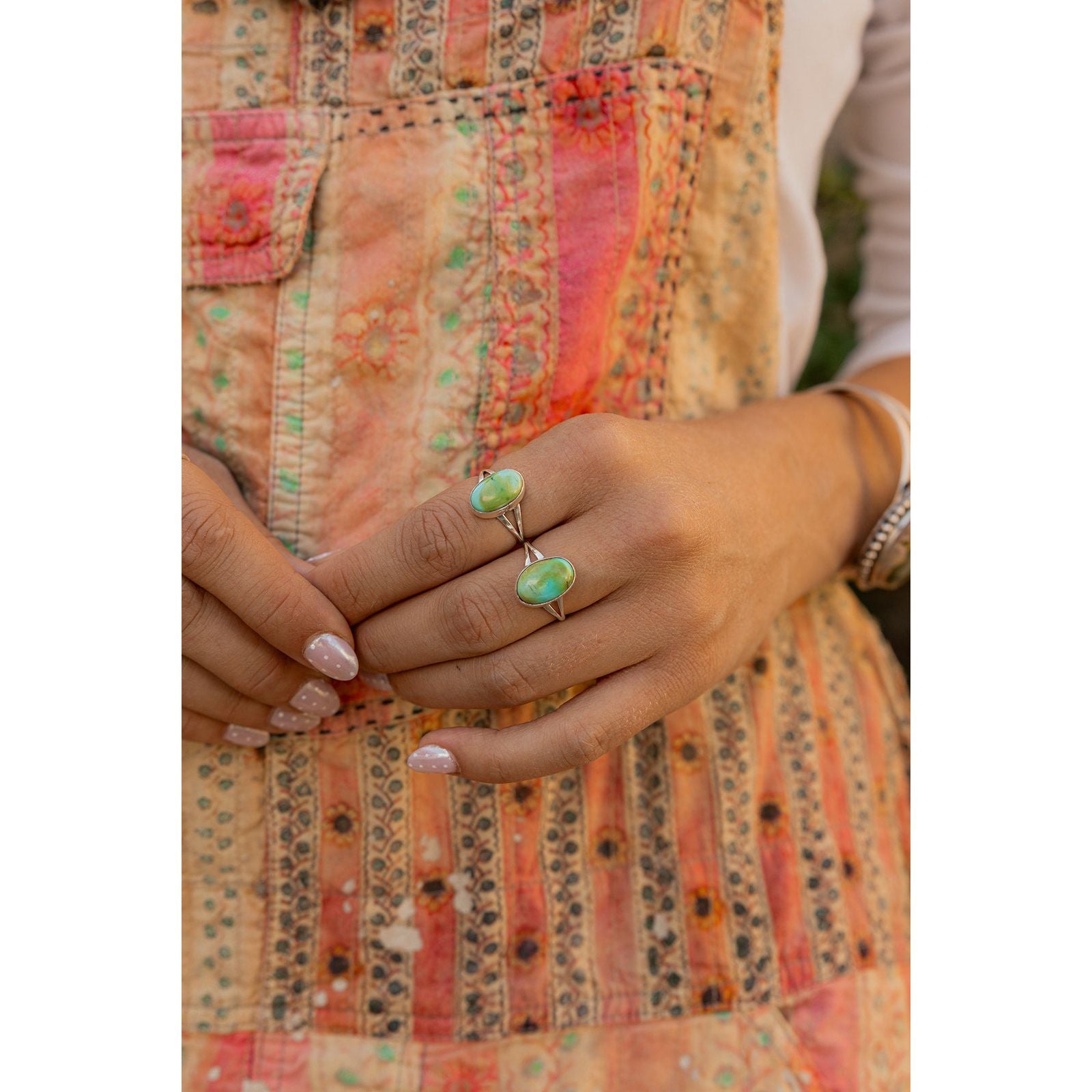 Handmade by Navajo artist Theresa Smith, this dreamy ring features a glowing Sonoran Gold turquoise stone wrapped in a smooth sterling silver bezel. A little earthy, a little bold — it’s that effortless Southwest vibe we’re always reaching for.