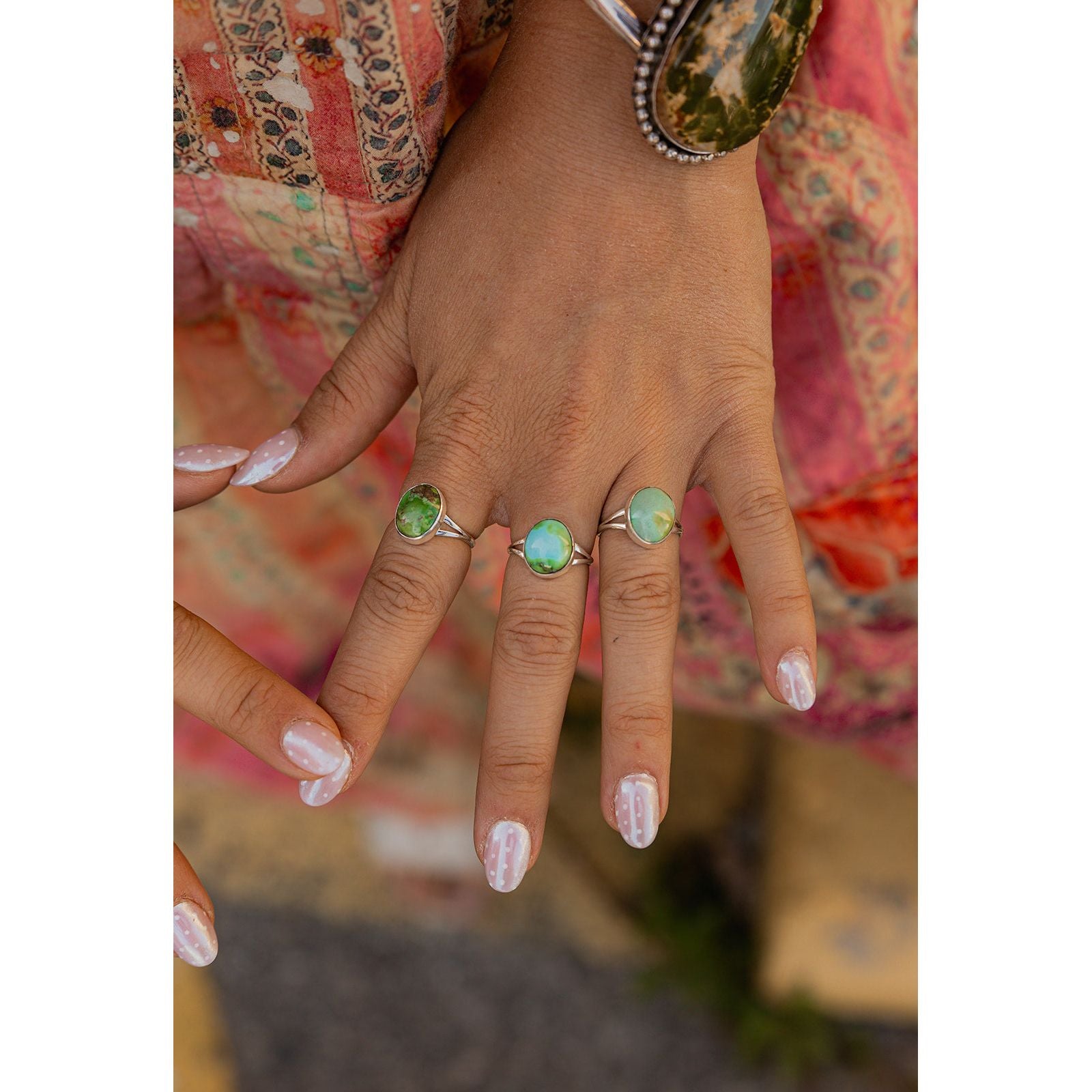 Handcrafted by Navajo artist Theresa Smith, this ring is a little piece of the desert to carry with you—Sonoran Gold turquoise shines in a smooth sterling silver bezel, soft golden-green hues that feel warm and gentle.