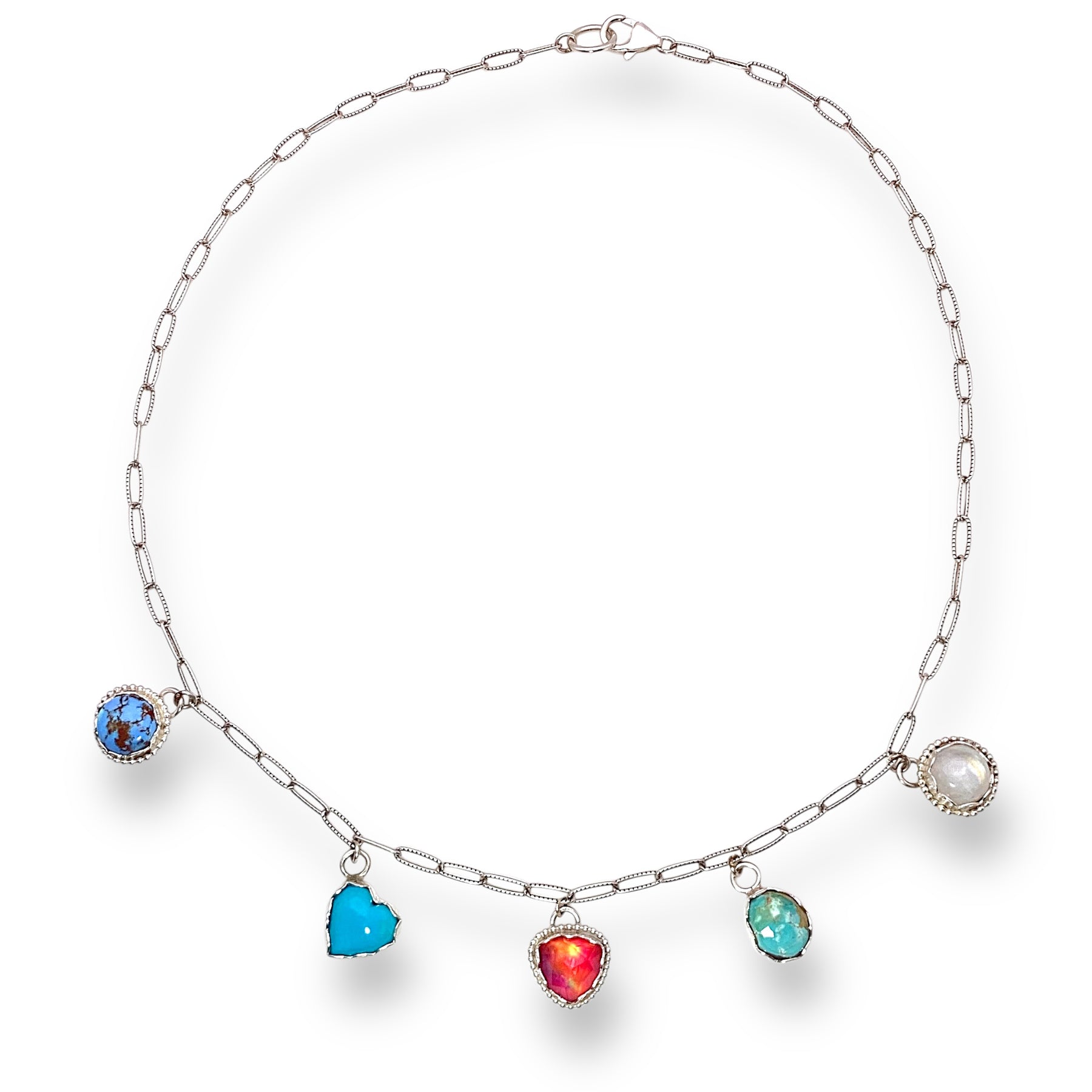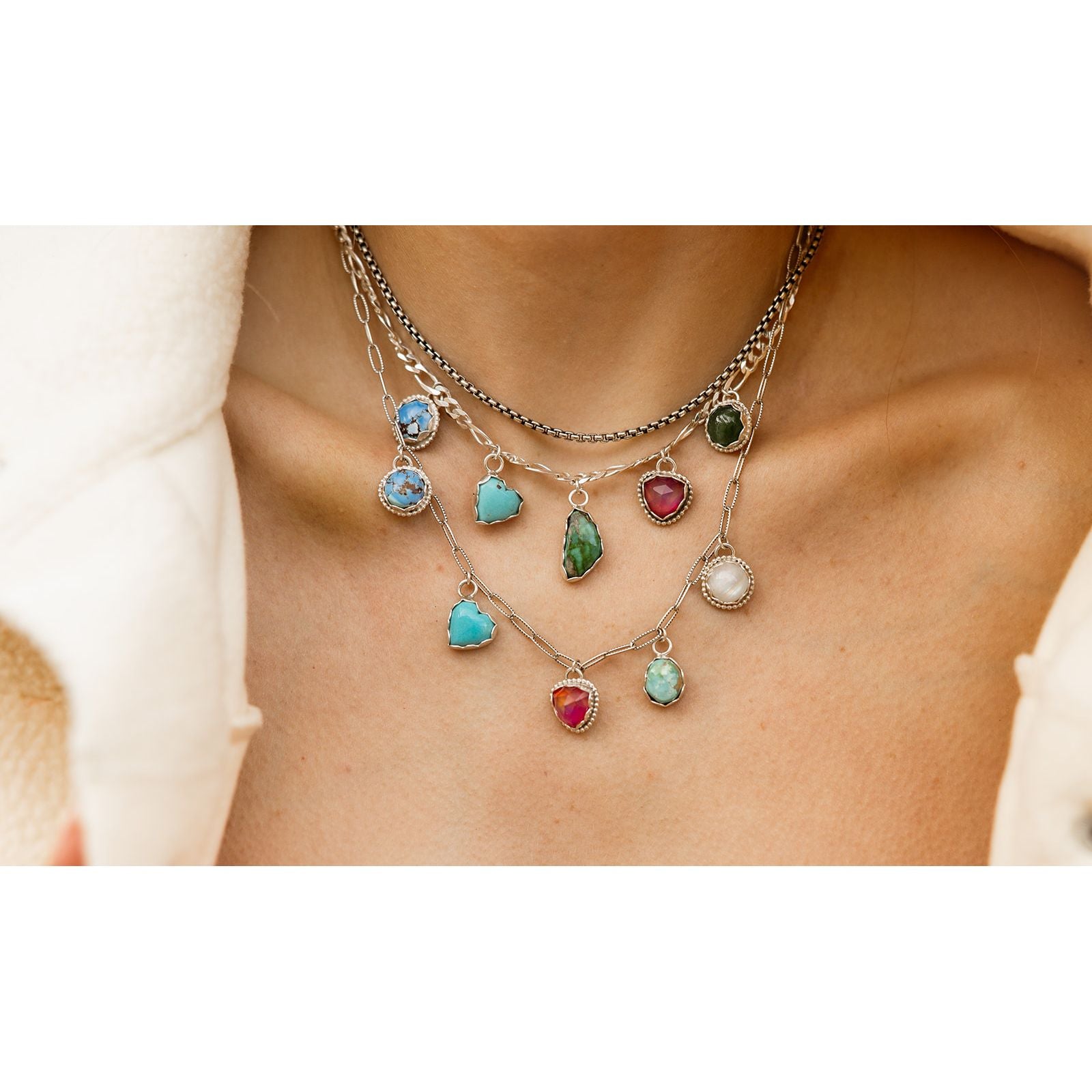 Why We 🖤: This necklace is one of a kind and absolutely magical with pink tourmaline stone, Royston turquoise, Blue Golden Hills turquoise, moonstone, and other hand set stones that truly jingle jangle in the most lovely of ways. ❤️