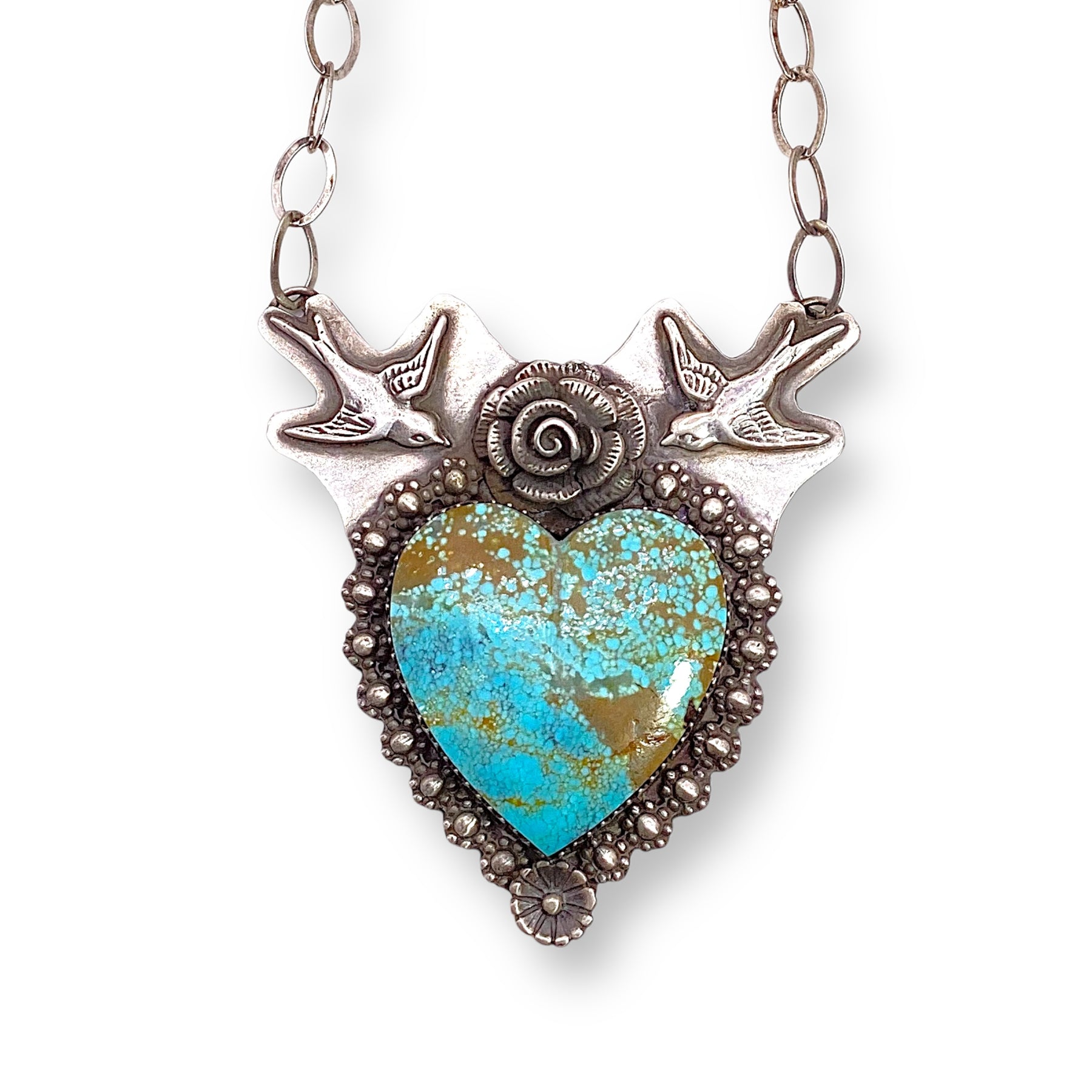 Silversmith, Vanessa Waltz, has designed a beautiful heart shaped pendant of Kingman Turquoise, surrounded by delicate silver work, with a rose at the center and swooping swallows.