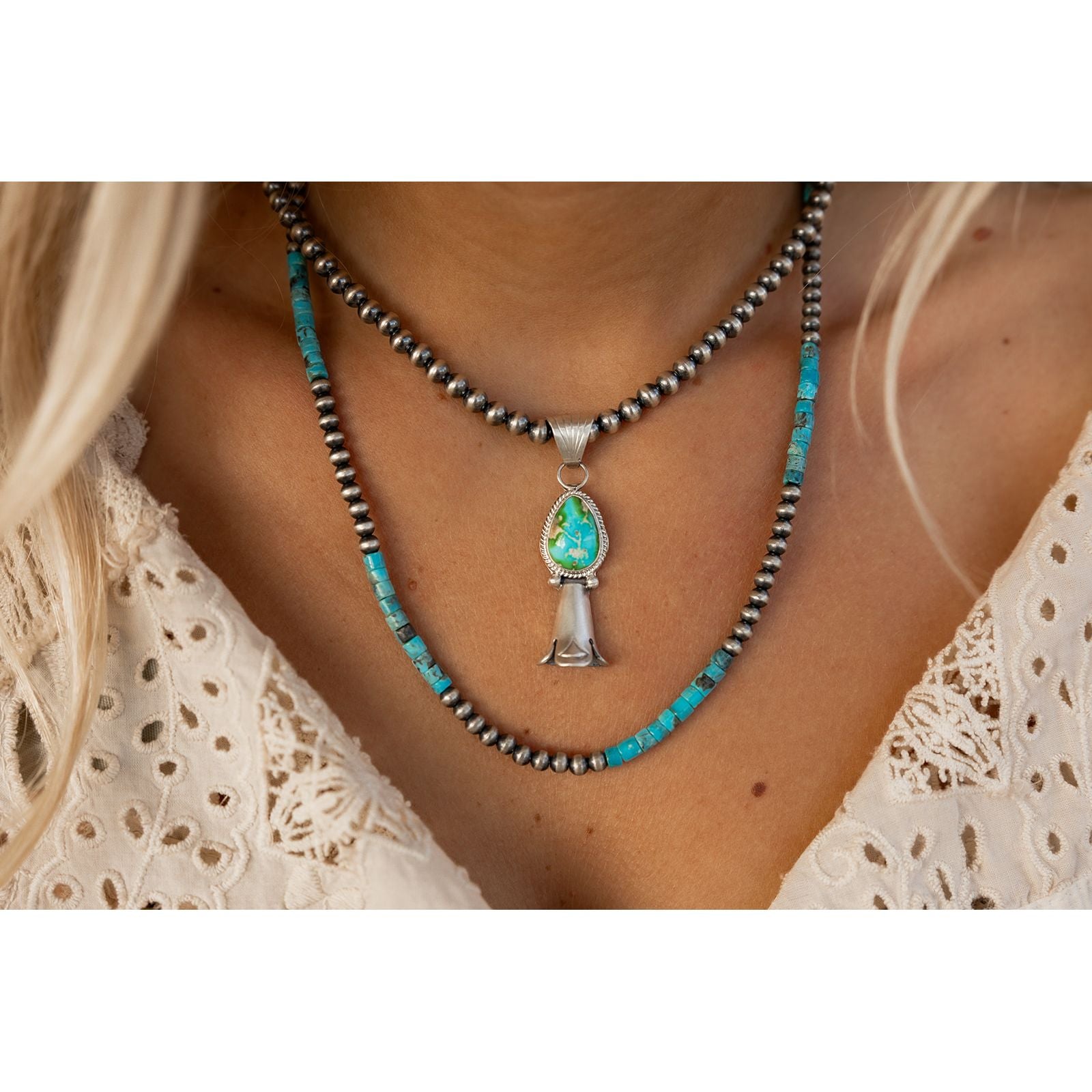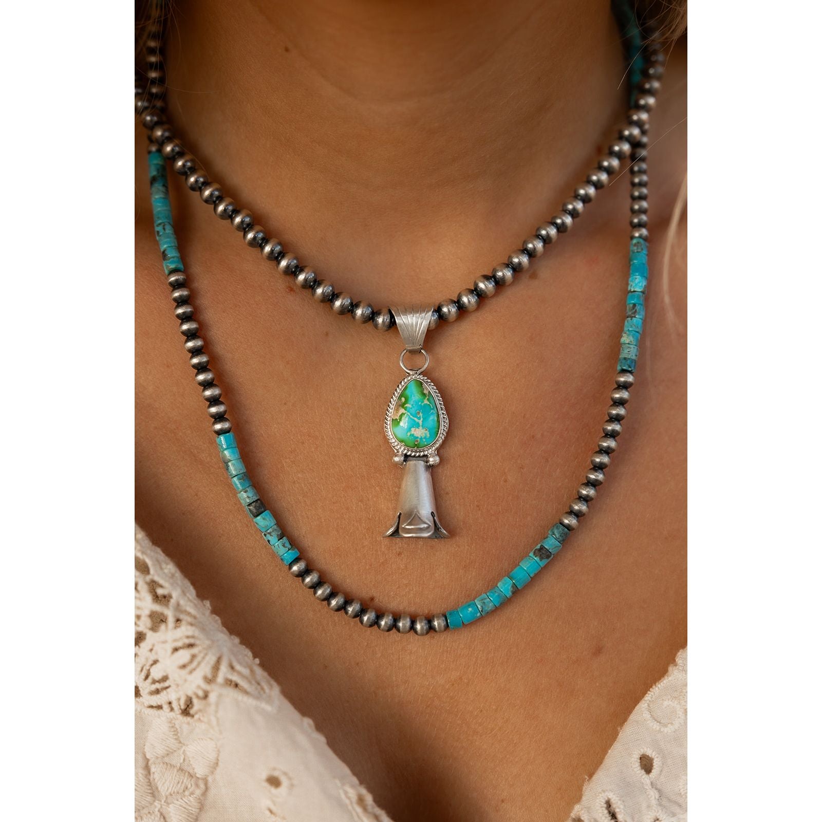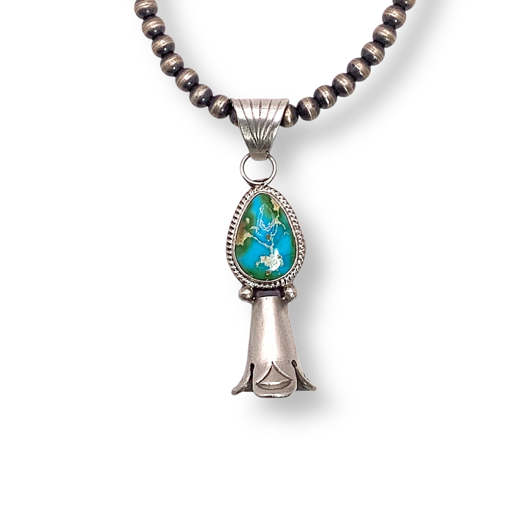 Classic and timeless, this Sonoran Gold Turquoise squash pendant by Navajo artist Sam Yellowhair is set in smooth sterling silver with delicate silver detailing. A refined piece that honors traditional Southwestern craftsmanship.