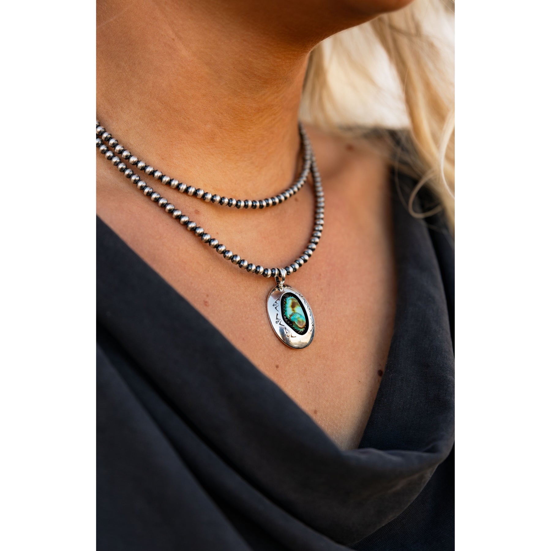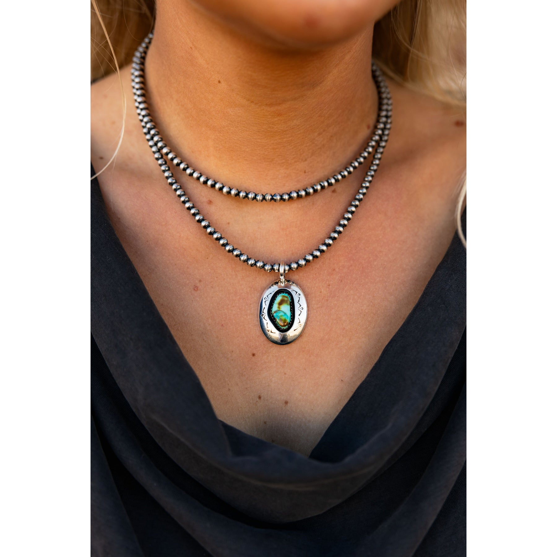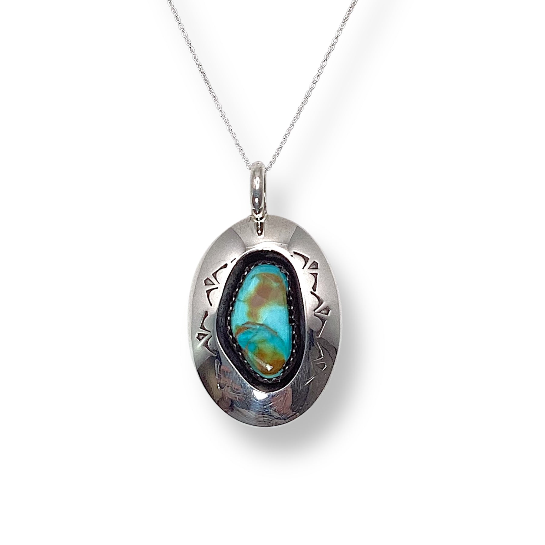 Expertly handcrafted by Navajo artist Lyanne Goodluck, this pendant features a radiant Royston turquoise stone set in a refined sawtooth bezel, surrounded by a shadowbox sterling silver frame with delicate Southwestern detailing. Each curve and line celebrates timeless craftsmanship, making it a truly one-of-a-kind treasure.