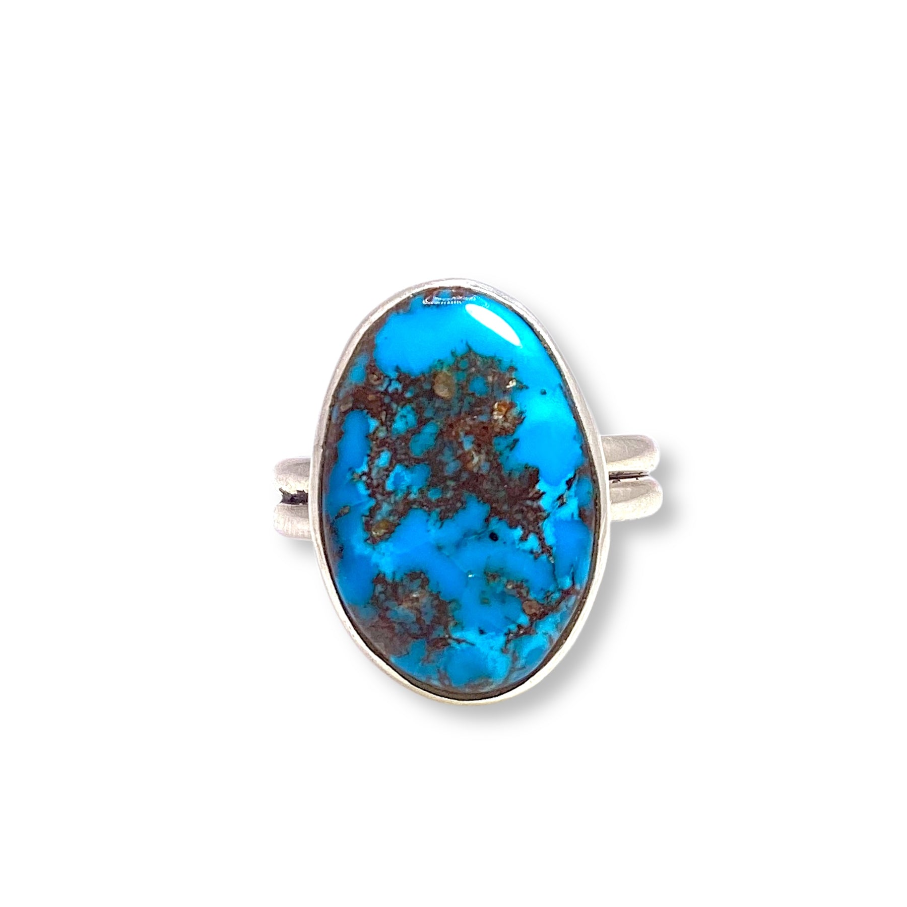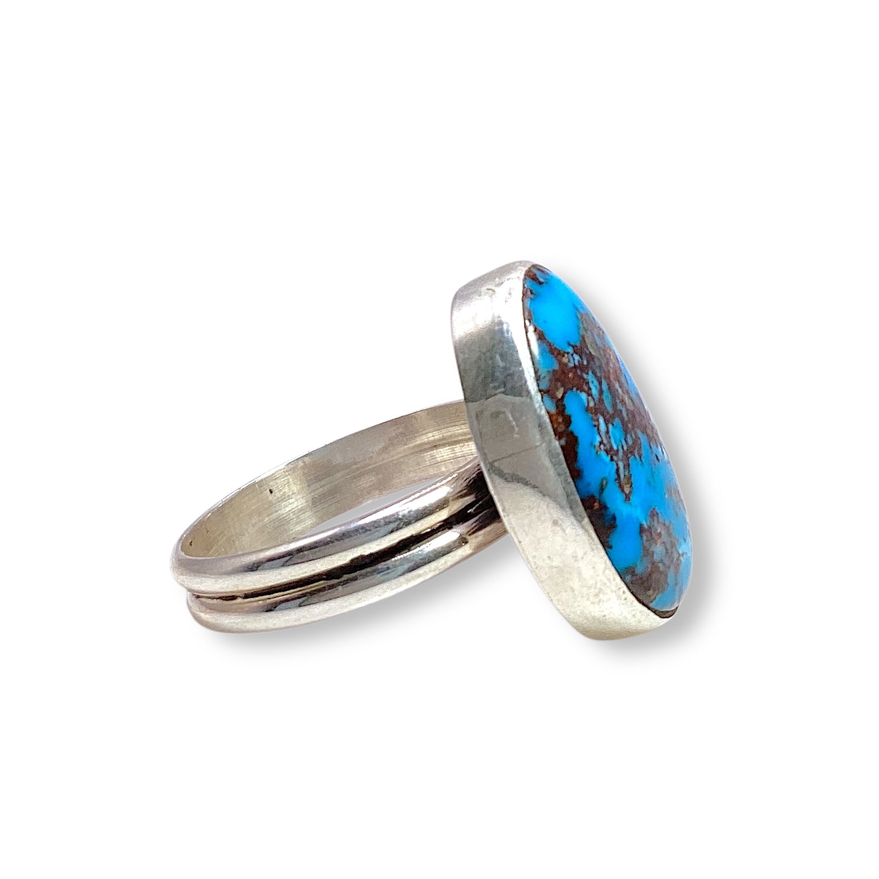 Handcrafted by Navajo artist Daniel Medina, this sterling silver ring features a vibrant blue turquoise stone set in a smooth bezel on a sleek double band.
