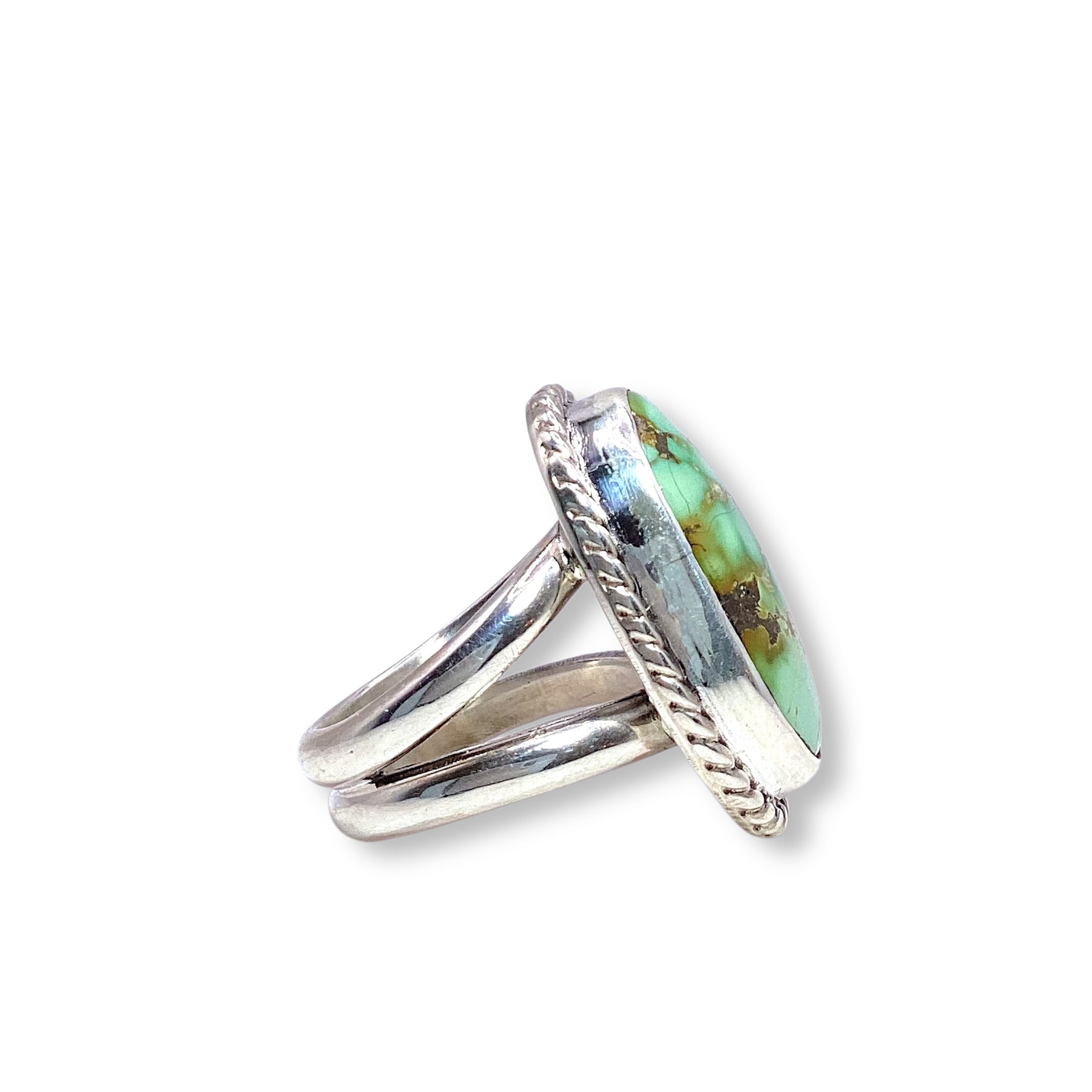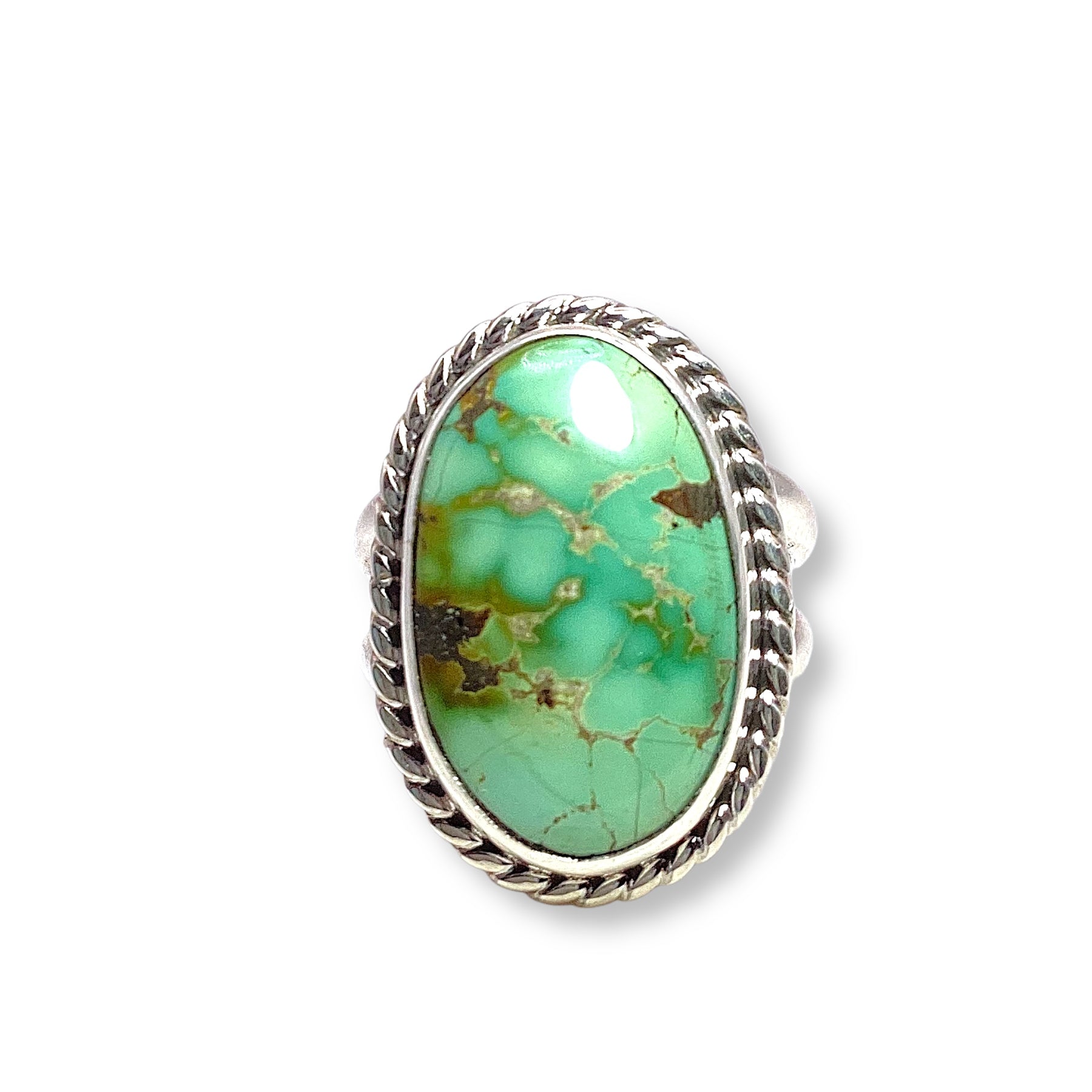 Handcrafted by Navajo artist Daniel Medina, this sterling silver ring features a vibrant turquoise stone set in a smooth bezel, finished with delicate rope detailing.