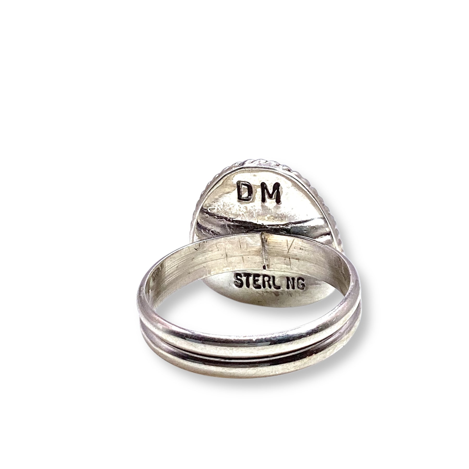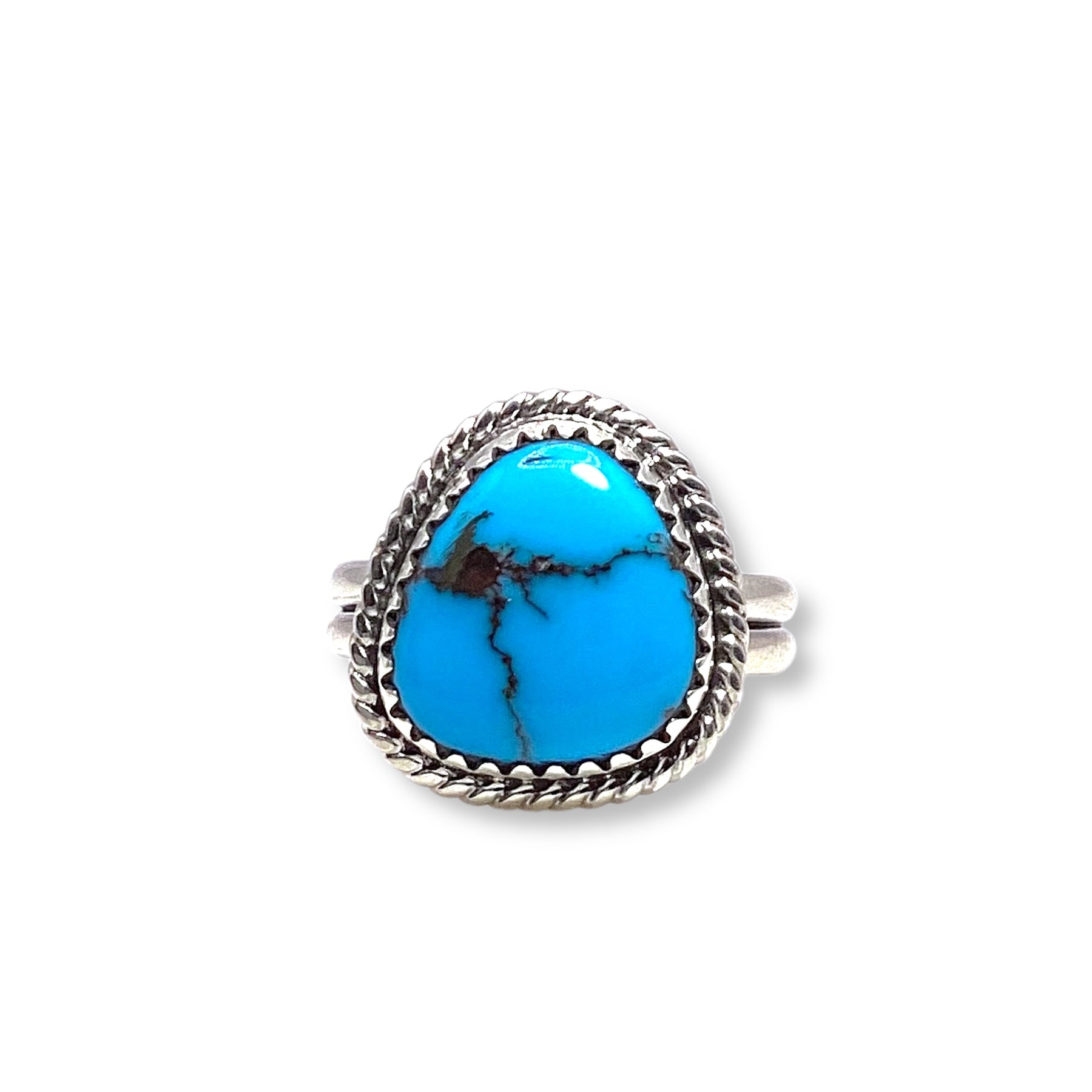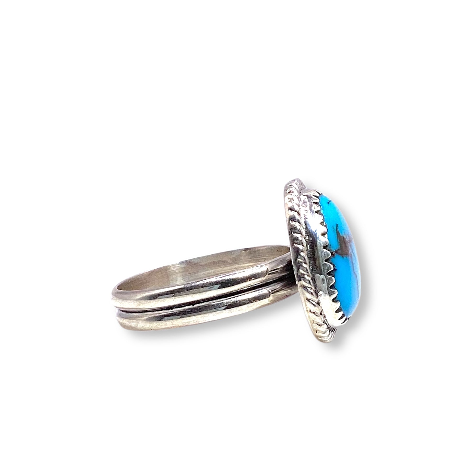 A stunning piece by Navajo artist Daniel Medina, this ring showcases a vibrant turquoise stone set in a scalloped sterling silver bezel, finished with classic rope detailing for that true Southwestern touch.