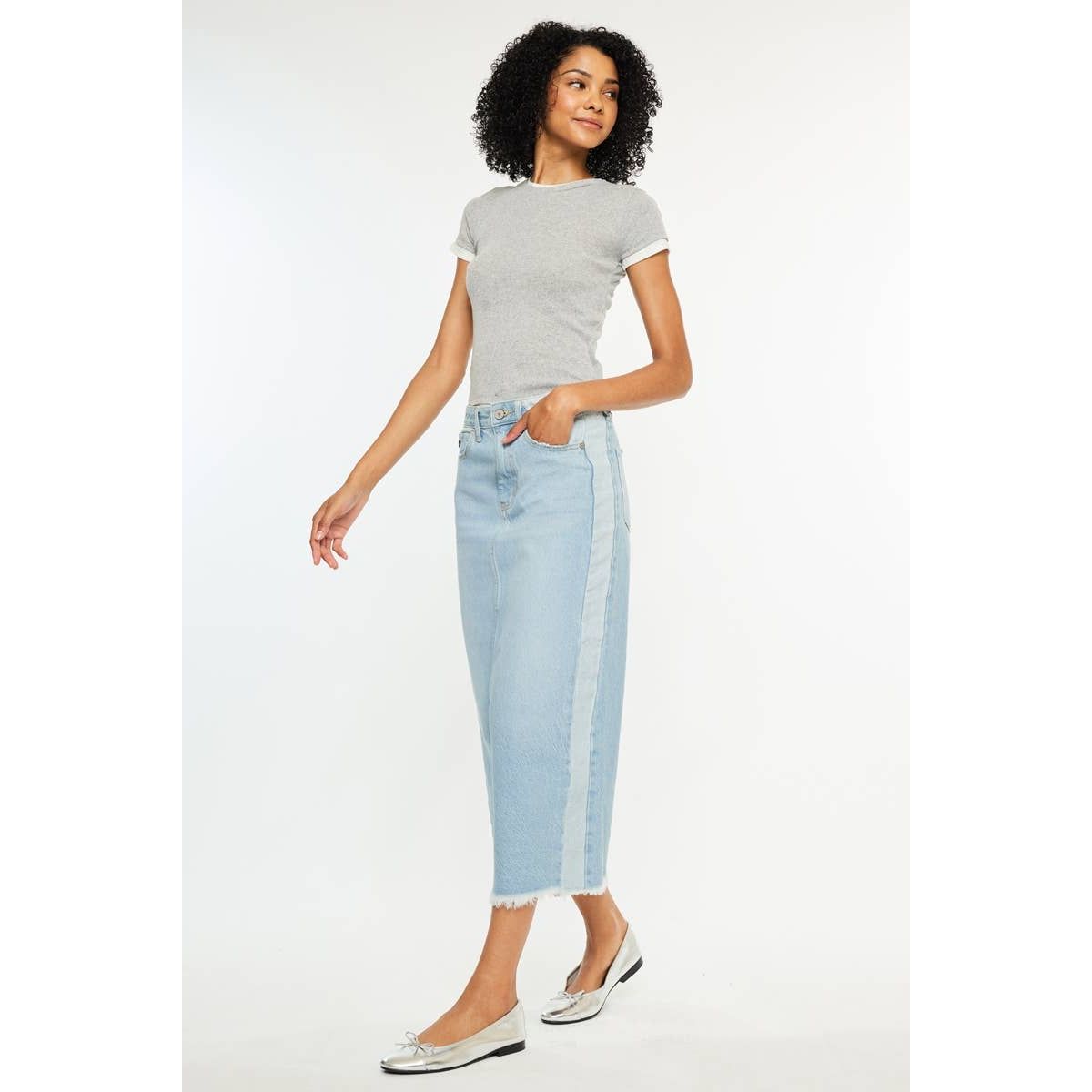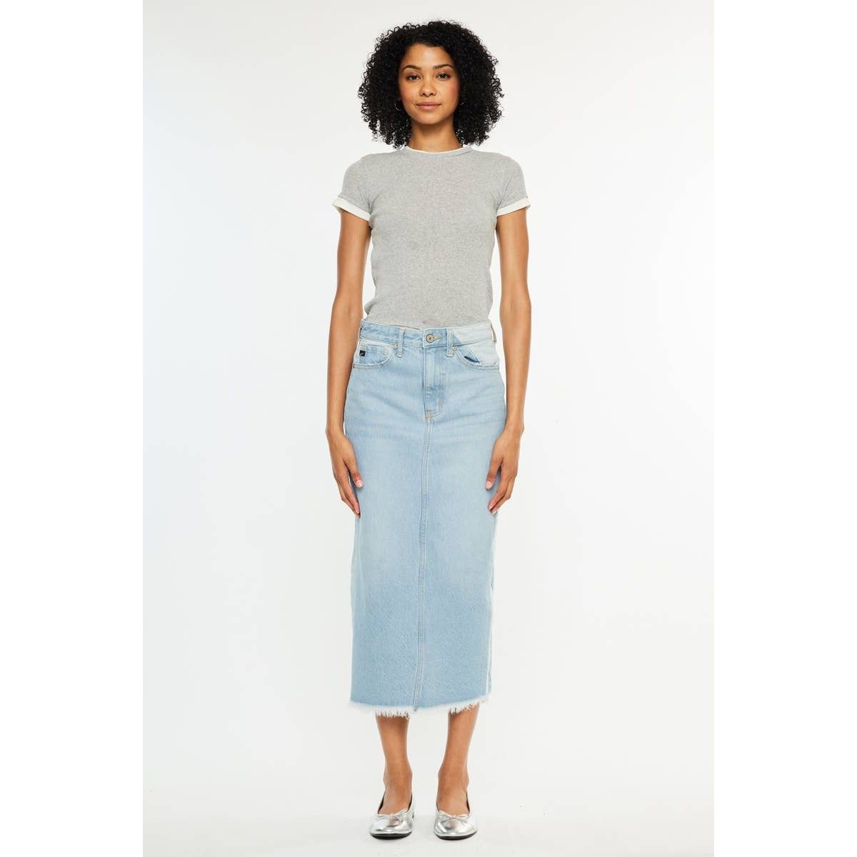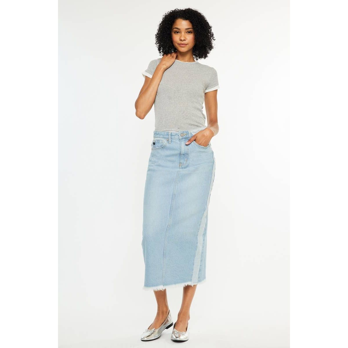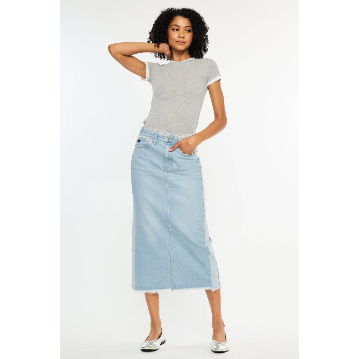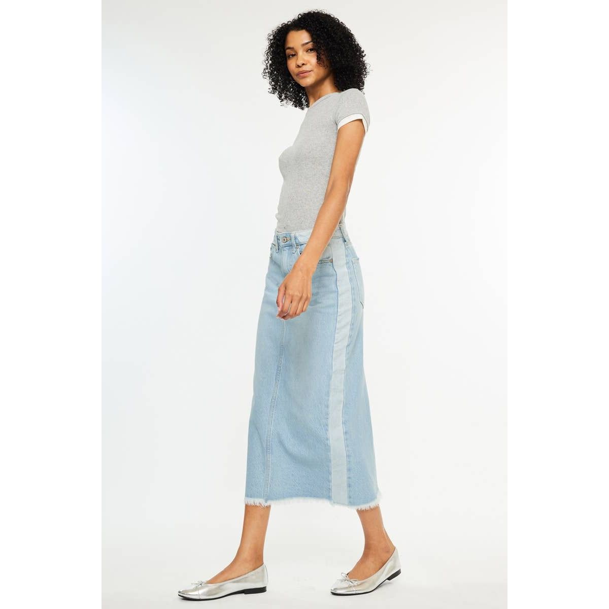 MIDI ZIP FLY DENIM SKIRTS LIGHT WASH RIGID HIGH RISE DENIM SKIRT CONTRAST PANEL MIDI DENIM SKIRT CF 33” WAIST BAND 1 1/2” IN SIZE 5/26 100% COTTON