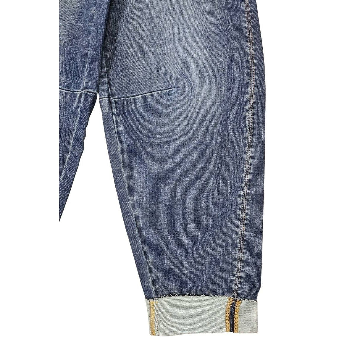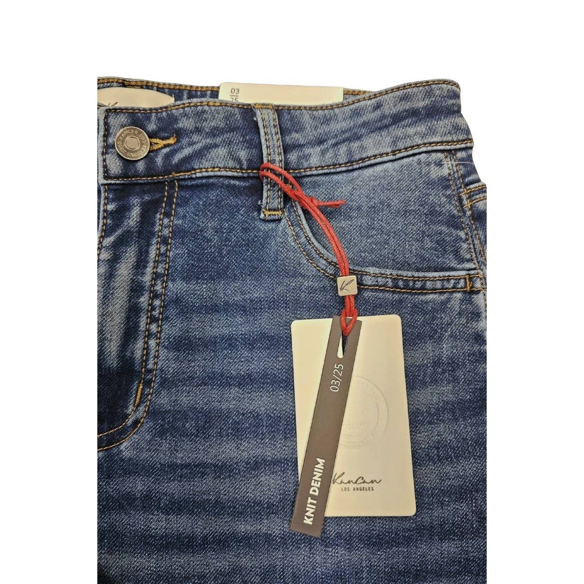 order and call with size request. KNIT DENIM LOW SLUNG HORSESHOE OPEN PACK MEDIUM LIGHT STONE WASH COMFORT STRETCH KNIT DENIM KNEE DART ZIPPER FLY TWIST SEAM AT FRONT 2" SINGLE CUFFD HEM NONE DISTRESSED RISE: 11" INSEAM: 34" IN SIZE 5/26 74% COTTON, 23% POLYESTER, 2% RAYON, 1% SPANDEX 11.5 OZ